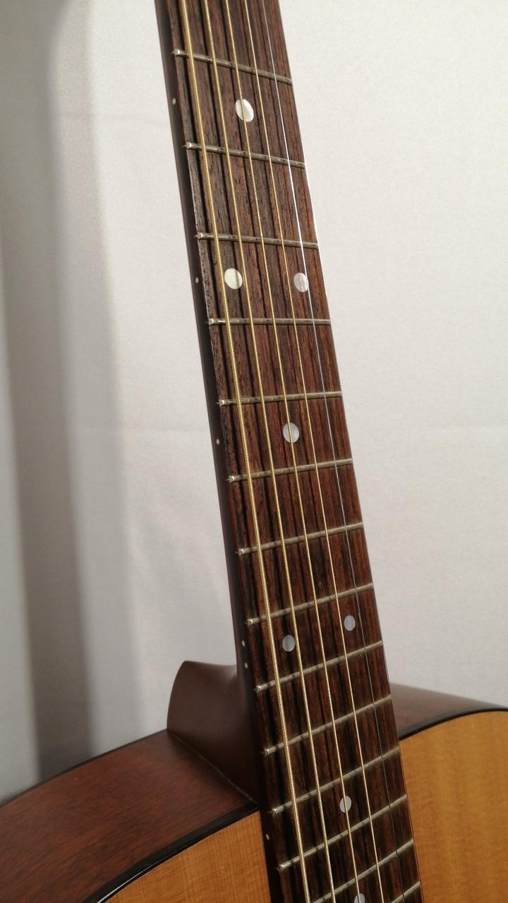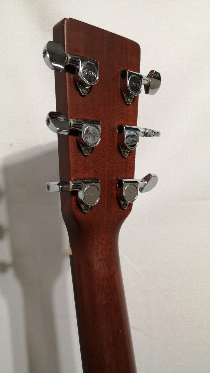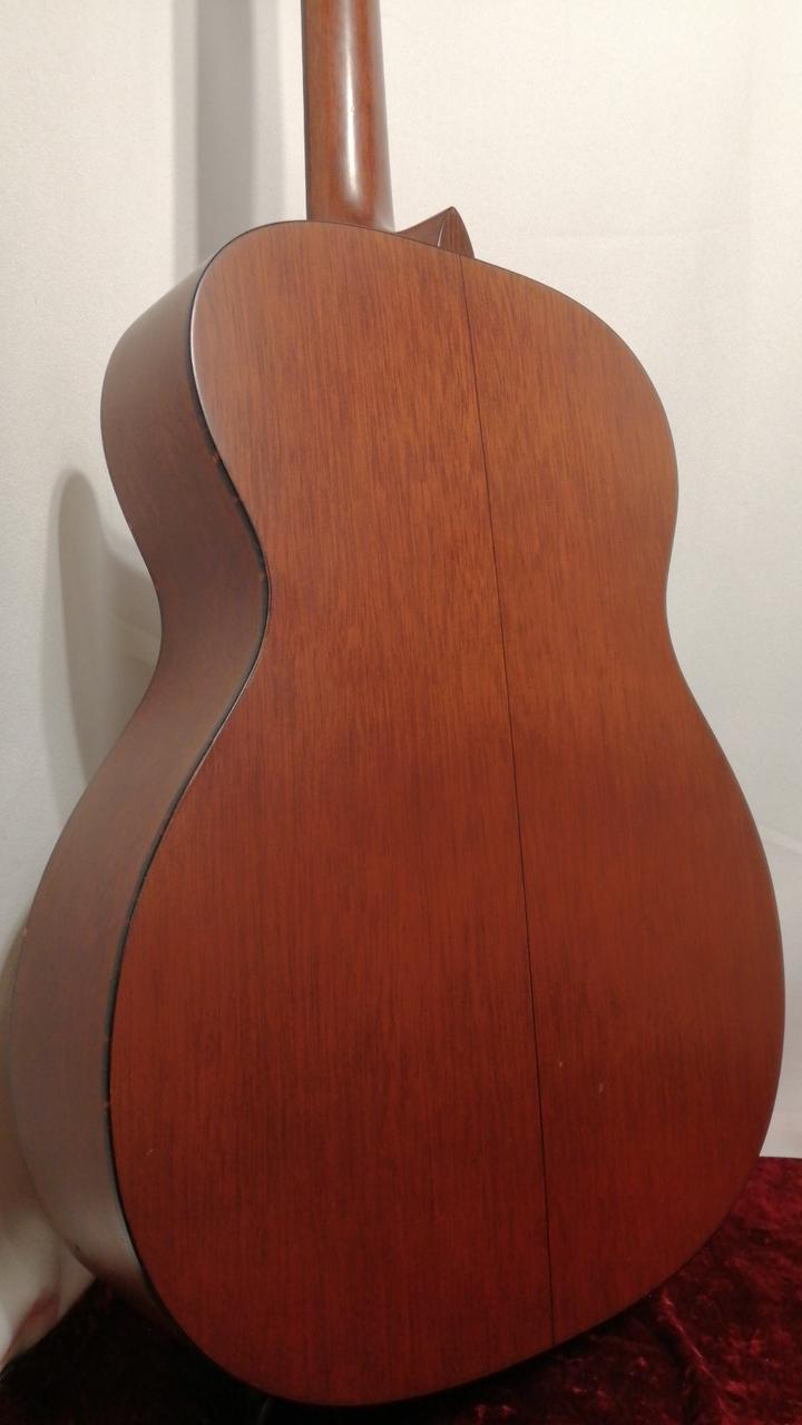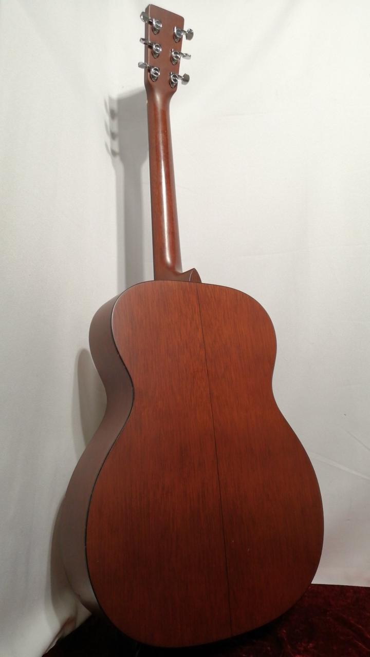 サイドバックにマホガ二―を採用し、ルックスは000-18と同じですが、弦長が645mmと000より長いOMスタイルを採用。 |