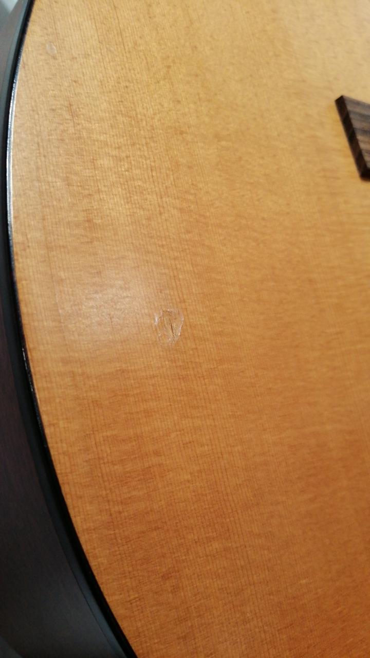 ボディトップ右手でちょうど隠れるあたりに打痕と、僅かですがヒビがあります。現状サドル高めなので、調整してお好み高さにして頂くと良いかと思います。 |