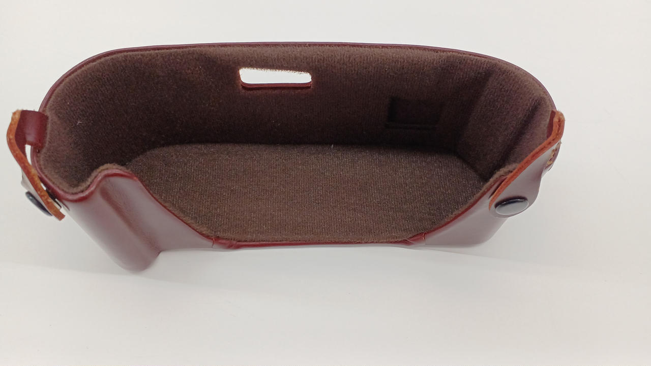 F3HP(ハイアイポイント)に合わせて、上部ケースの高さに少し余裕を持たせた設計の本革製カメラケース。 |