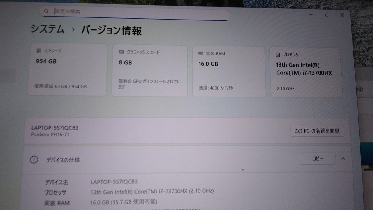 Corei7-13700HX 2.10GHz/メモリ16GB/SSD1TB |