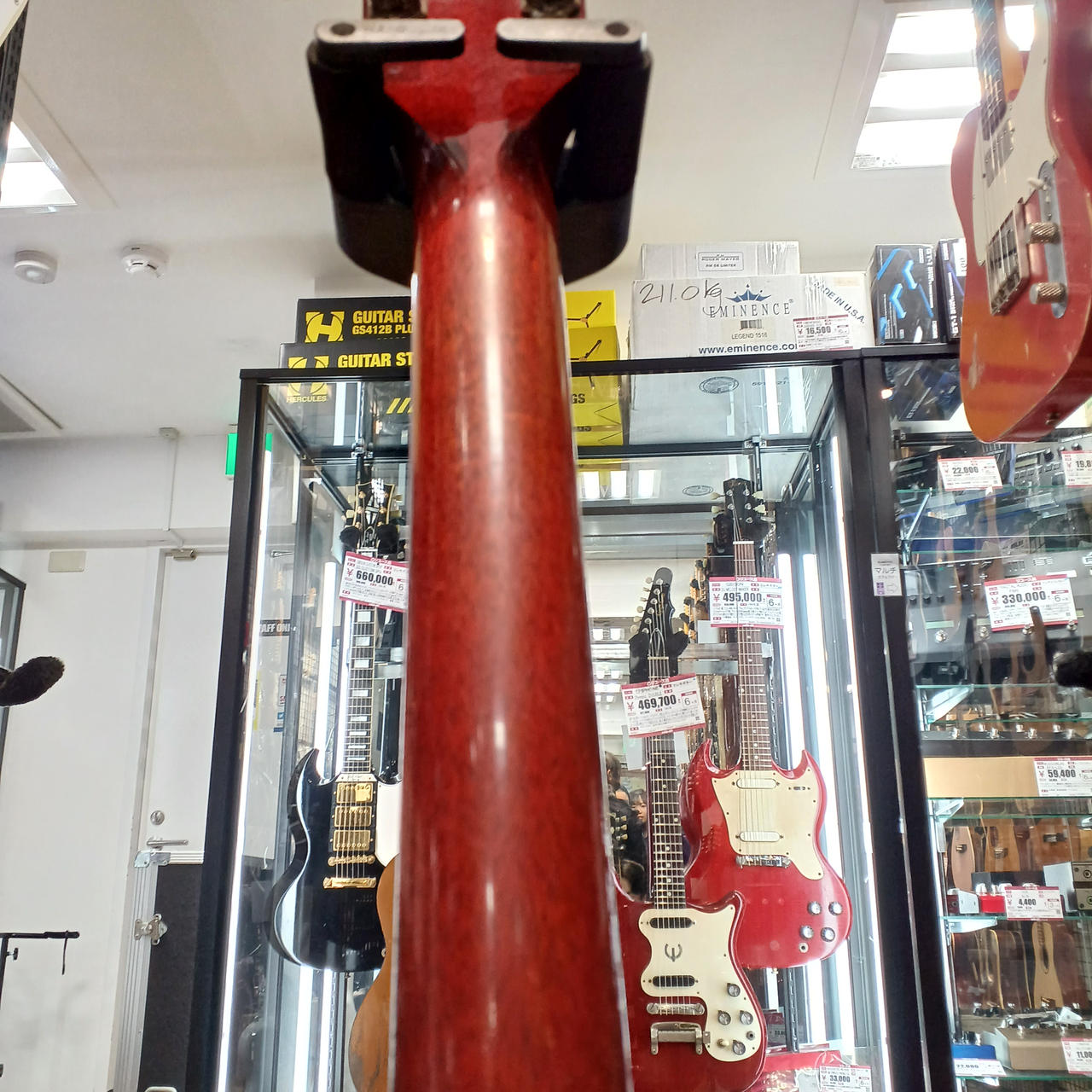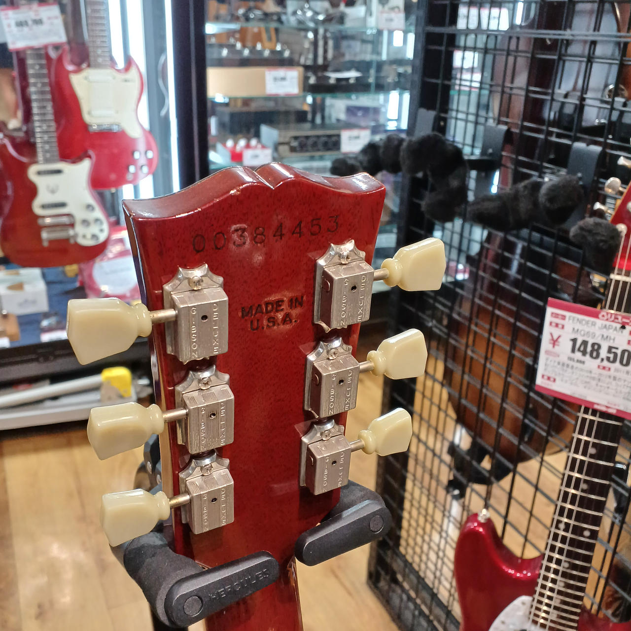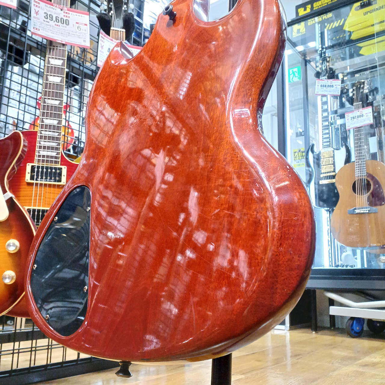 ラージピックガードの'60年代後期のスタイルを踏襲し、シンプルなストップテールピース仕様、定番のチェリー・フィニッシュを採用しています。 |