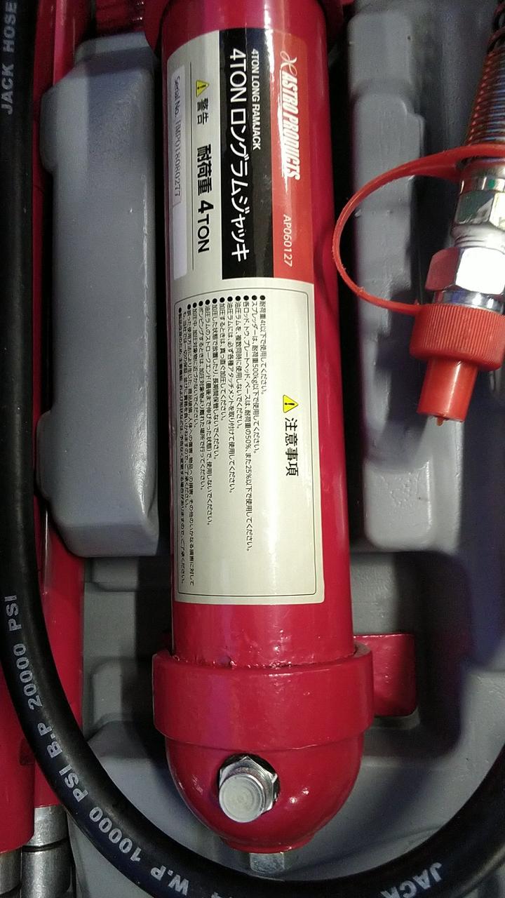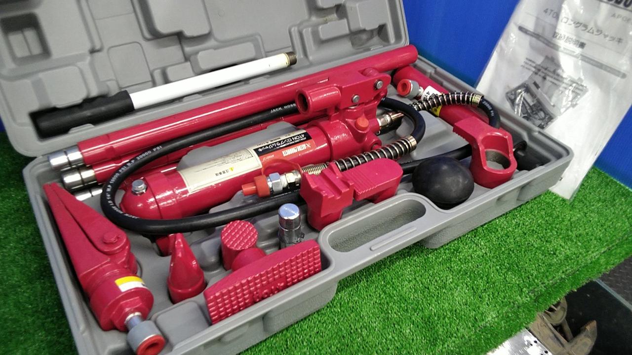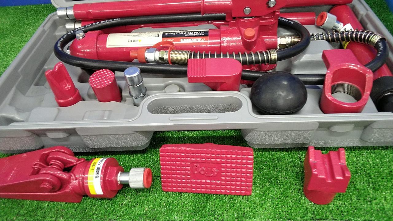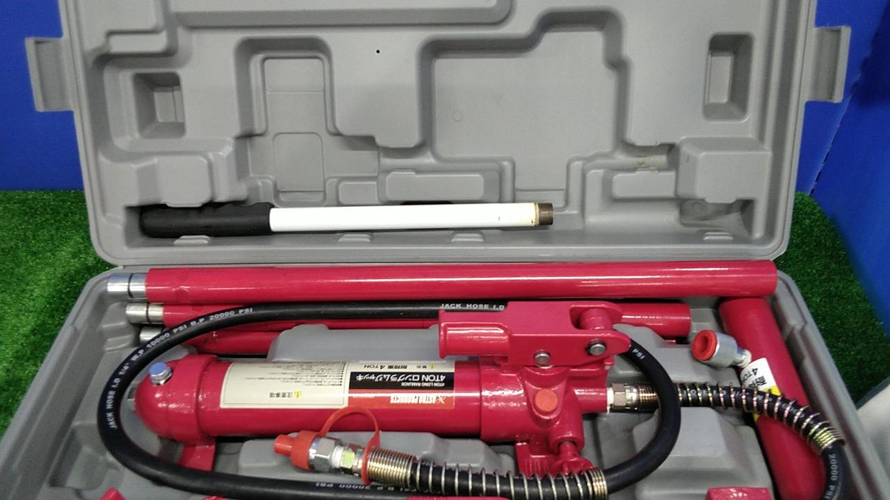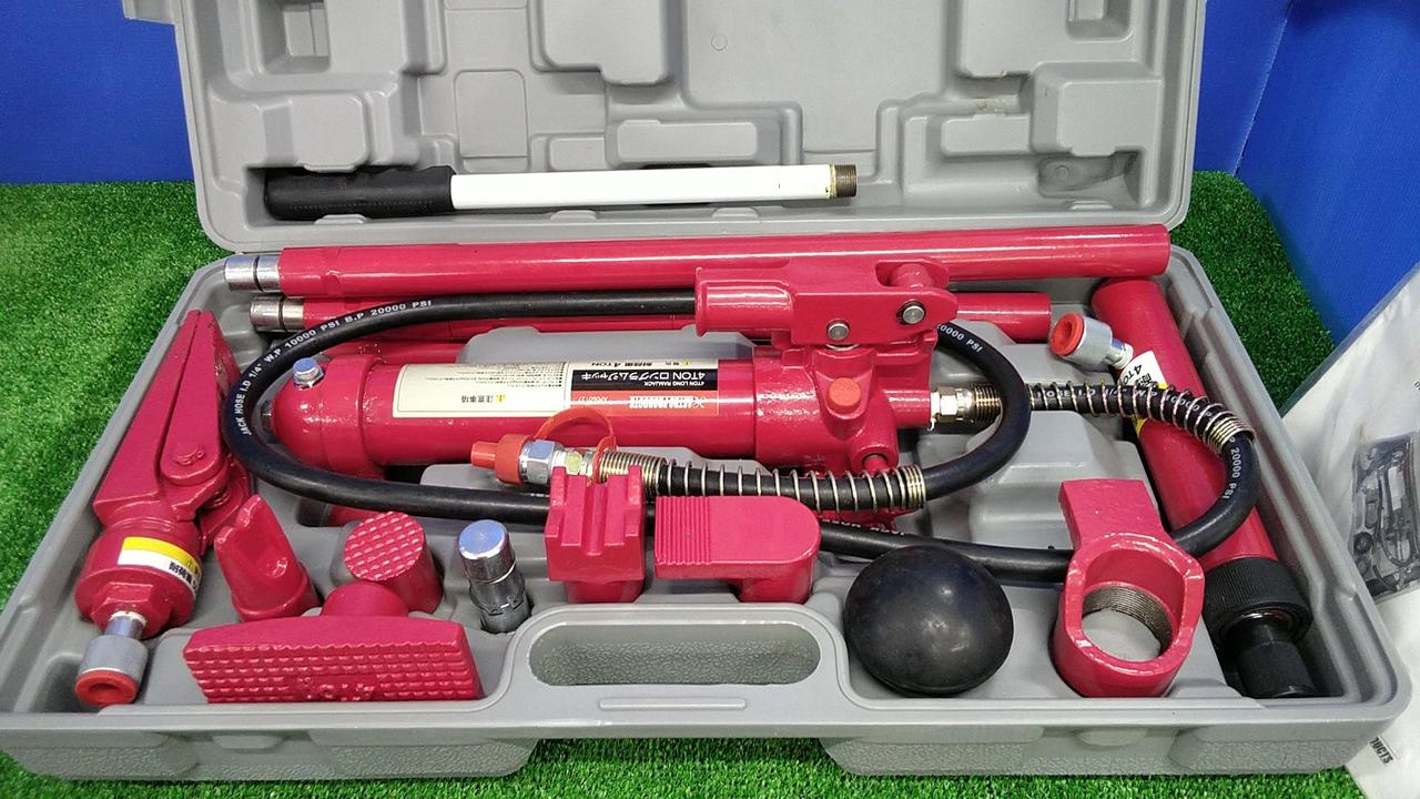 車両のボディやフレームなどの、歪みや凹みの修正に使用する油圧工具のセットです。 |