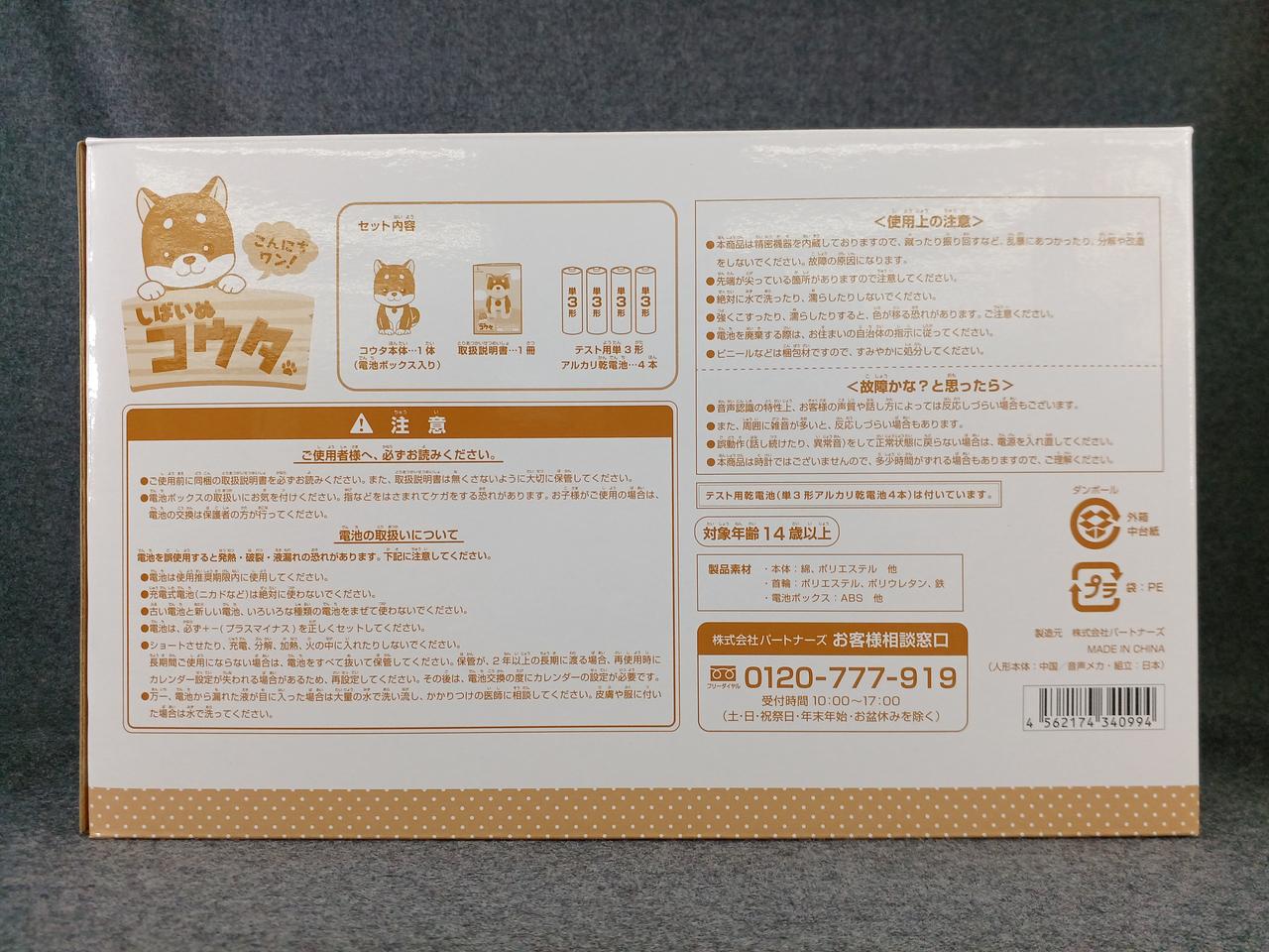 本体ぬいぐるみ(電池ボックス内蔵)、取扱説明書、バンダナ |