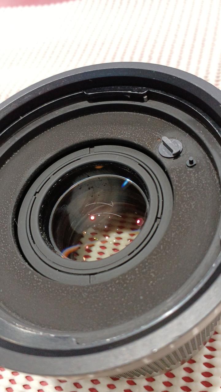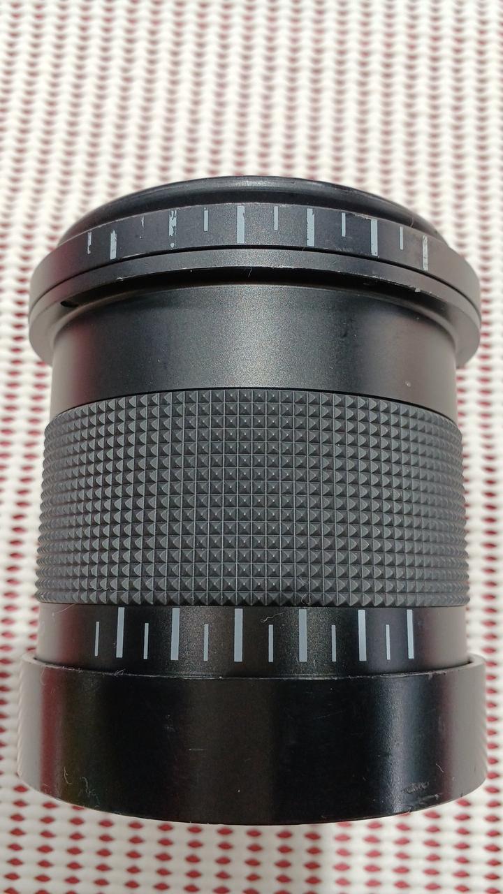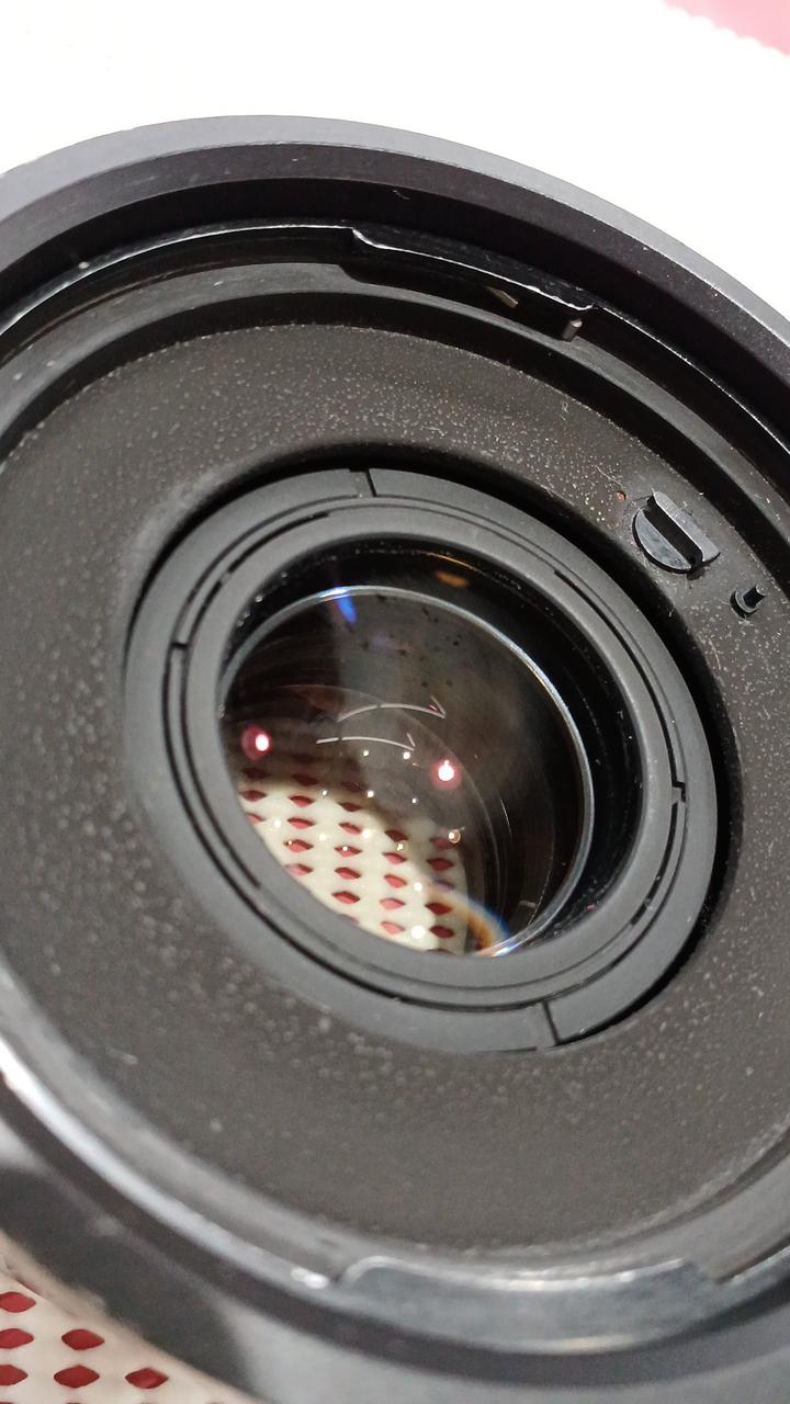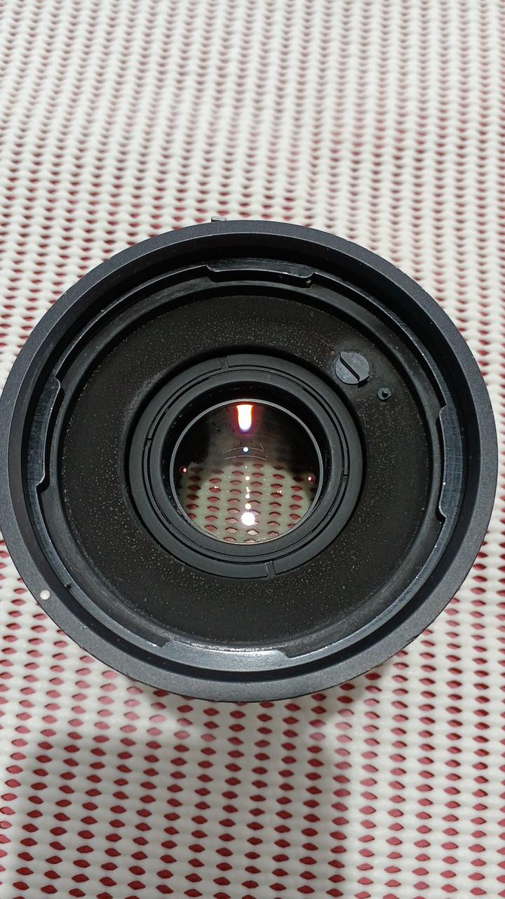 テレコンレンズです。外観はかなり使い込まれているようでかなり傷んでいます。レンズにも取り切れない汚れやチリの混入があり、レンズ装着側のレンズ中央は大きく曇っています。