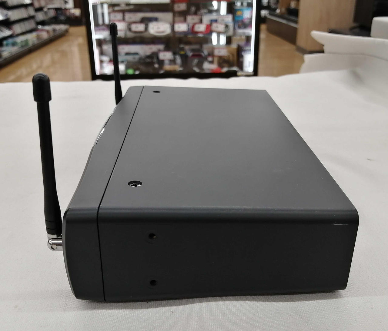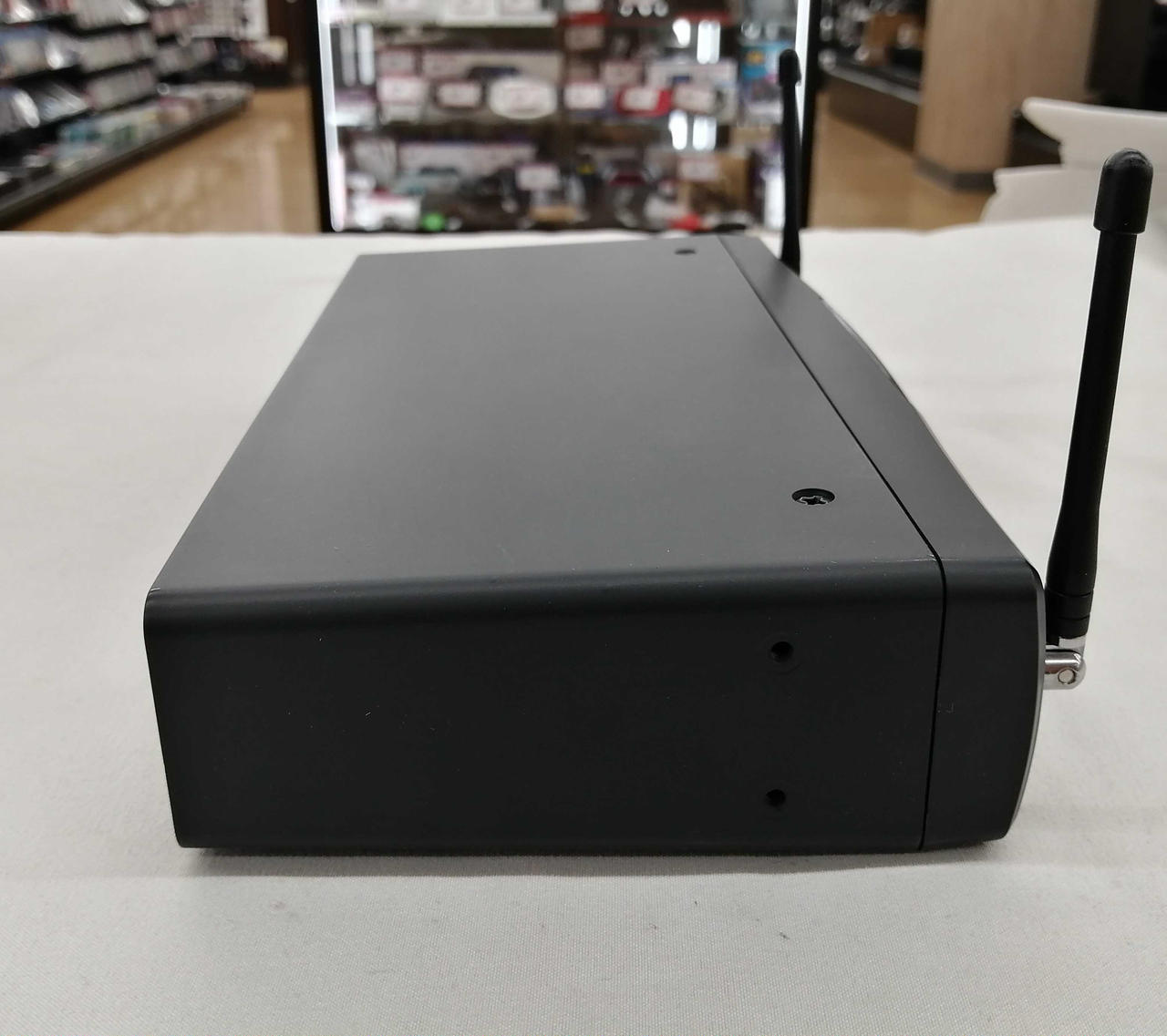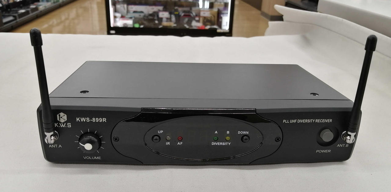 ワイヤレス送信機1台と専用ヘッドセットマイクと受信機のセットです。最高使用距離90m 全30チャンネルからお好みの1チャンネルを選択可能