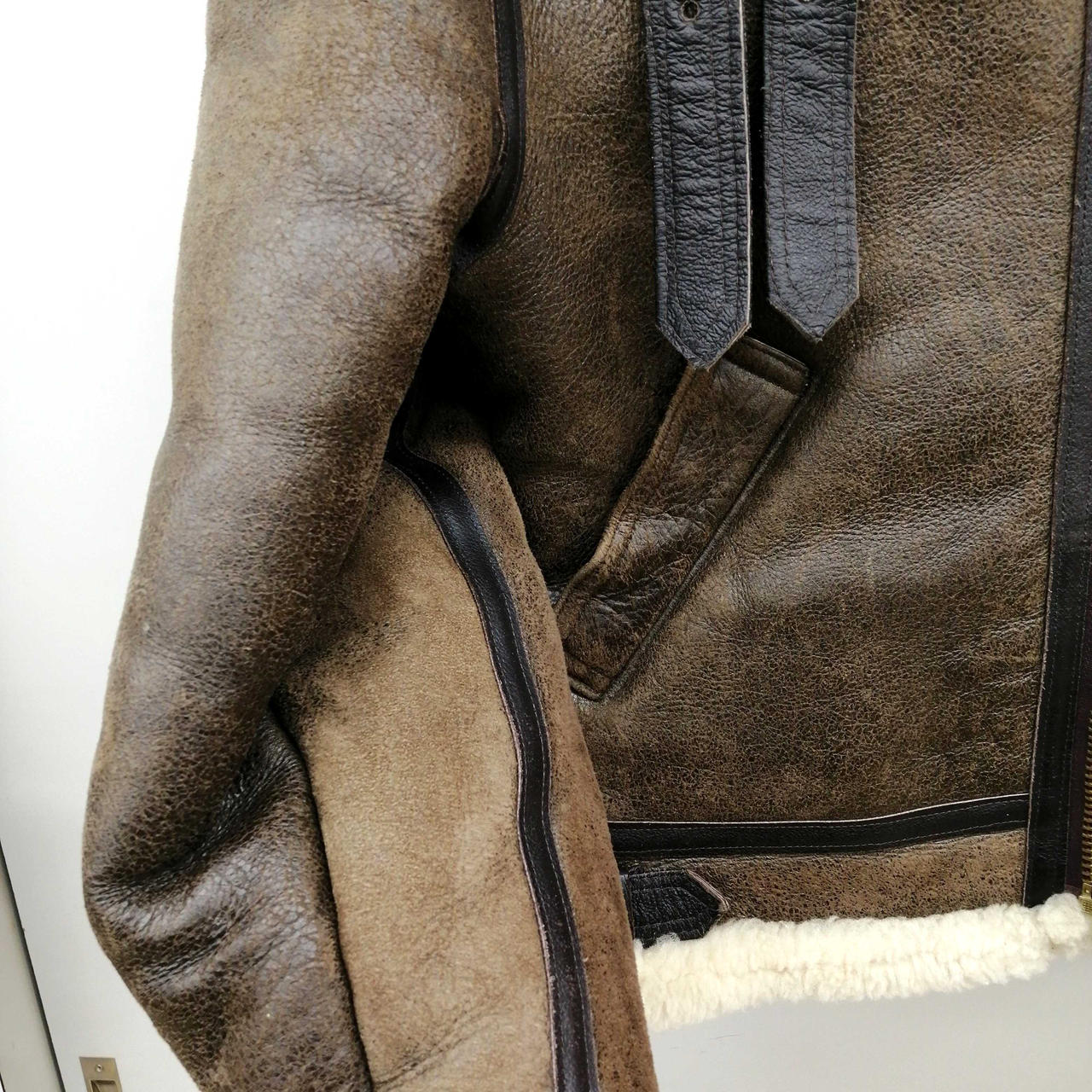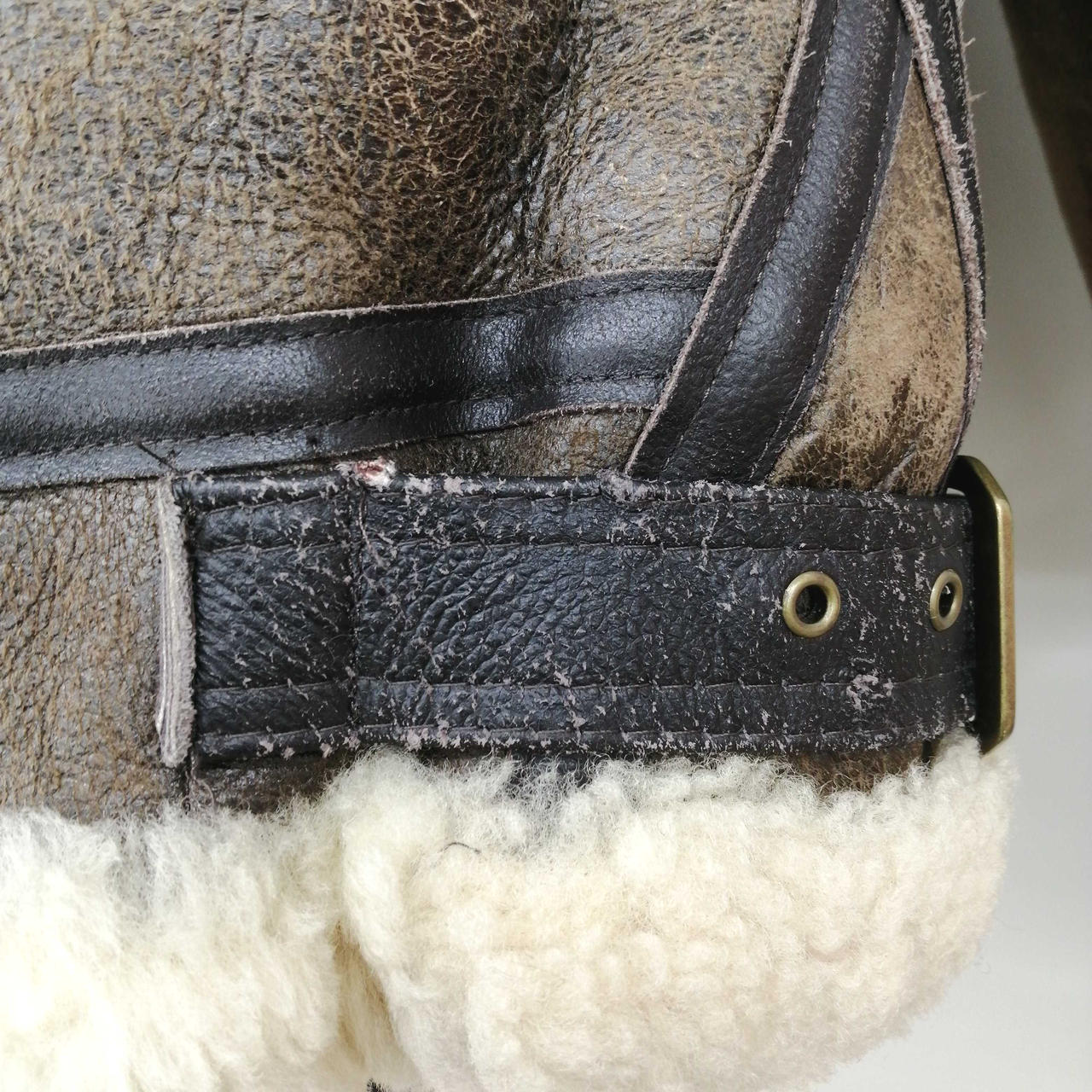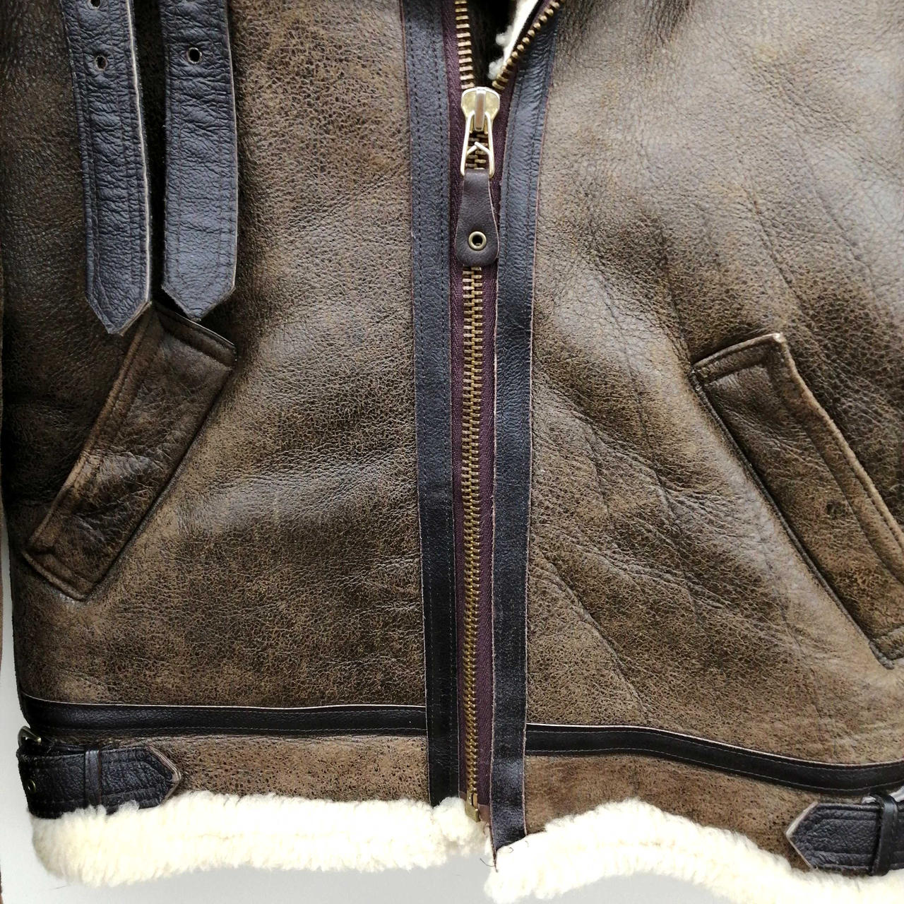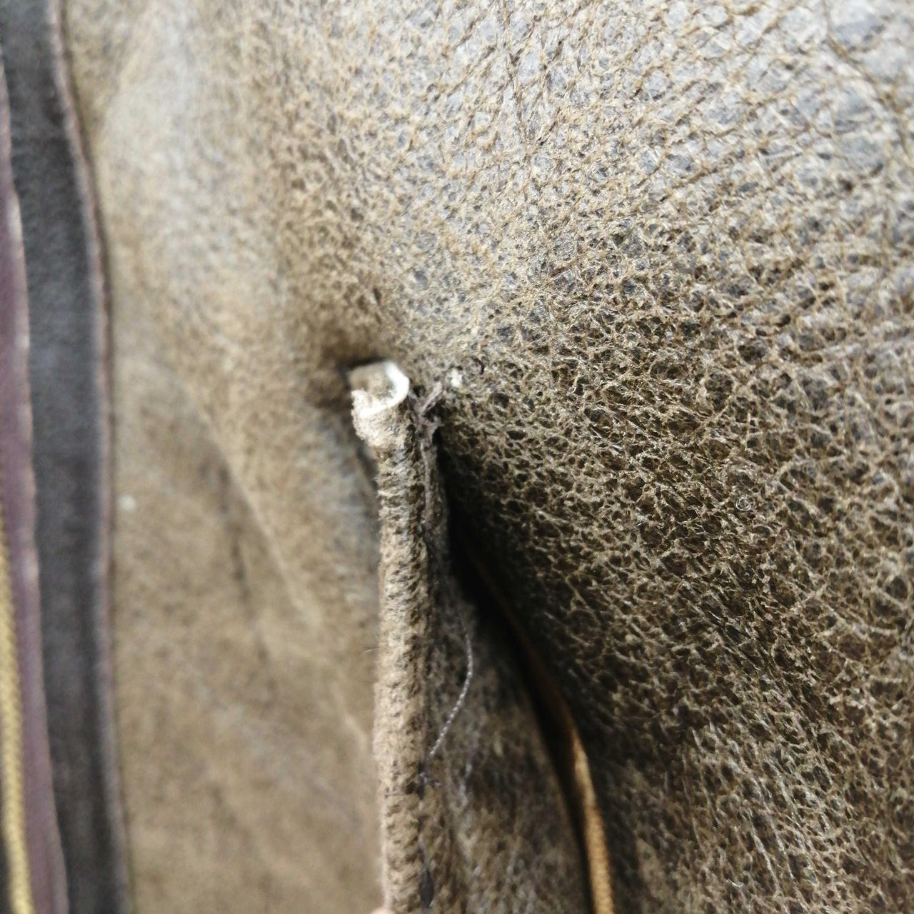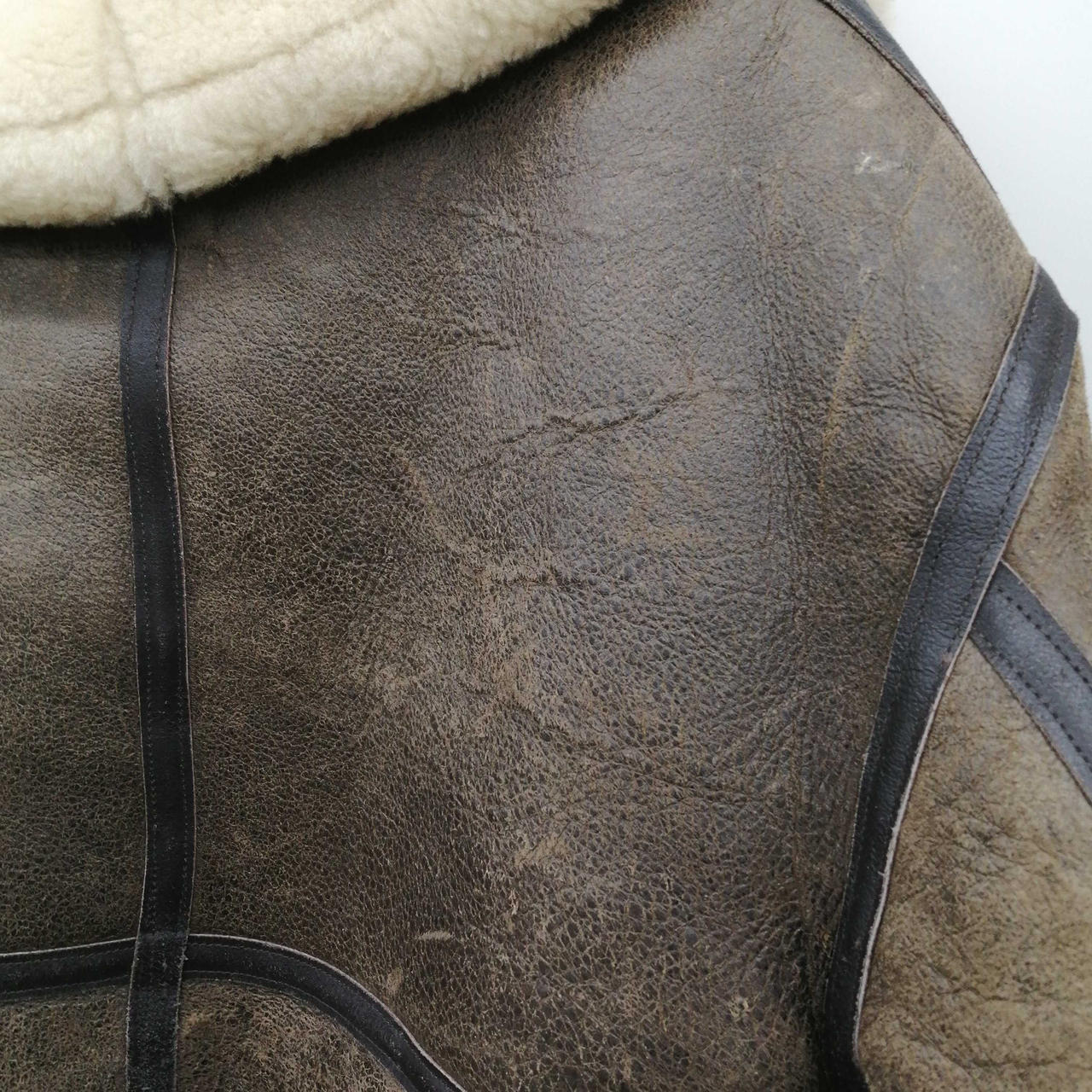 全体的に使用感あります。内側右胸あたりに黒いシミあります。大きな革の破損はありません。 |