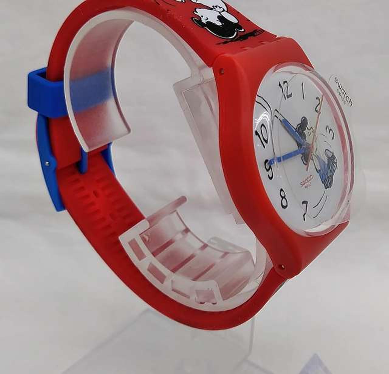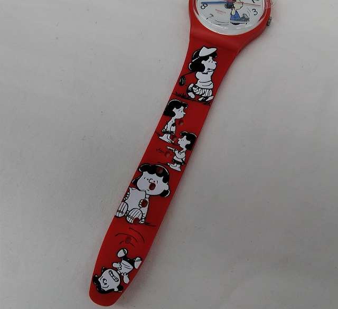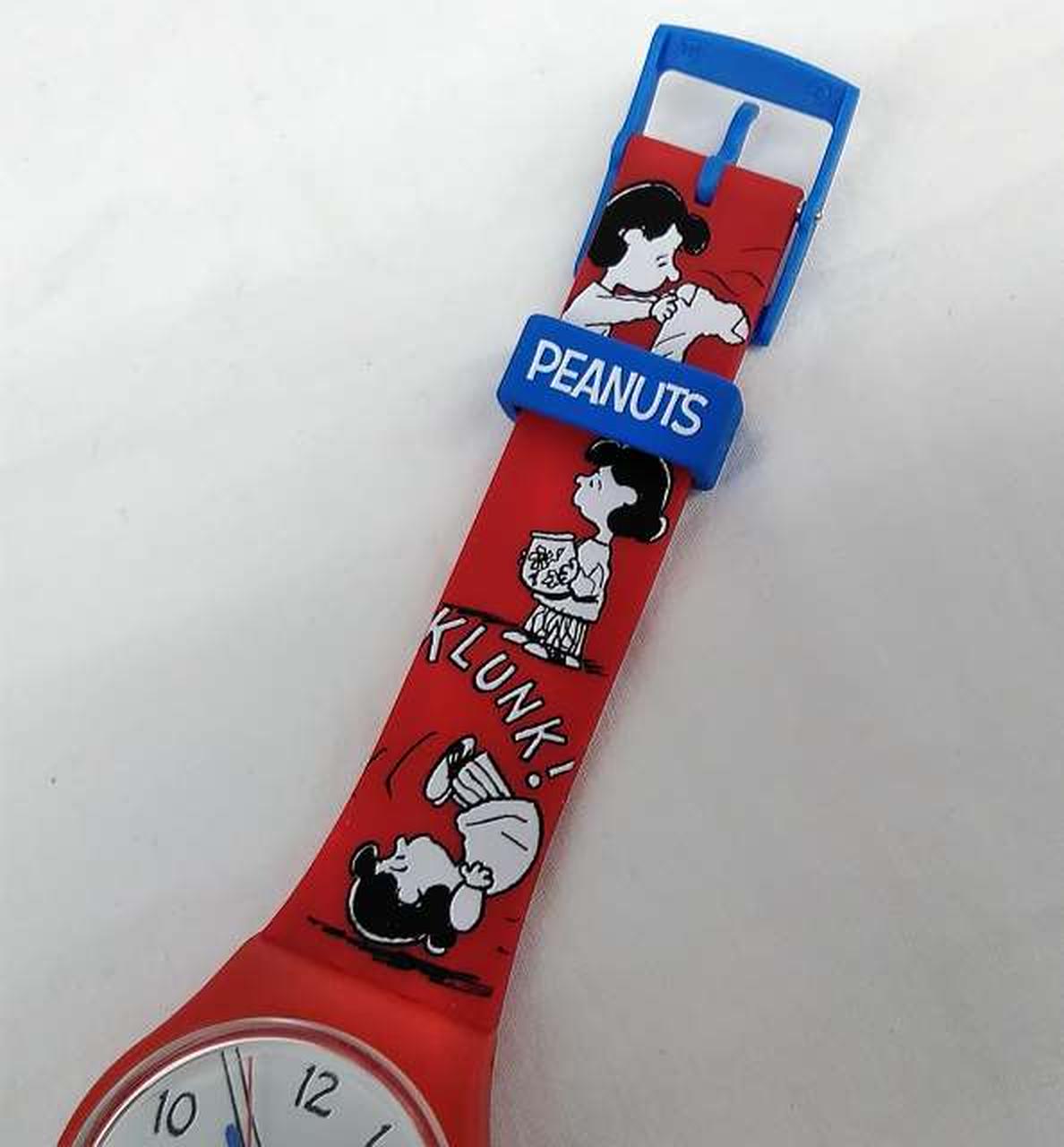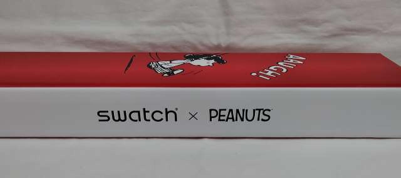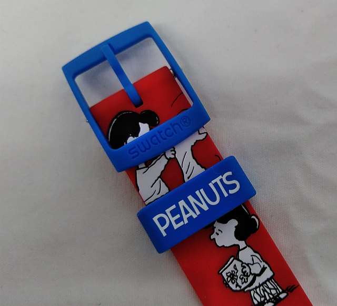 マットレッド一色のシリコンストラップとバイオ素材製ケースが、ストラップ上に広がるブラックとホワイトのプリントとくっきりしたコントラストをなすSwatch X Peanutsウォッチ。 |