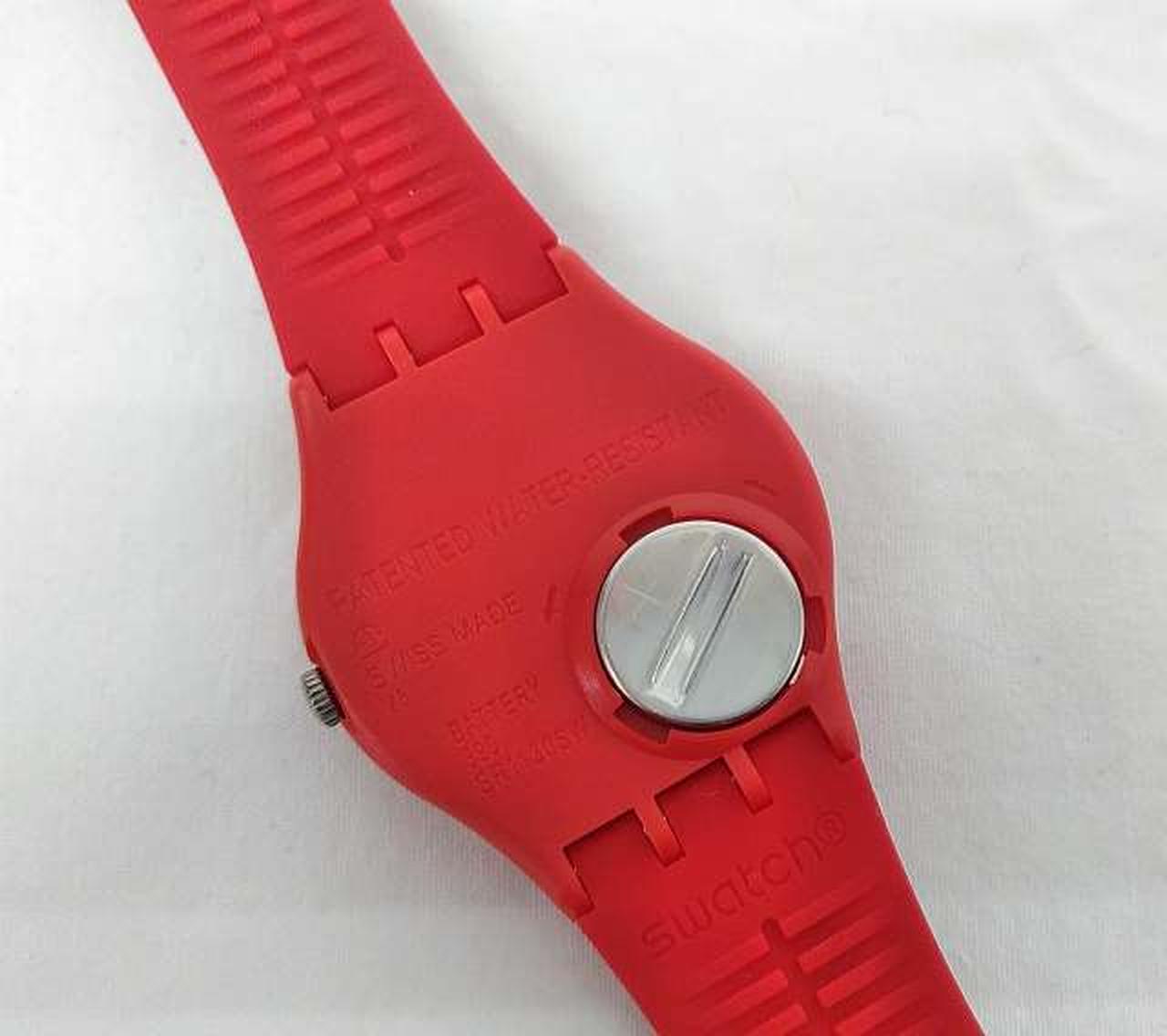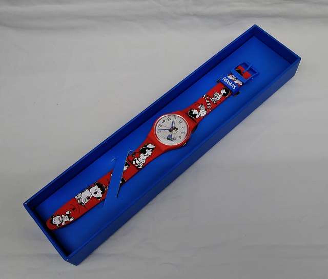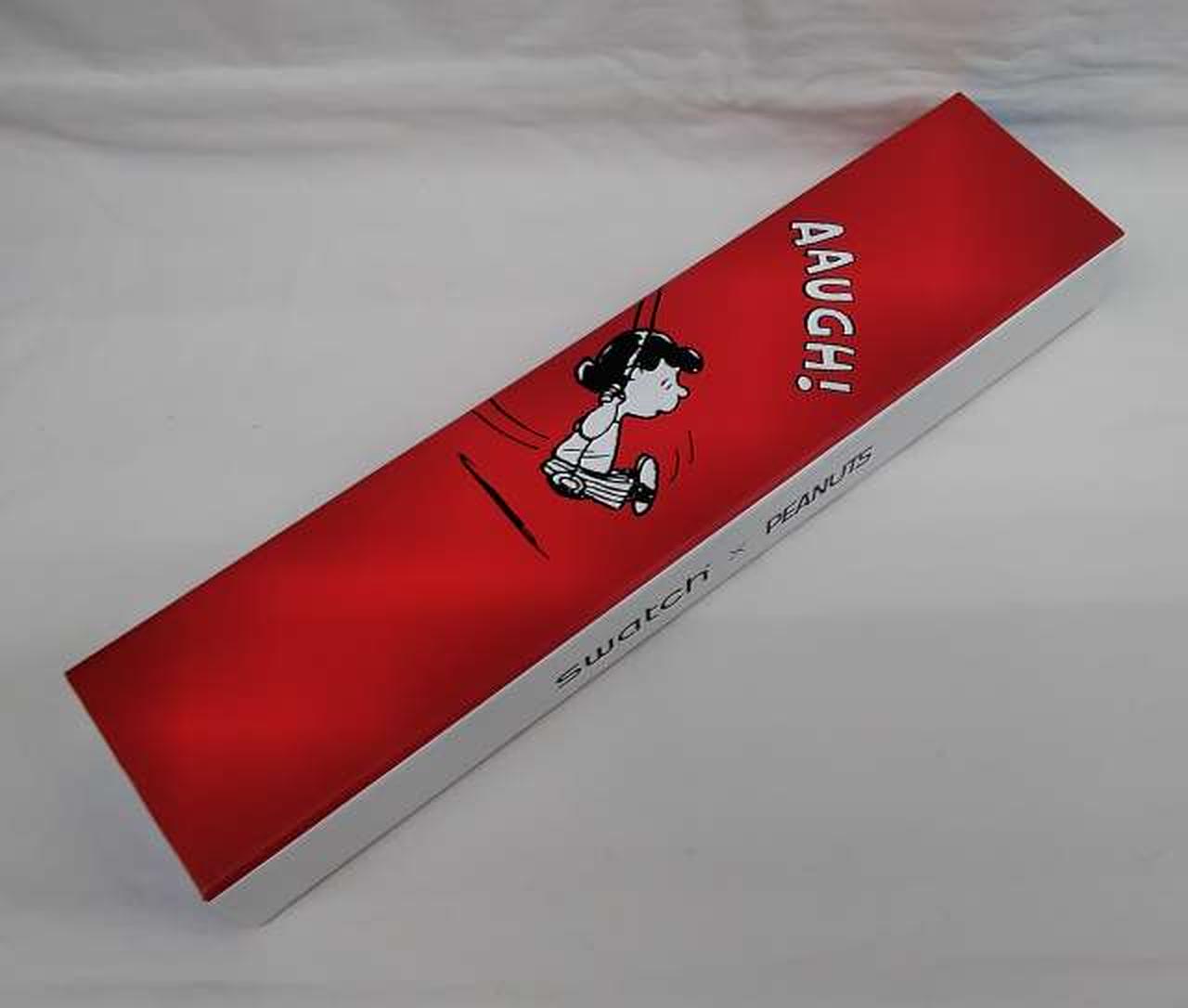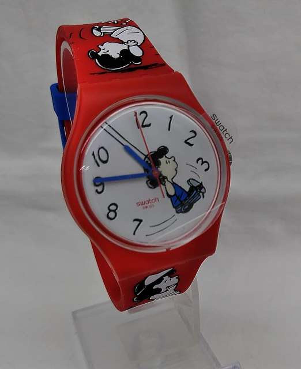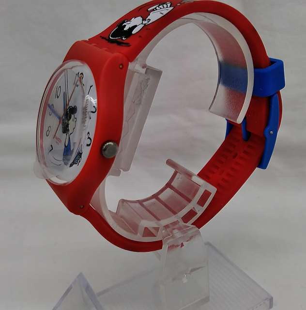マットレッド一色のシリコンストラップとバイオ素材製ケースが、ストラップ上に広がるブラックとホワイトのプリントとくっきりしたコントラストをなすSwatch X Peanutsウォッチ。 |