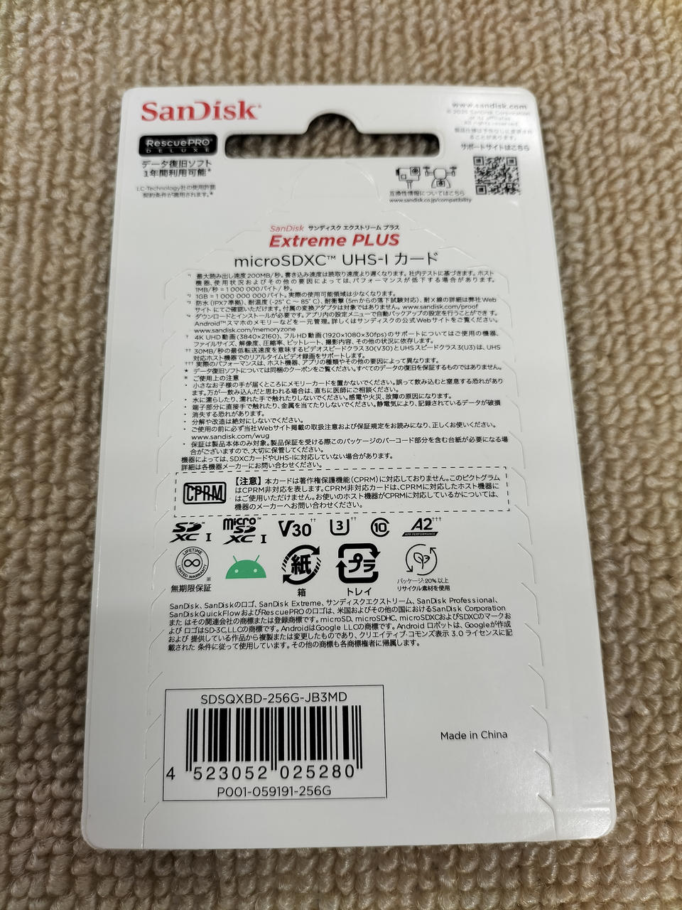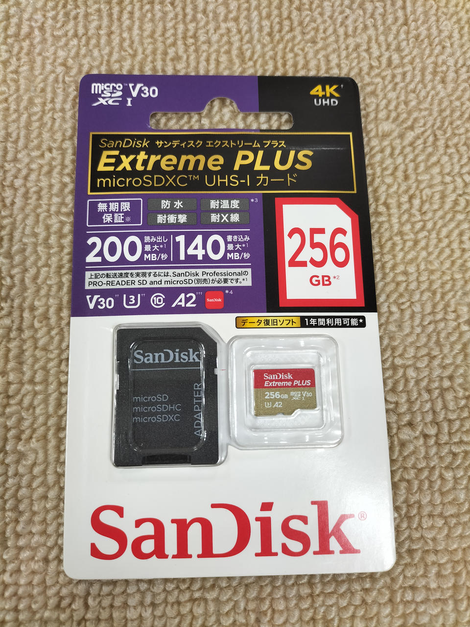 容量:256GB ・UHS規格:UHS-I ・UHSスピードクラス:3 ・SDスピードクラス:Class10 ・ビデオスピード:30 ・転送速度:最大読み出し200MB/秒、最大書き込み140MB/秒 |