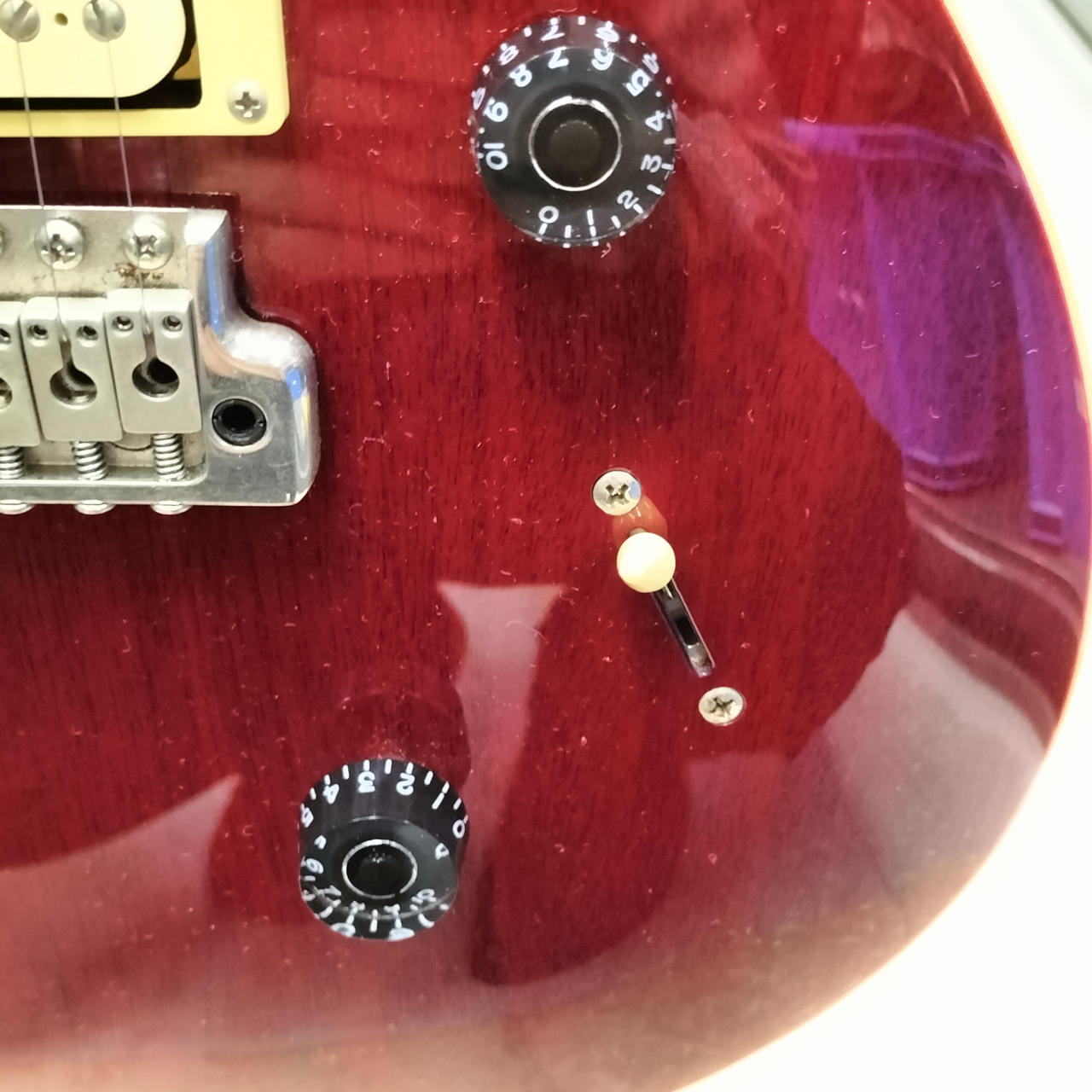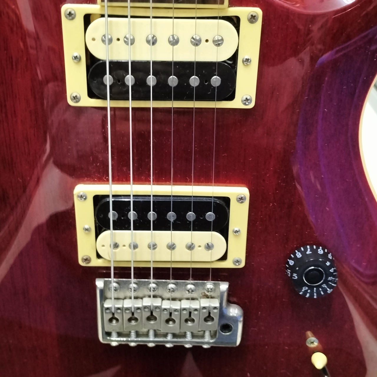 トーンノブの上げ下げでハムバッカーの太めの音もシングルのエッジが効いた音も出せて万能です |