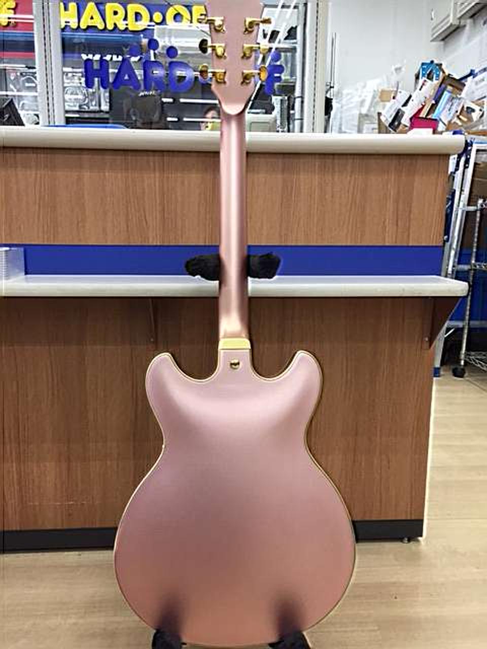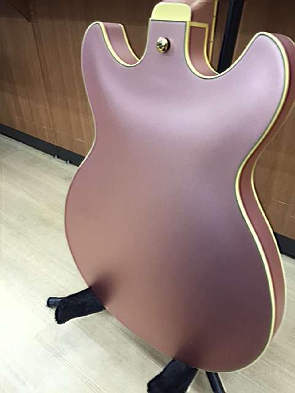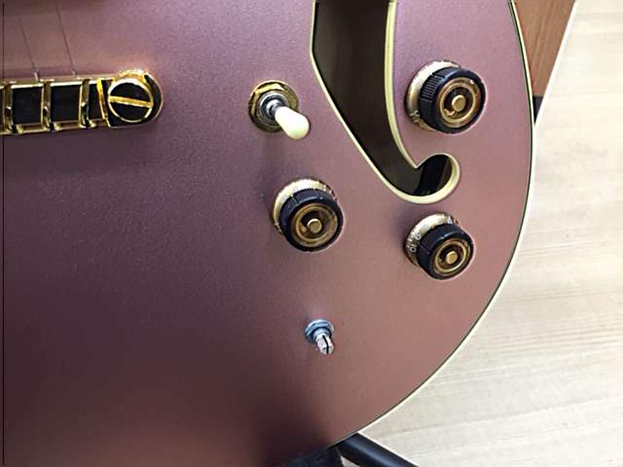ROSE GOLD METALLIC」のマットなフィニッシュが美しい1本です。太く甘くありながらヌケがよく、セミアコサウンドが存分に楽しめます。 |