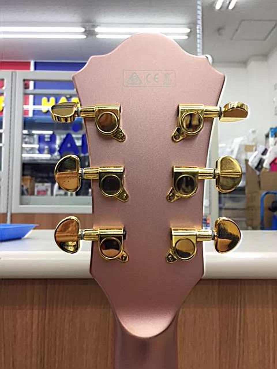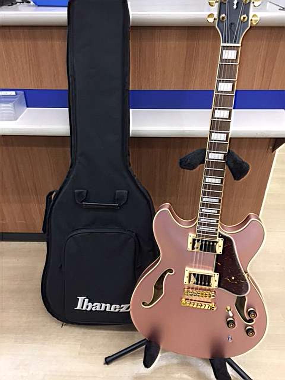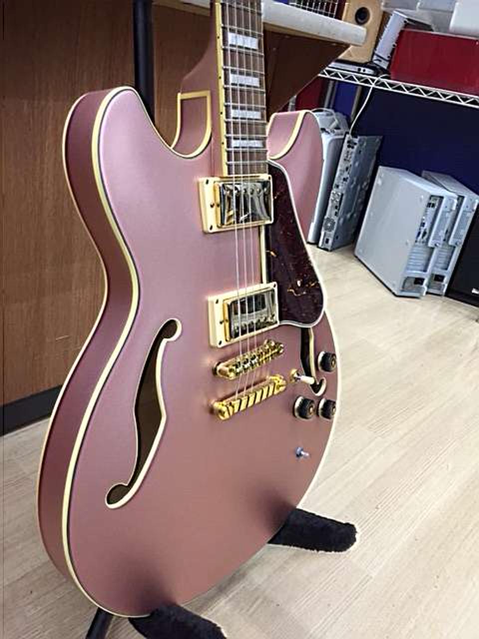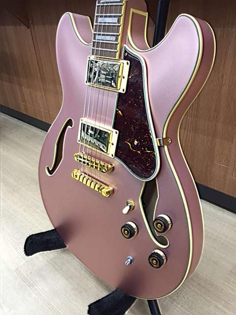 ROSE GOLD METALLIC」のマットなフィニッシュが美しい1本です。太く甘くありながらヌケがよく、セミアコサウンドが存分に楽しめます。 |