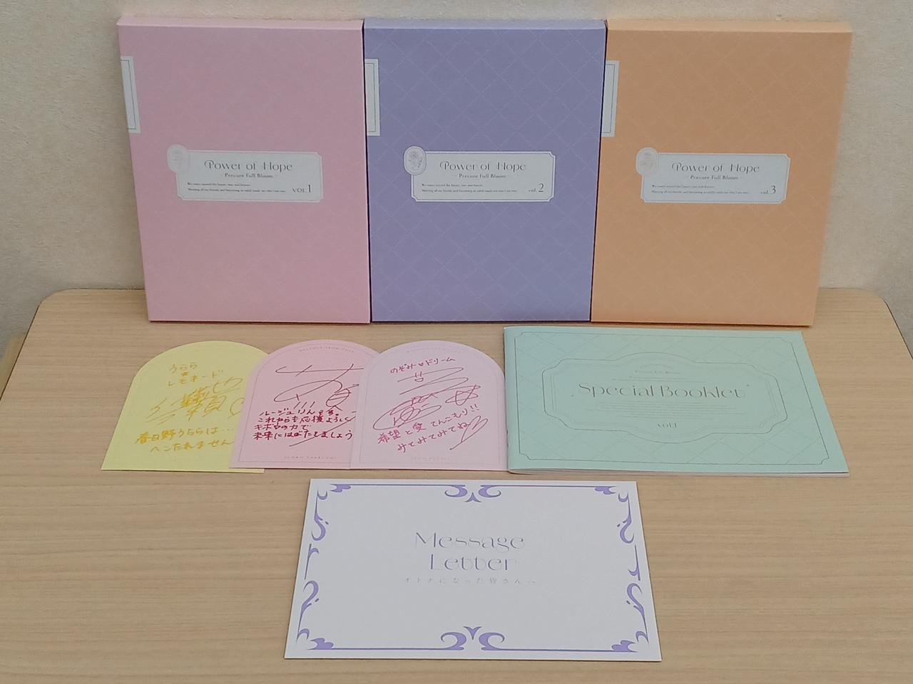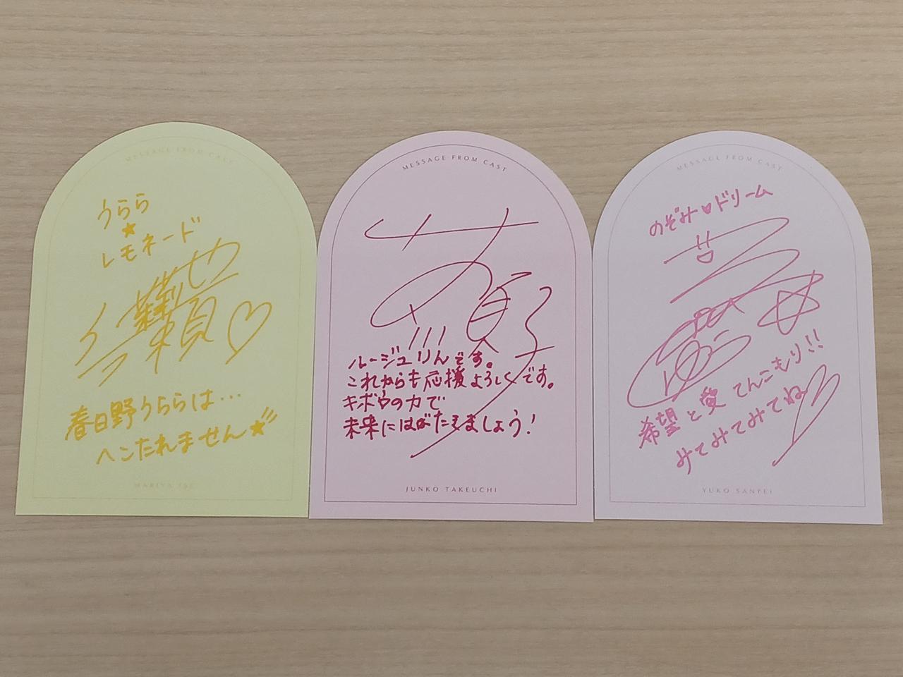 アクリルスタンド三種、キャスト直筆複製色紙、メッセージレター、スペシャルブックレットのセットとなります。 |