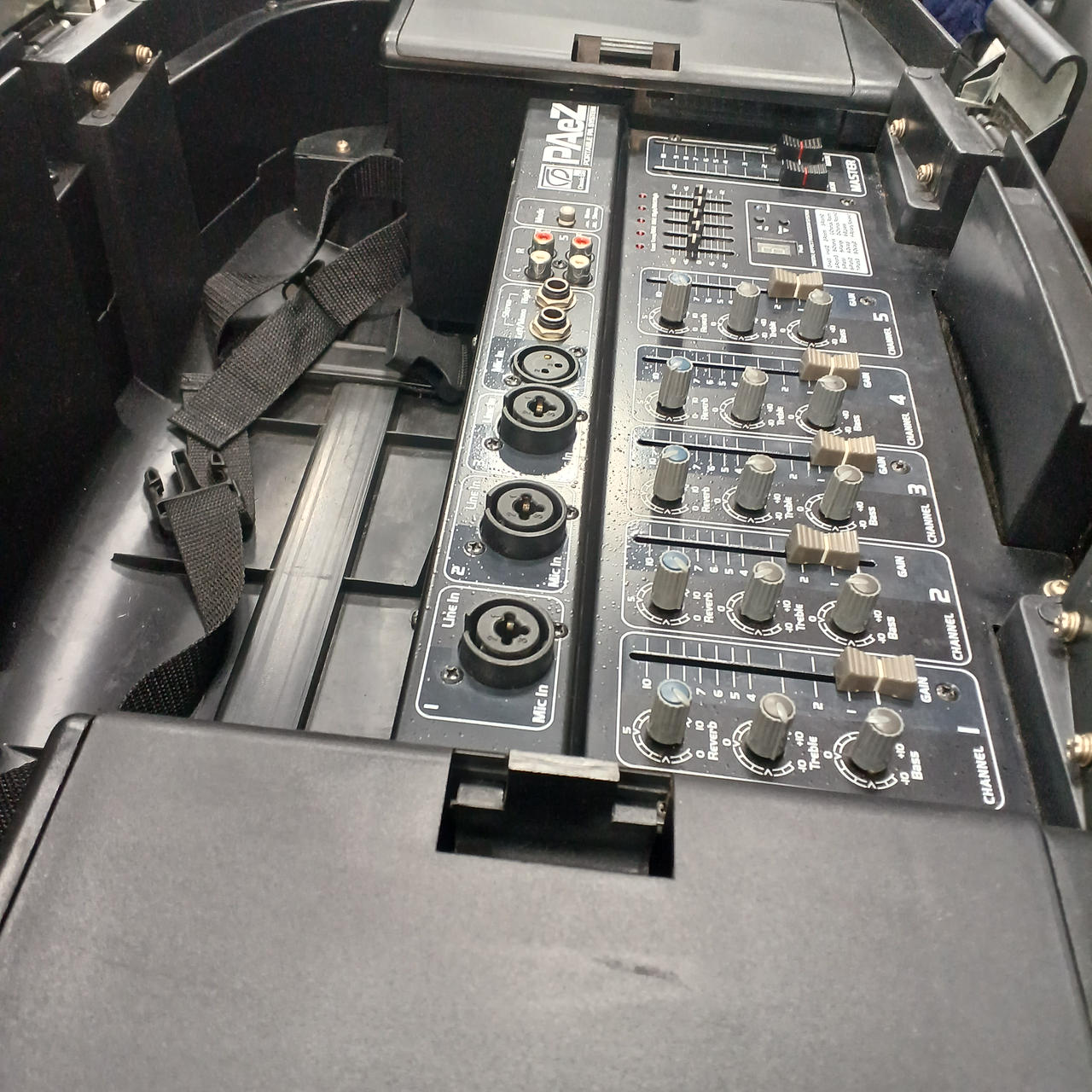 2台のスピーカーに150W出力のパワードミキサー |