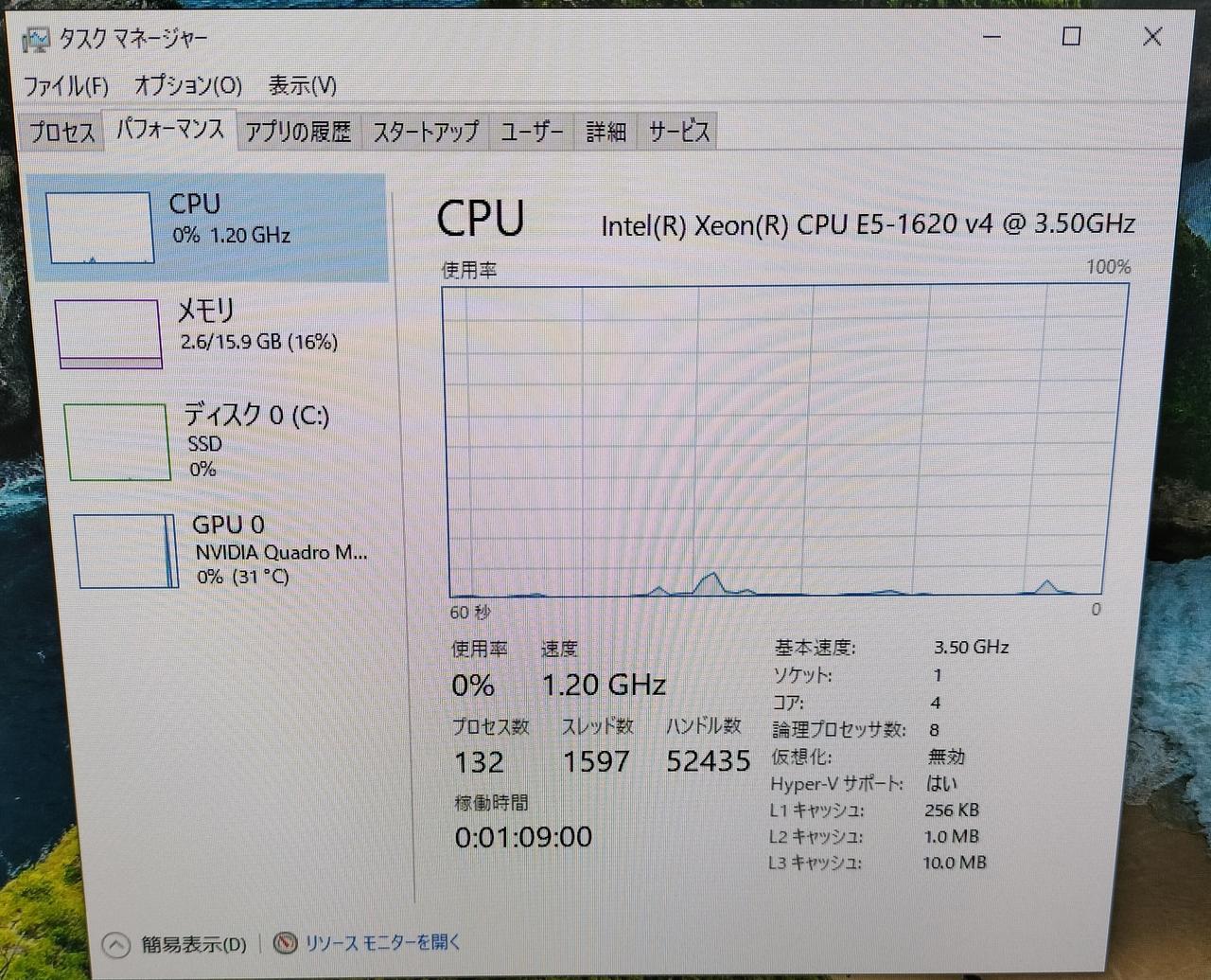 OS:Windows 10 Pro 64bit CPU:XEON E5-1620 V4 3.50GHz 4コア8スレッド |