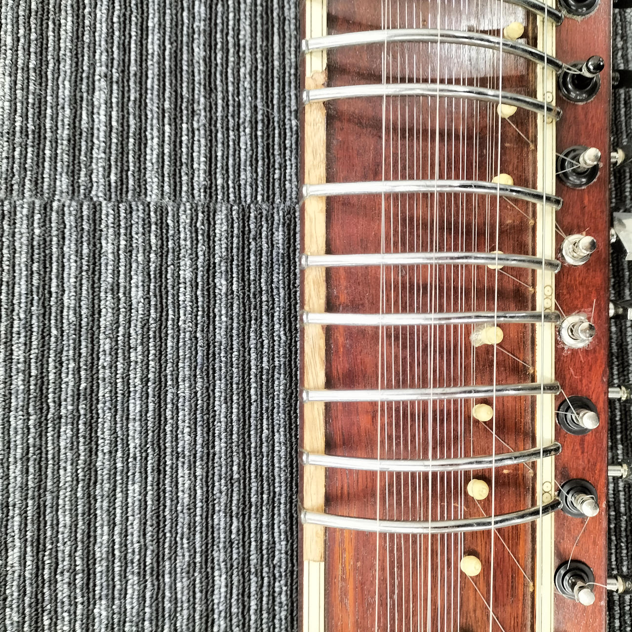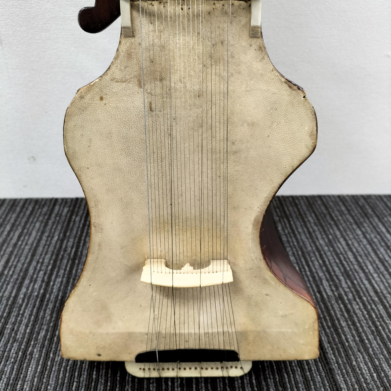 床上に座って膝の上または前に置き、棹の部分を左肩にもたせかけるようにして左手指でフレットを押さえて右手で弓奏する。 |
