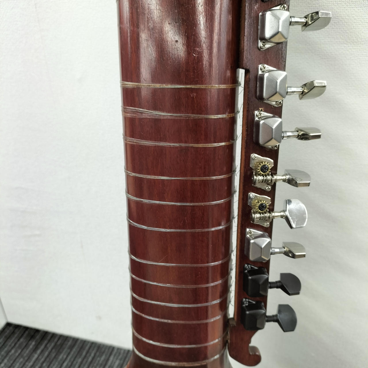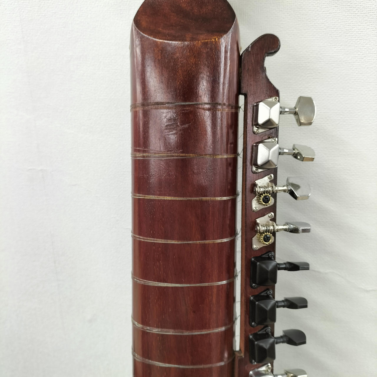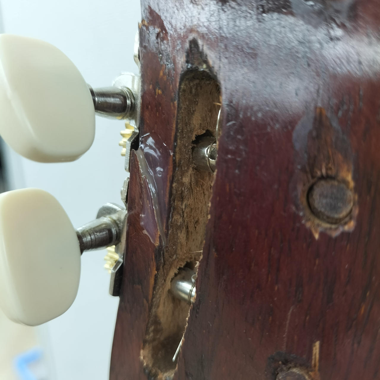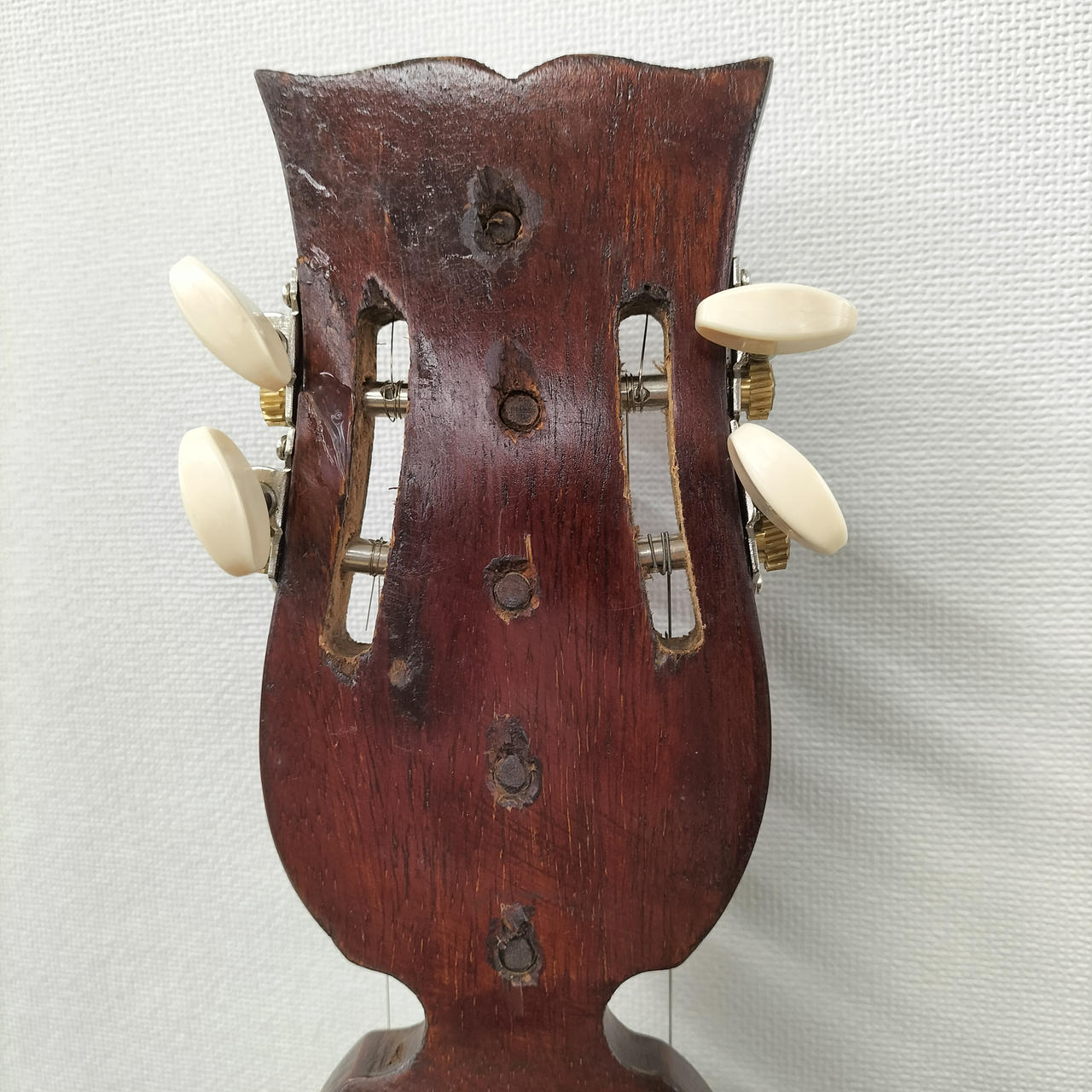ペグ交換、ヘッドに修正跡有ります。装飾剝がれている所多々あります。 |
