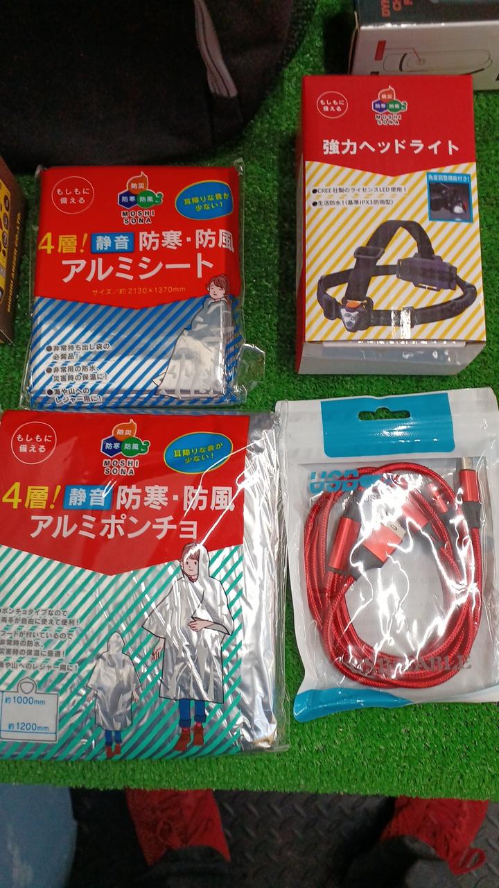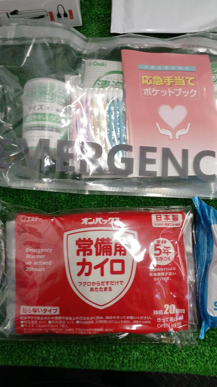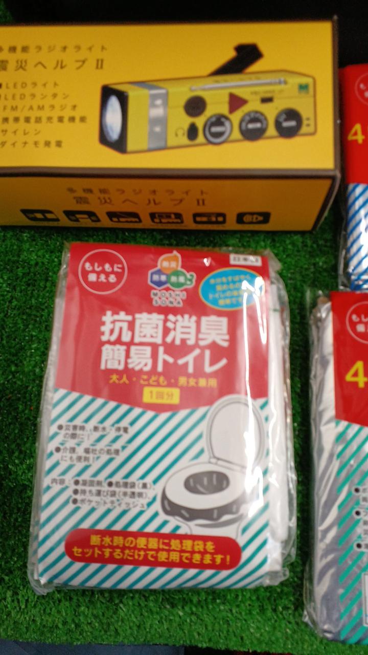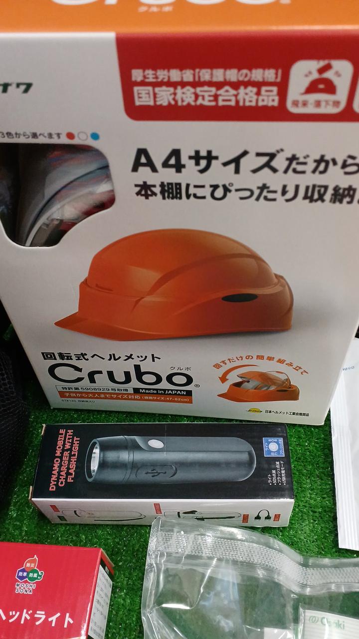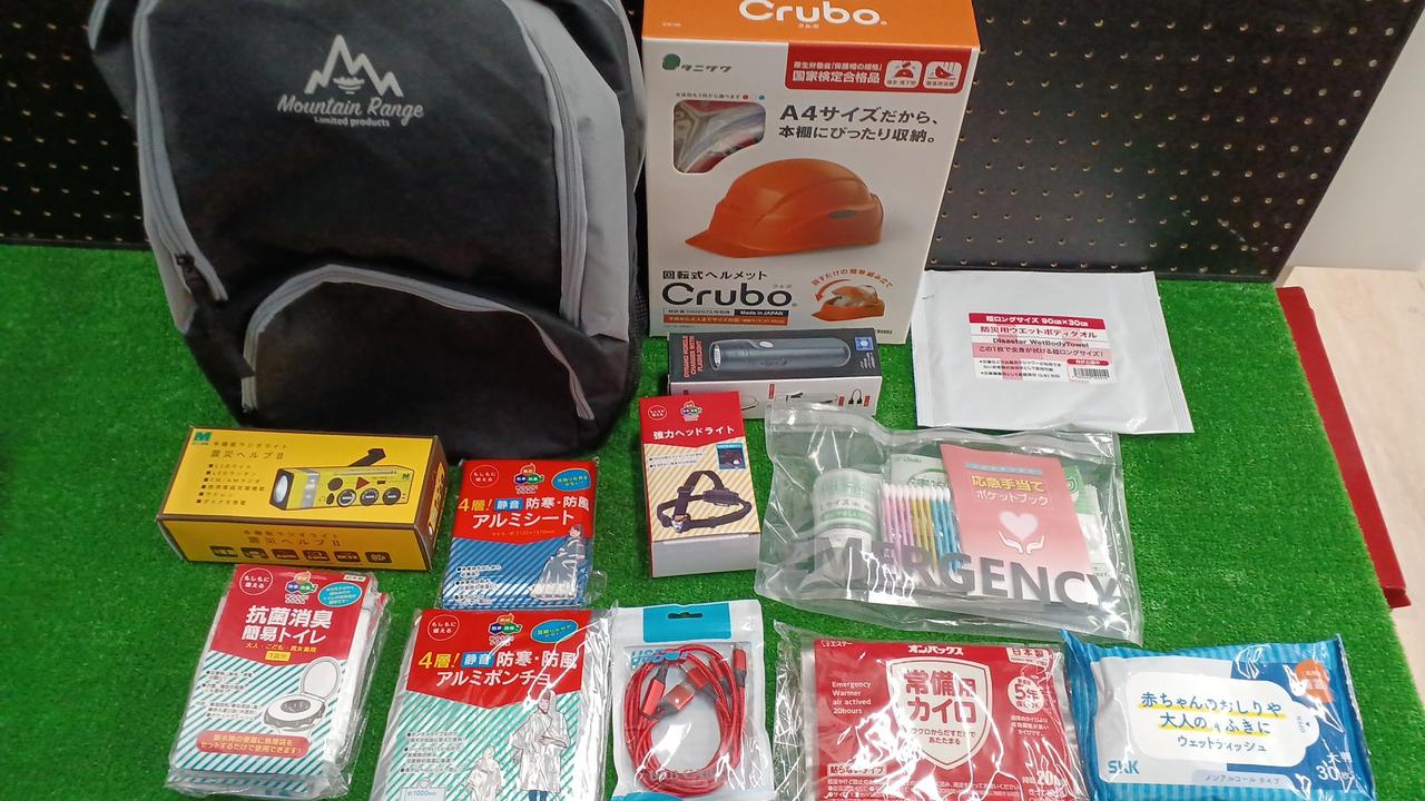 ヘルメット、簡易トイレ、アルミシートやラジオなど災害時に役立つグッズが入っています。 |