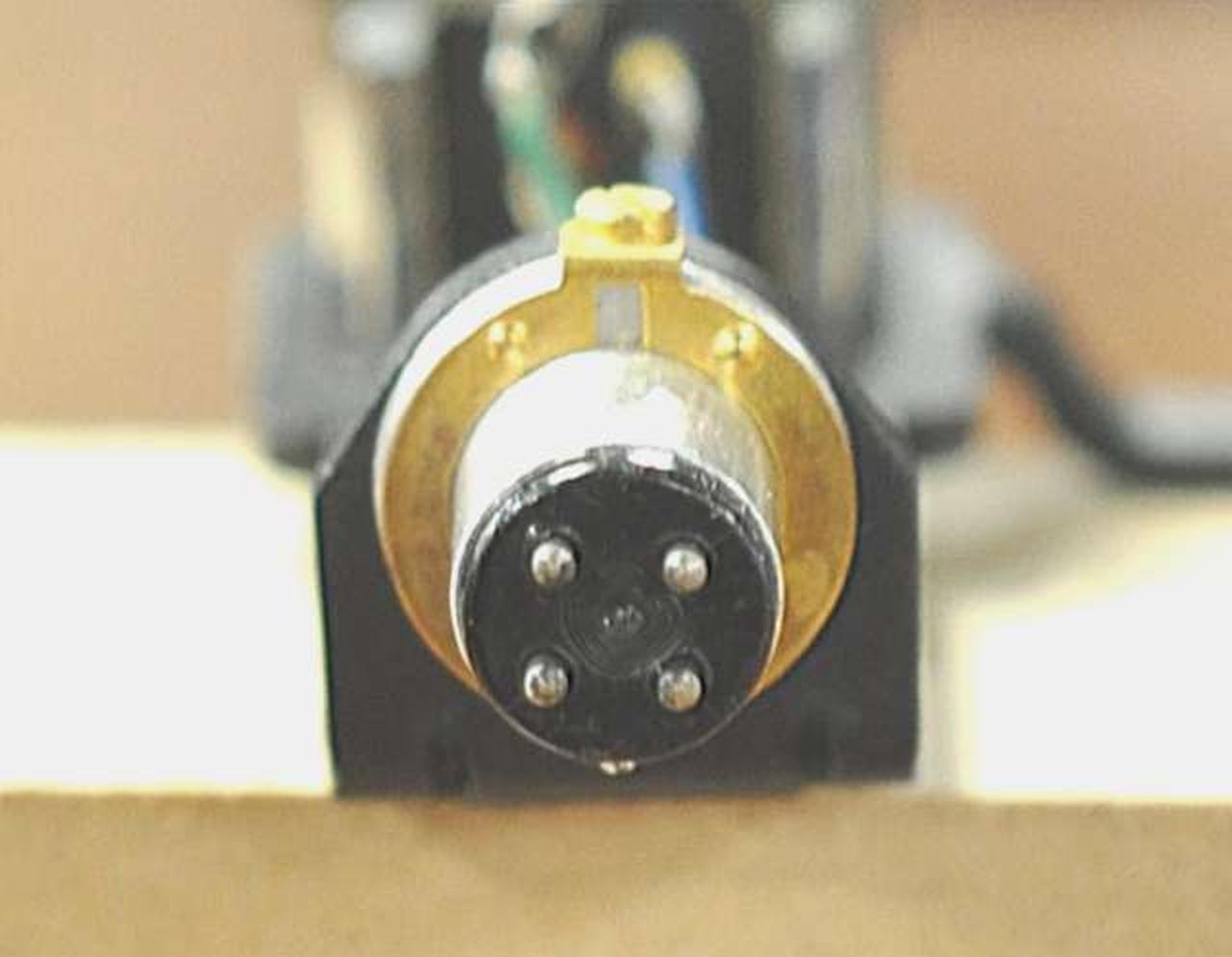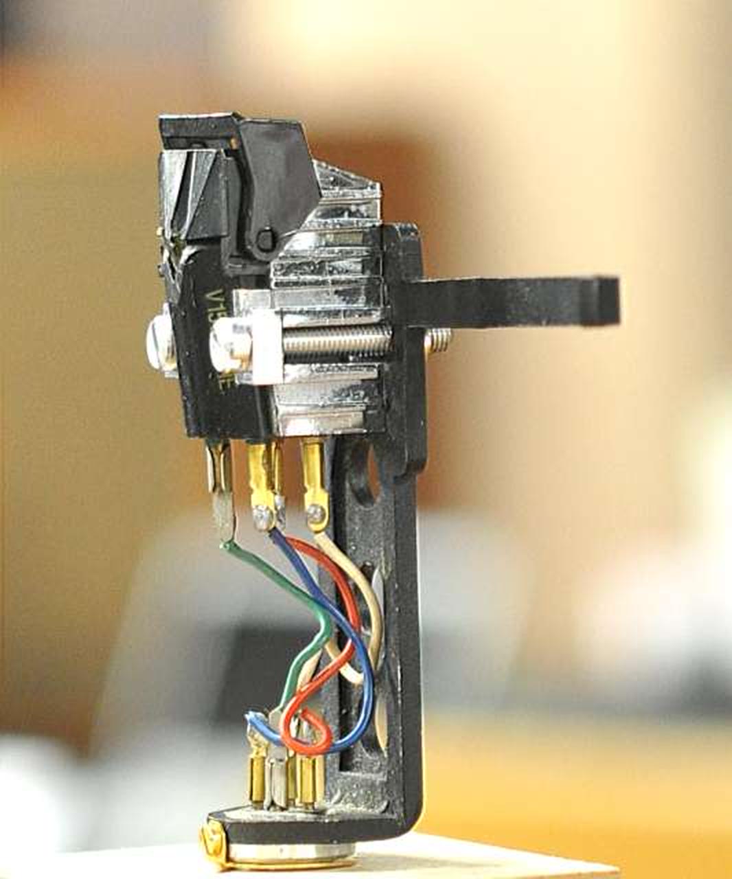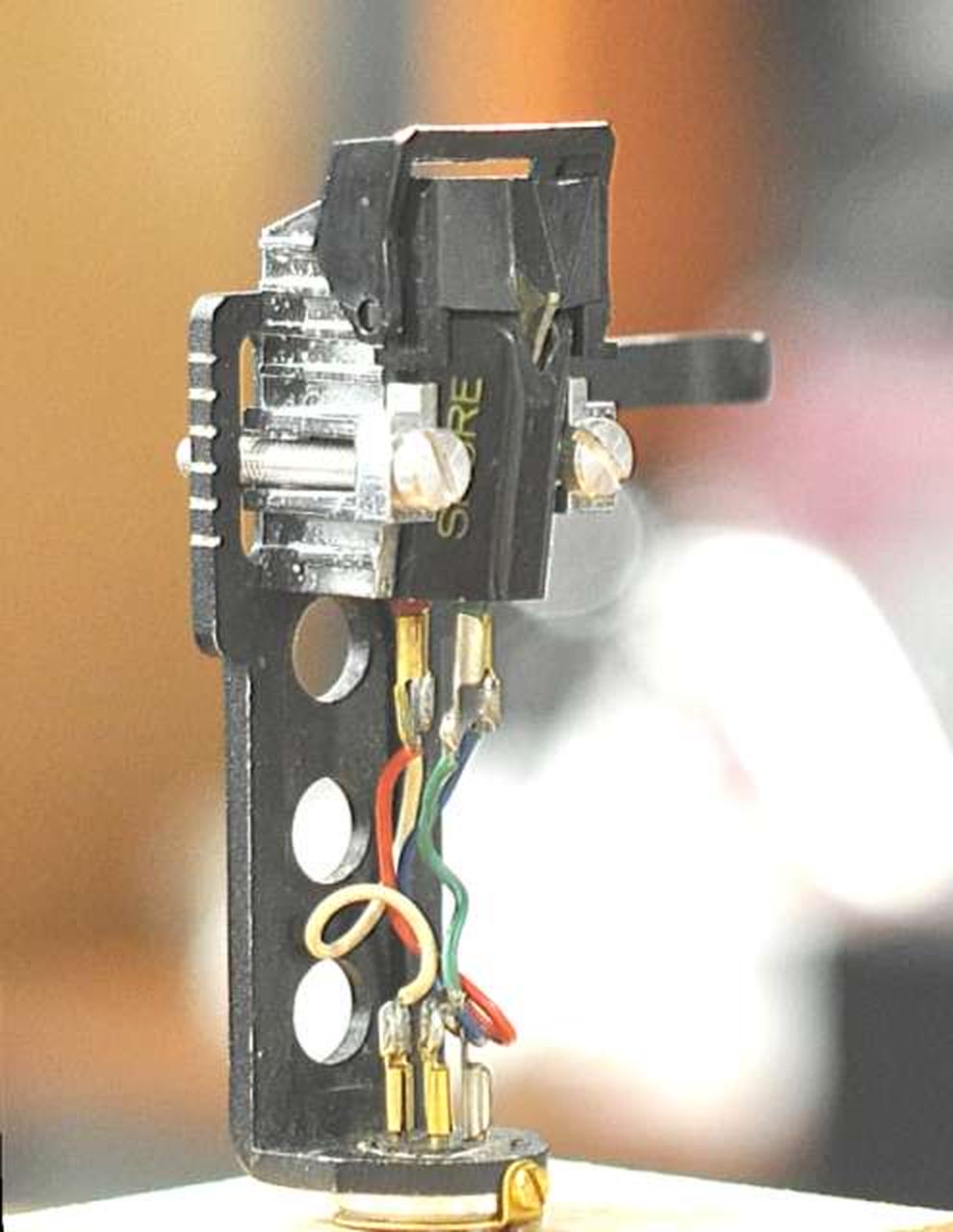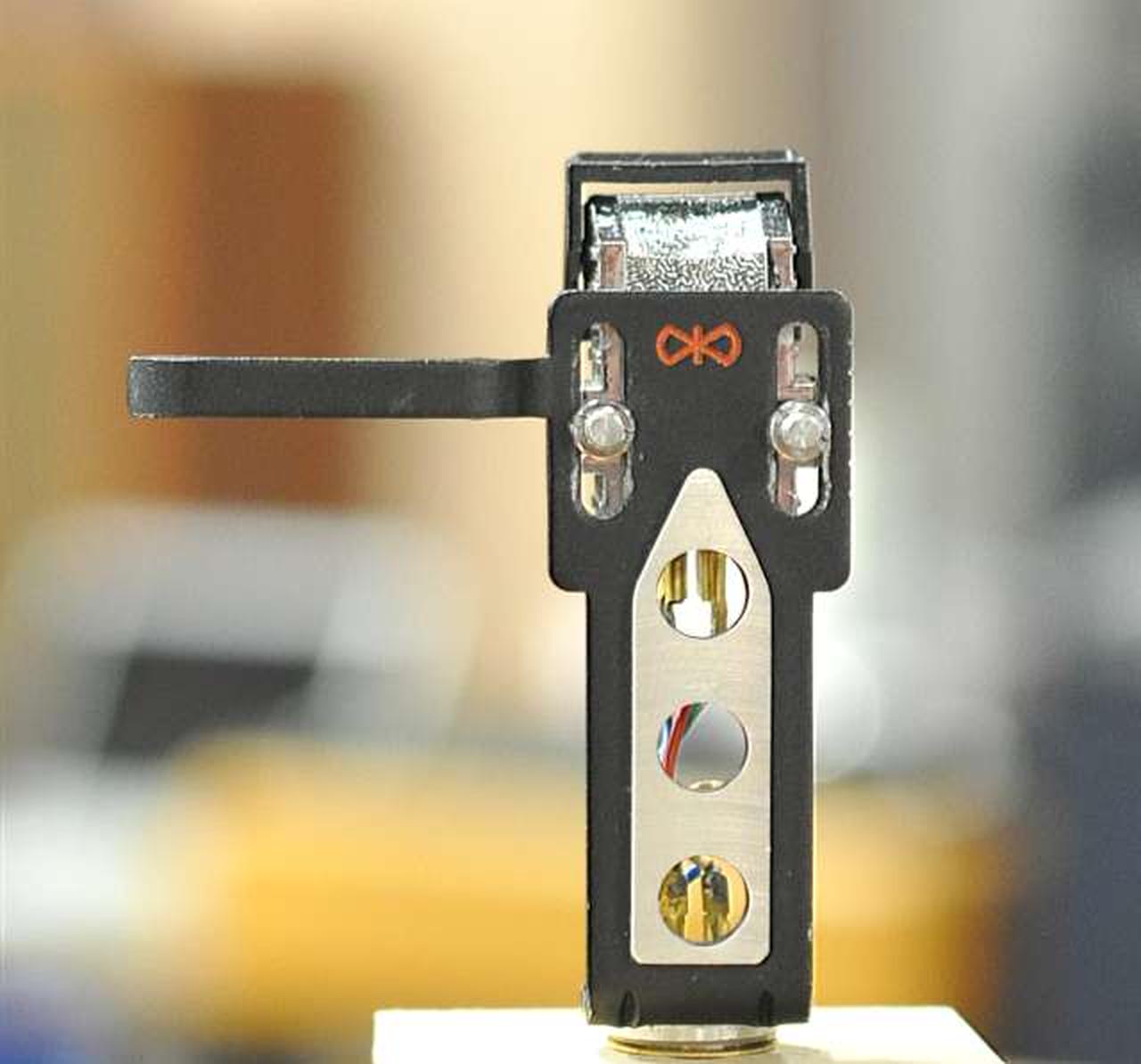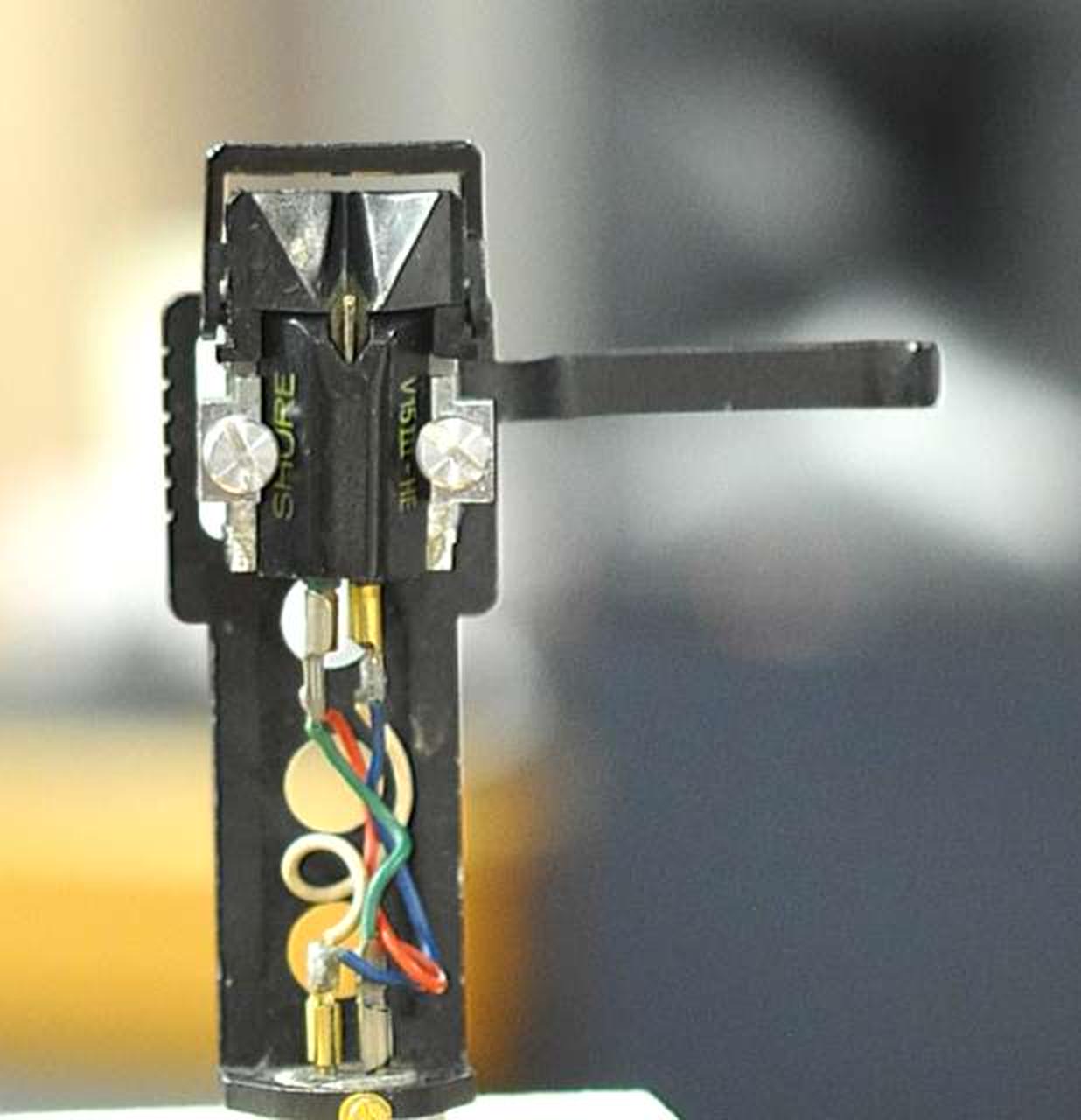 MMカートリッジの名機V15TYPE3の超楕円針モデル ULS-2:特殊なアルミニウム合金を素材とした軽量・無共振ヘッドシェル アームパイプとの接合はベリリウムワッシャーとTT方式(三点圧着)となっており、接続ガタを追放しています |