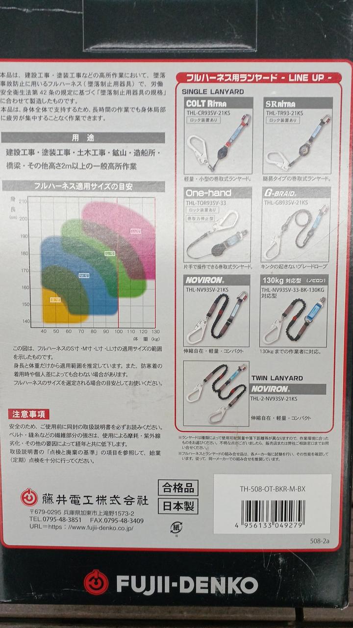 胴ベルト部に道具取り付けスペースを幅広く確保したY型のフルハーネスです。 |