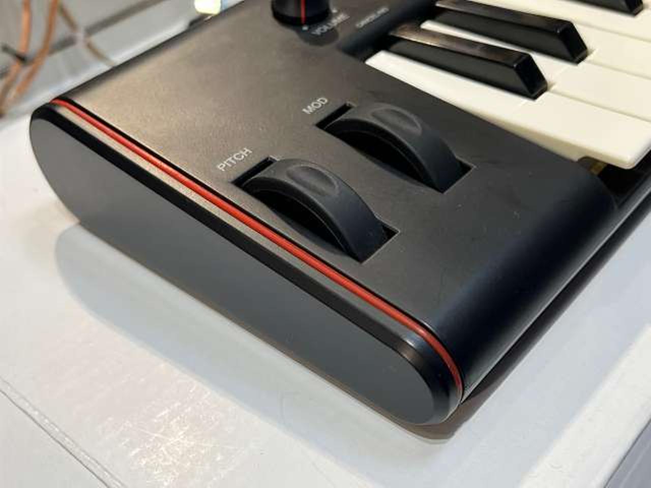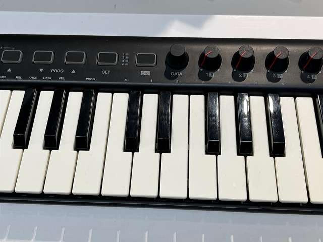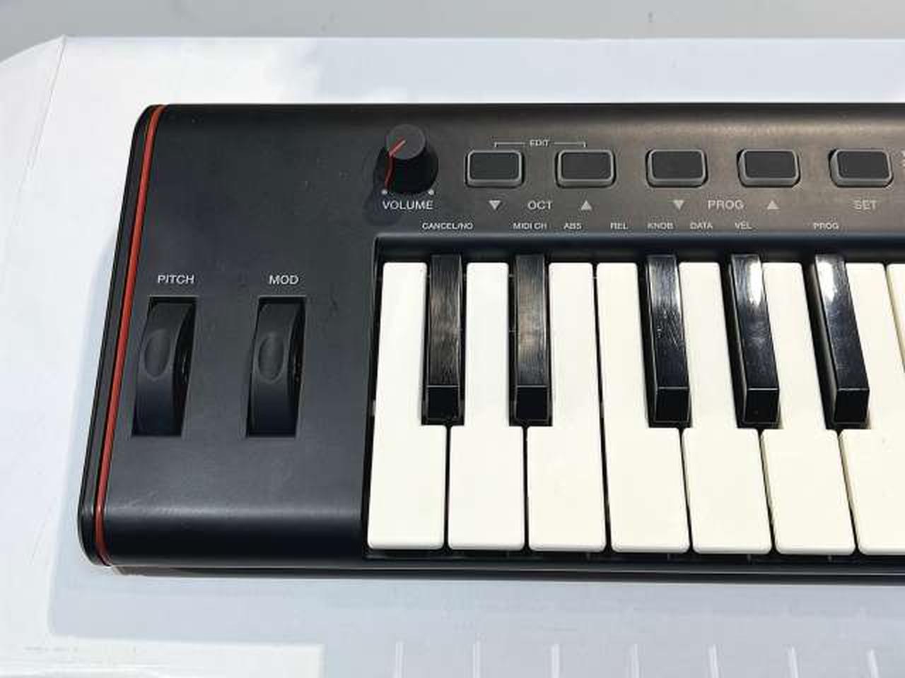 ベロシティ対応の37鍵(3オクターブ)ミニサイズ鍵盤のMIDIキーボード ヘッドホン出力端子搭載により、ヘッドホン端子を装備しないiOSやAndroidデバイスと接続した場合も、本機から出力音声をモニタリングできる。 |