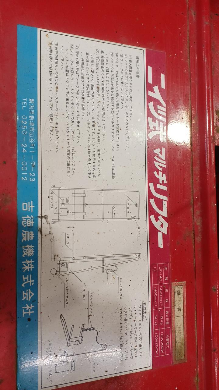 単相100V 50Hz 最大荷重:120㎏ 揚程:1400㎜以下 |