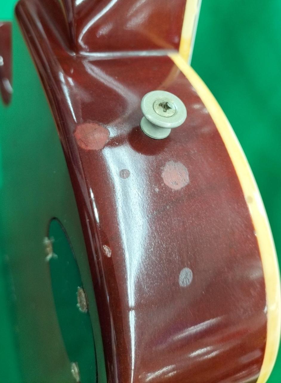 フロントピックアップのエスカッションのネジが1つ中で折れて埋まっています。現状は短めのネジで留まっています。 |