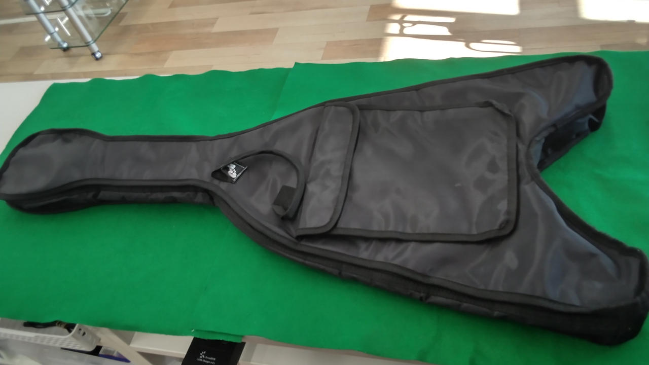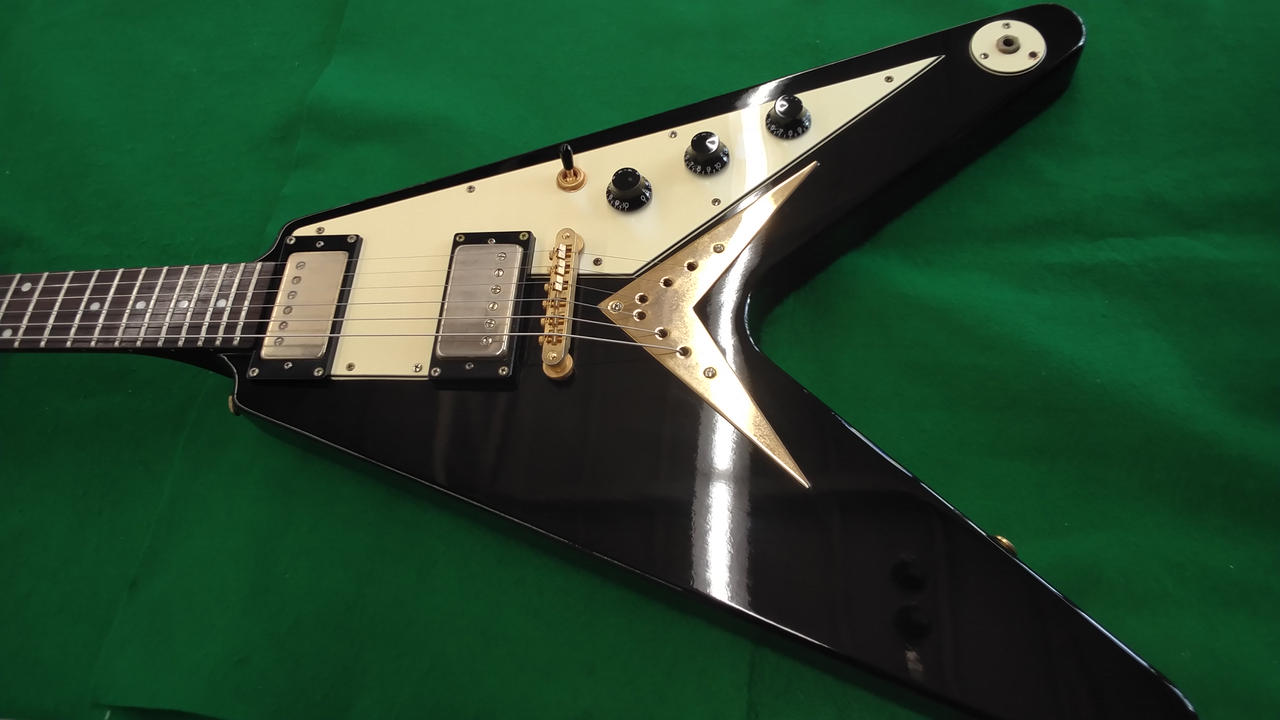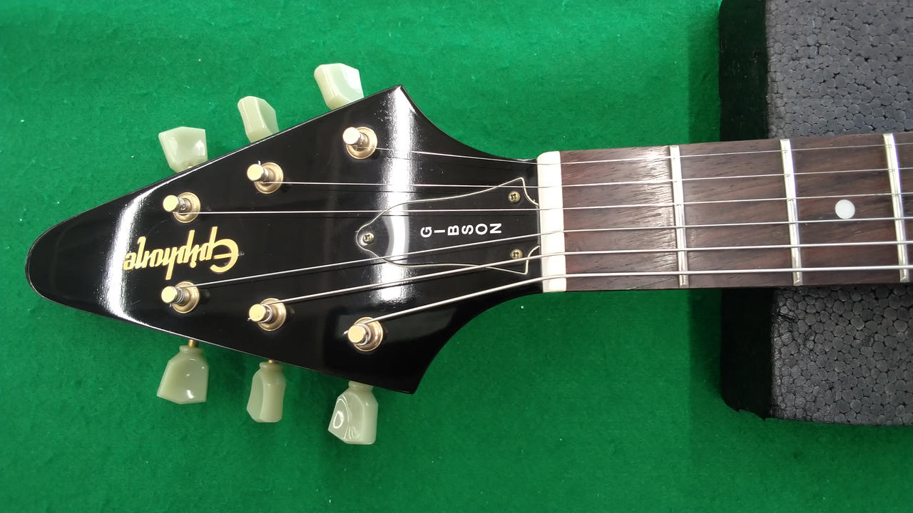 1958年に発売したGibsonオリジナルのFlying VをEpiphoneが復刻したモデル。 軽量で滑り止め付き。3弦のペグに欠けがあります。 |