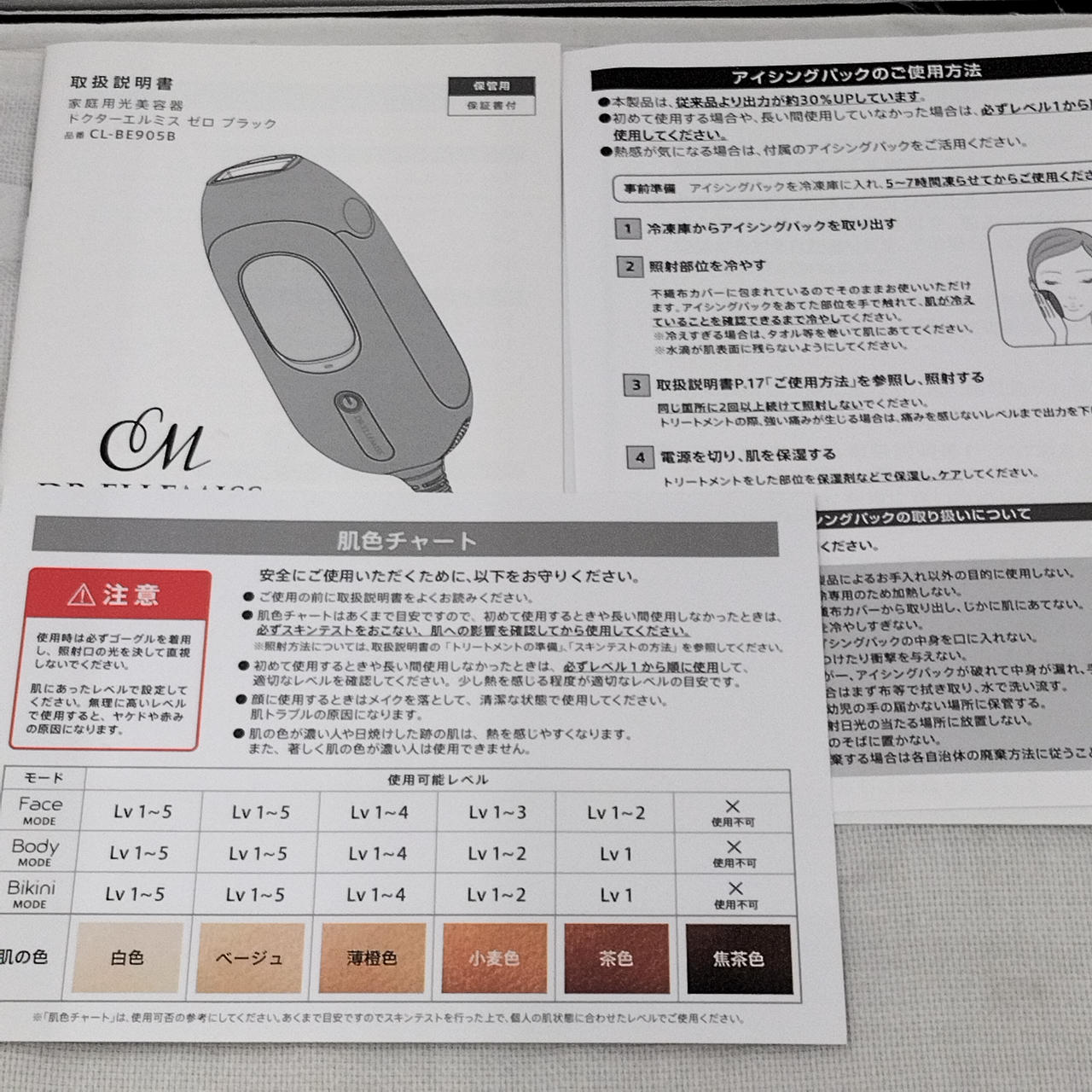 フェイス用アタッチメント ボディ/ビキニ用アタッチメント 専用ゴーグル 電源コード 肌色チャート アイシングパック |