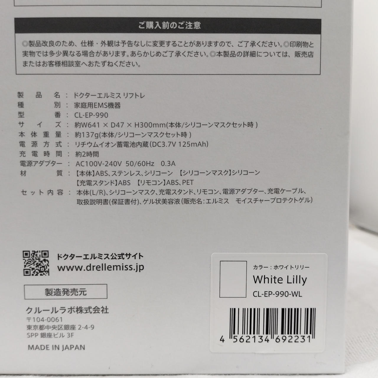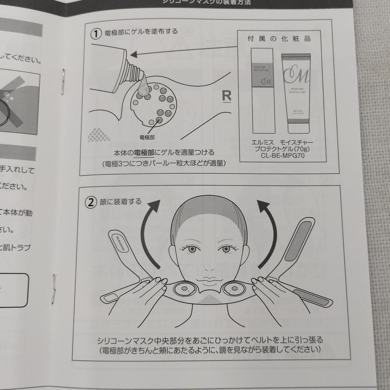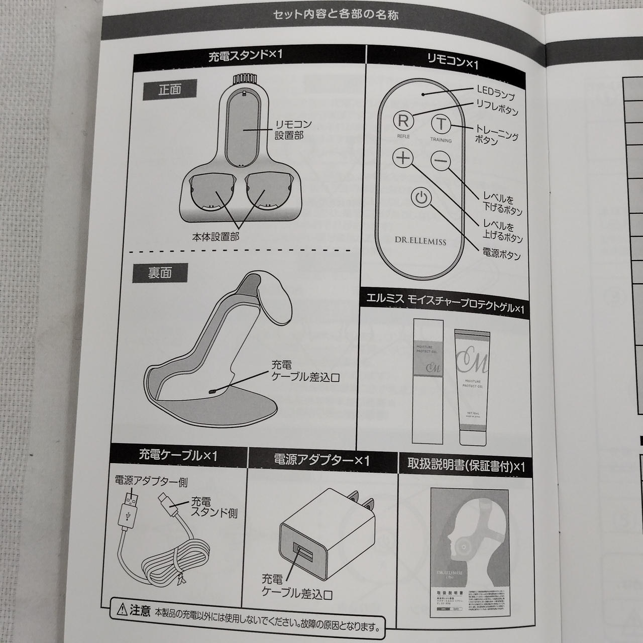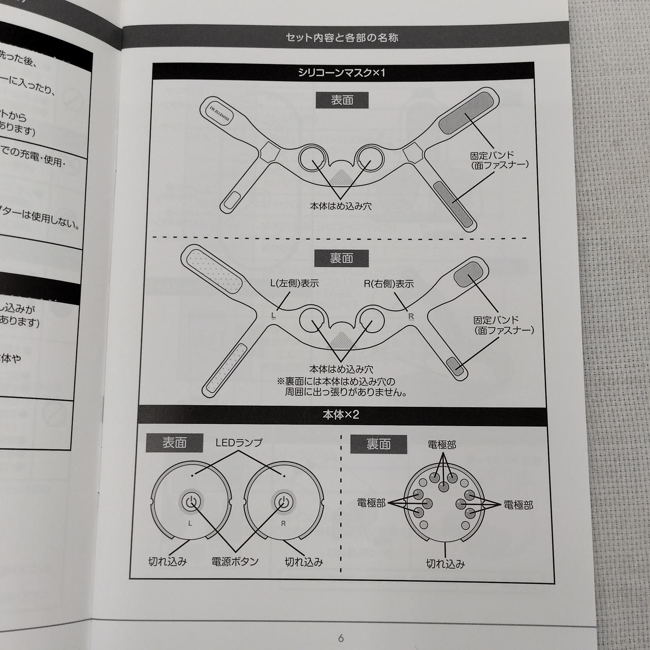 本体(L/R)、シリコーンマスク、充電スタンド、リモコン、電源アダプタ、充電ケーブル、取扱説明書、ゲル状美容液 |