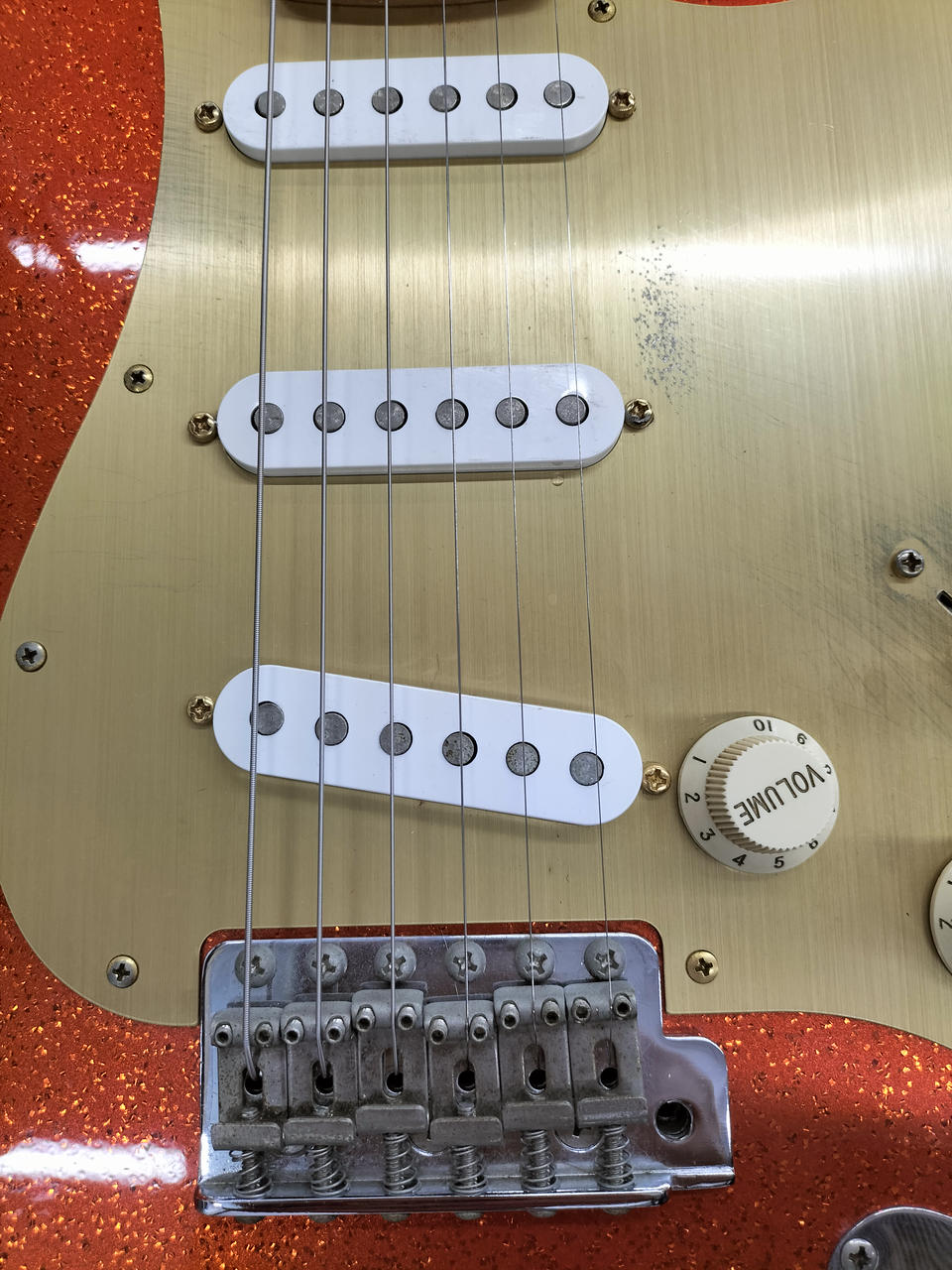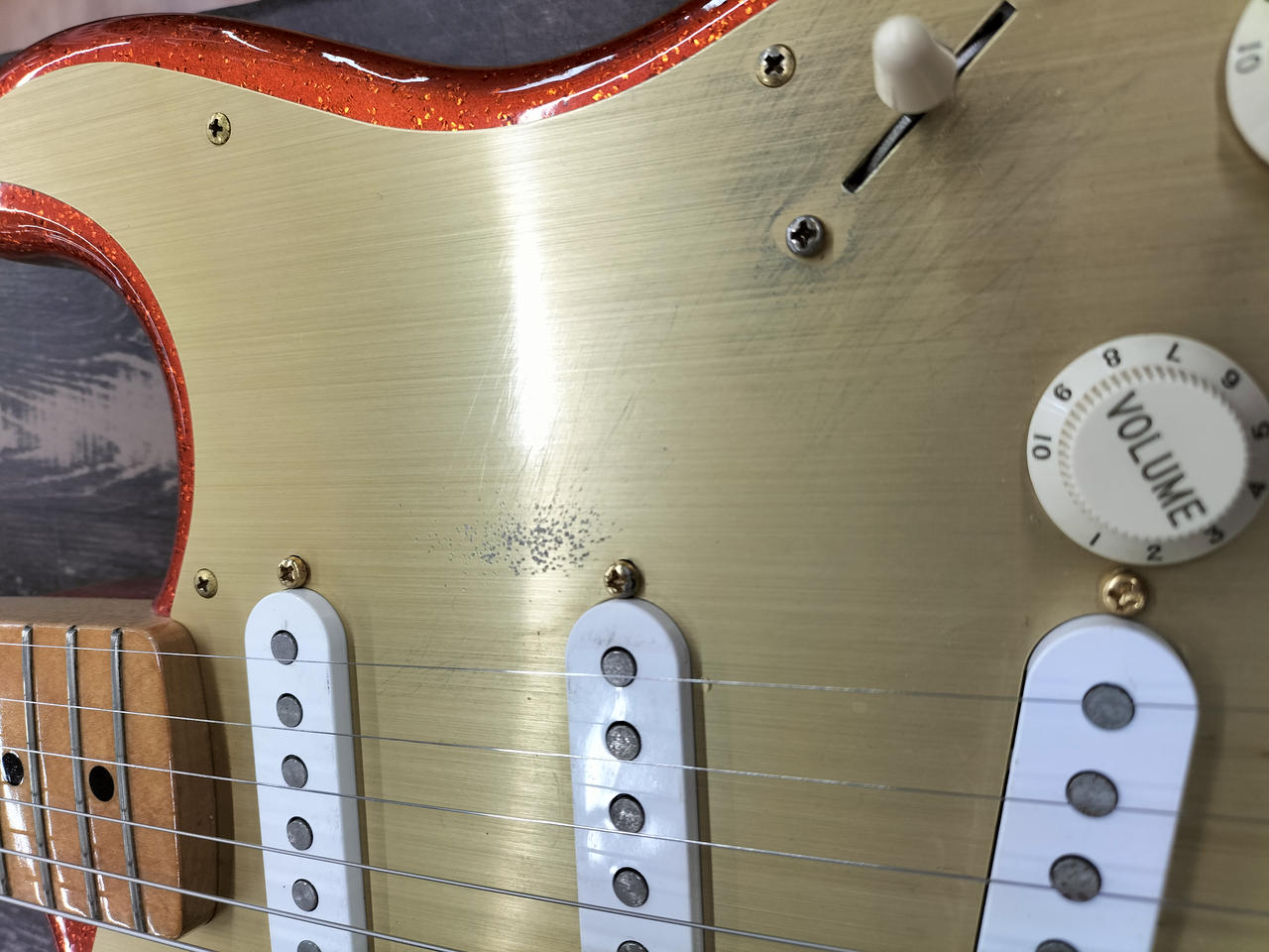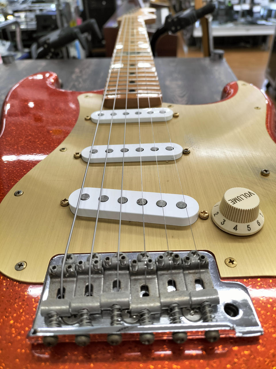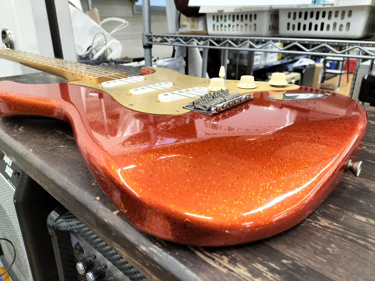 ド派手なスパークルオレンジです。トーンノブのスイッチでフロントPUをONに出来るシステムが特徴 |