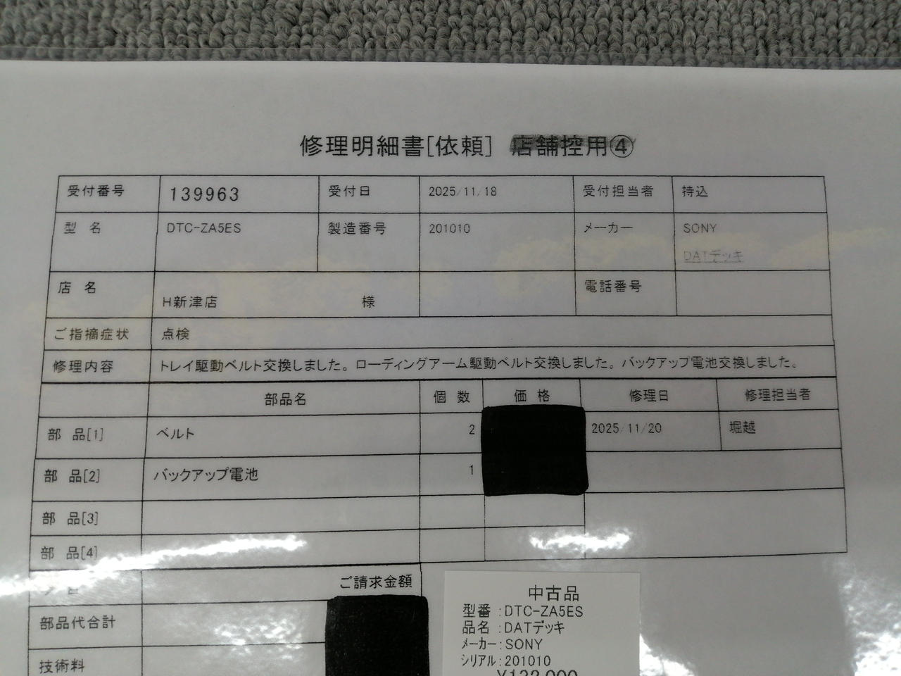 メンテナンス内容:トレイ駆動ベルト交換しました。ローディングアーム駆動ベルト交換しました。バックアップ電池交換しました。 |