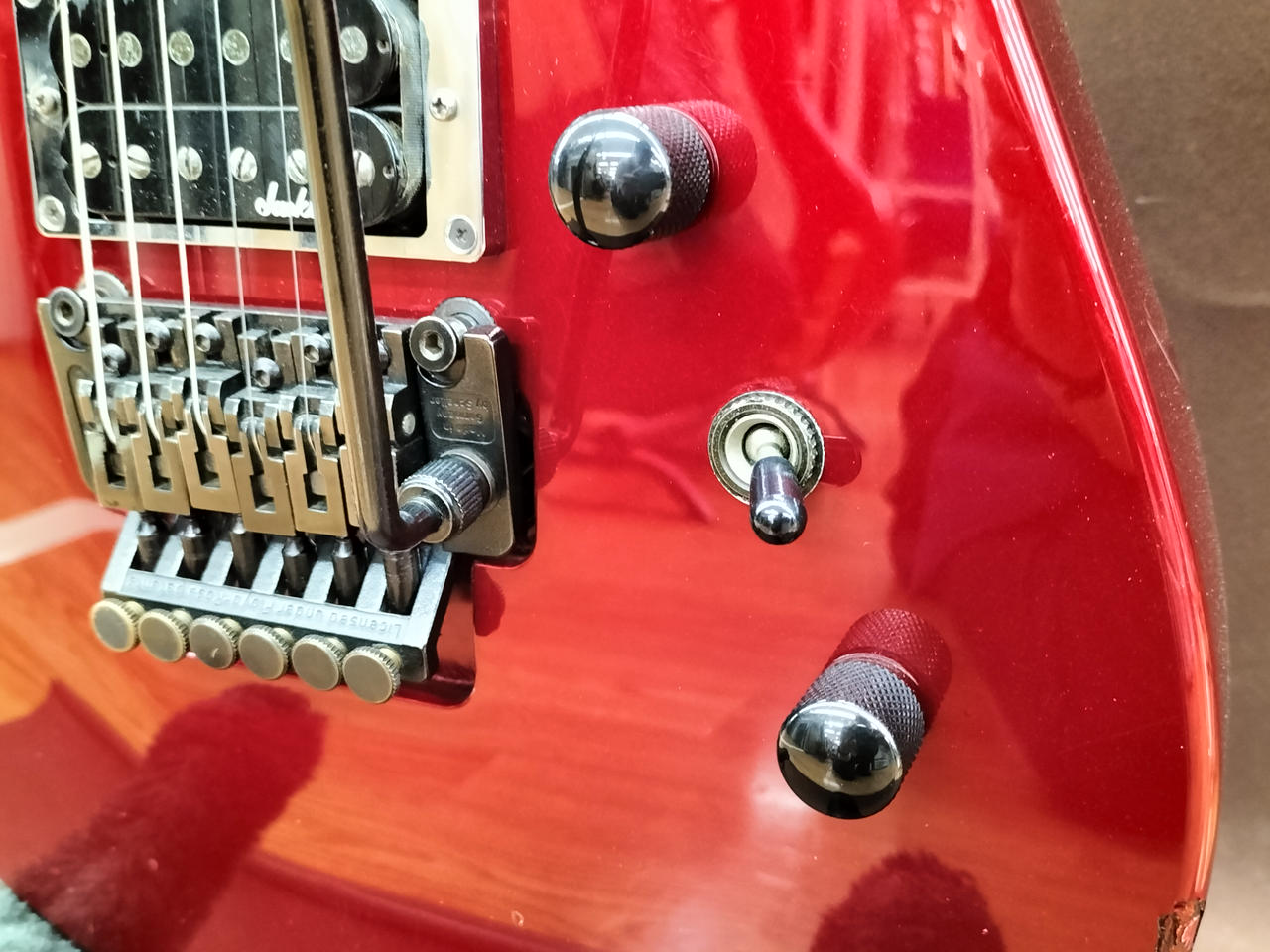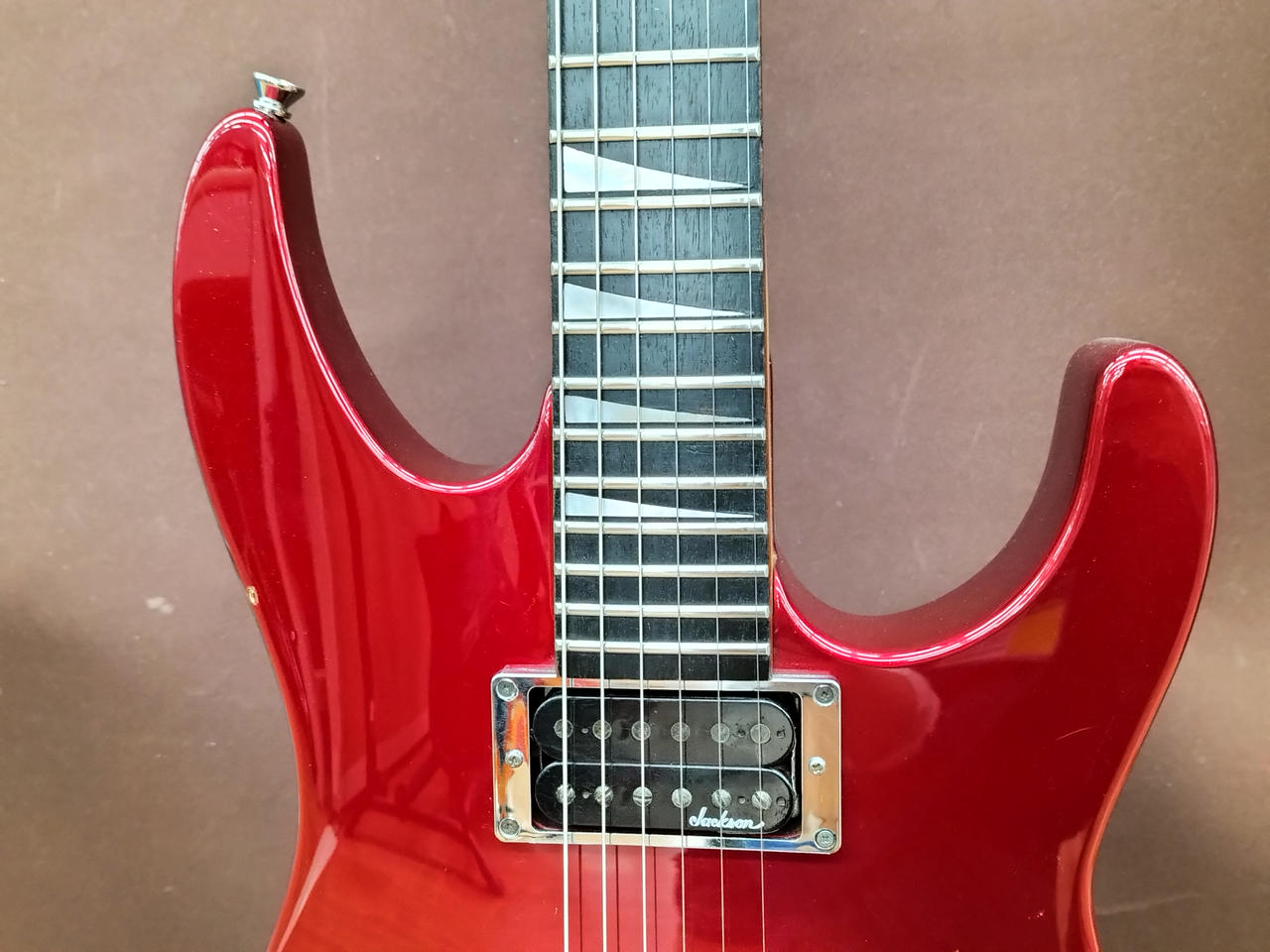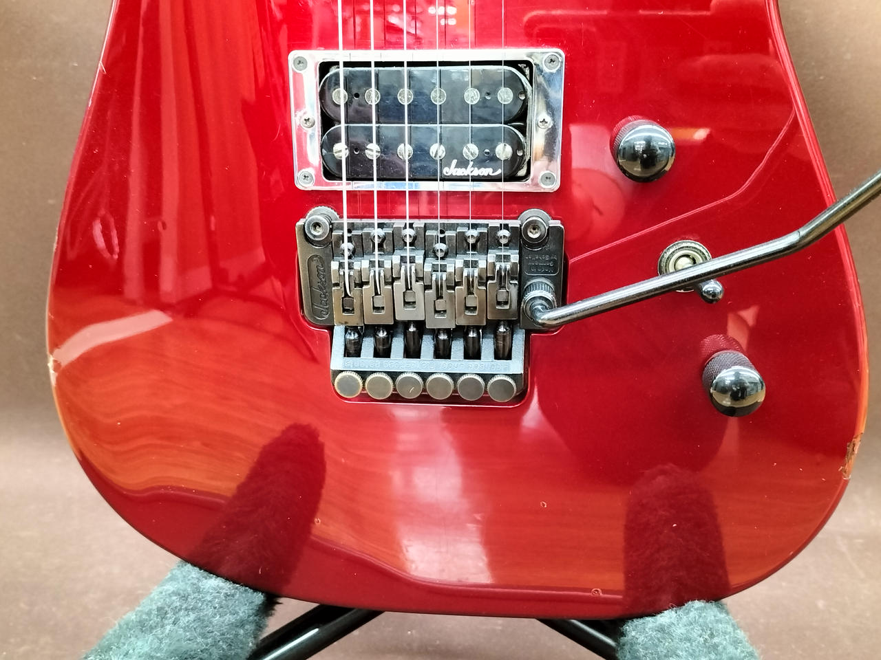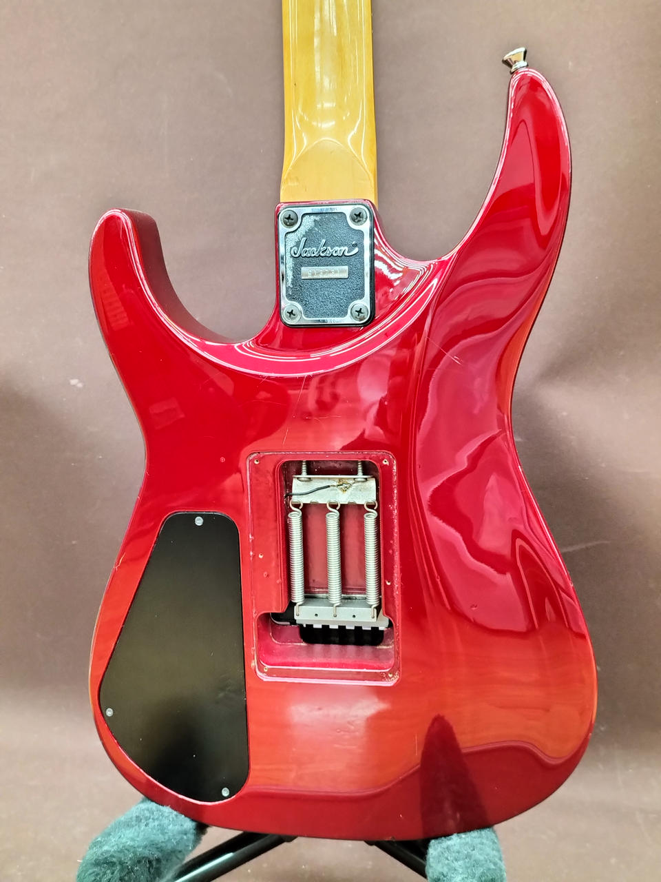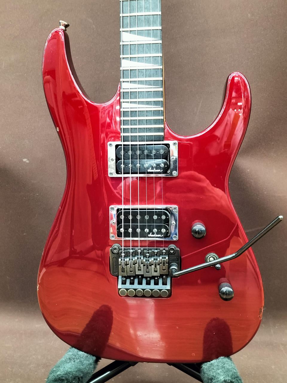 ハードロック/ヘヴィーメタルシーンを牽引してきたJACKSON!デカロゴ期の1本!SCHALLER製フロイドローズを搭載し、激しいアームプレイも難なくこなします! |