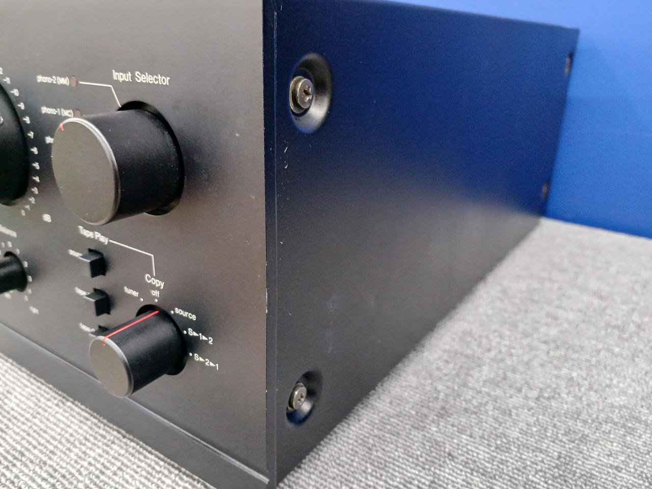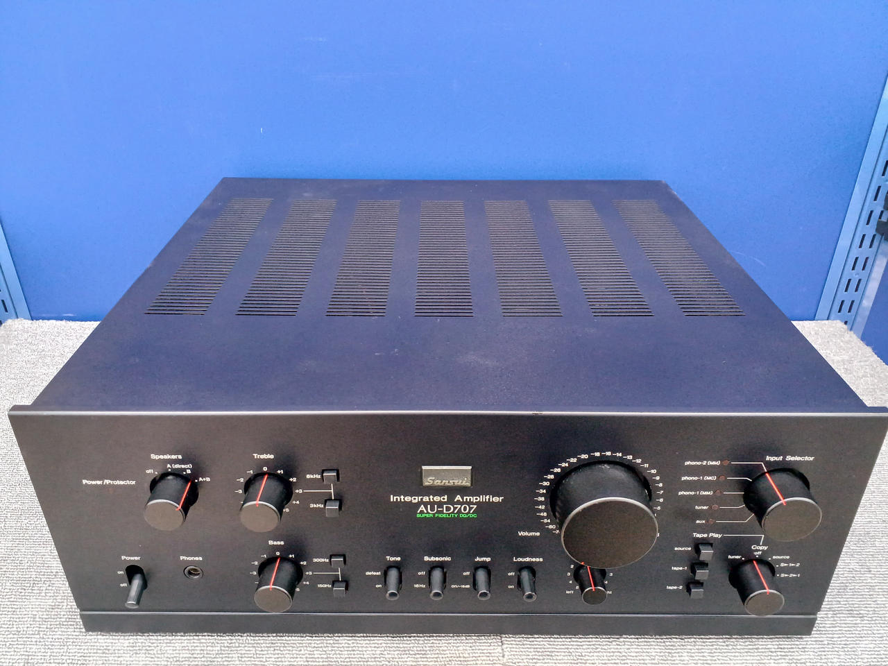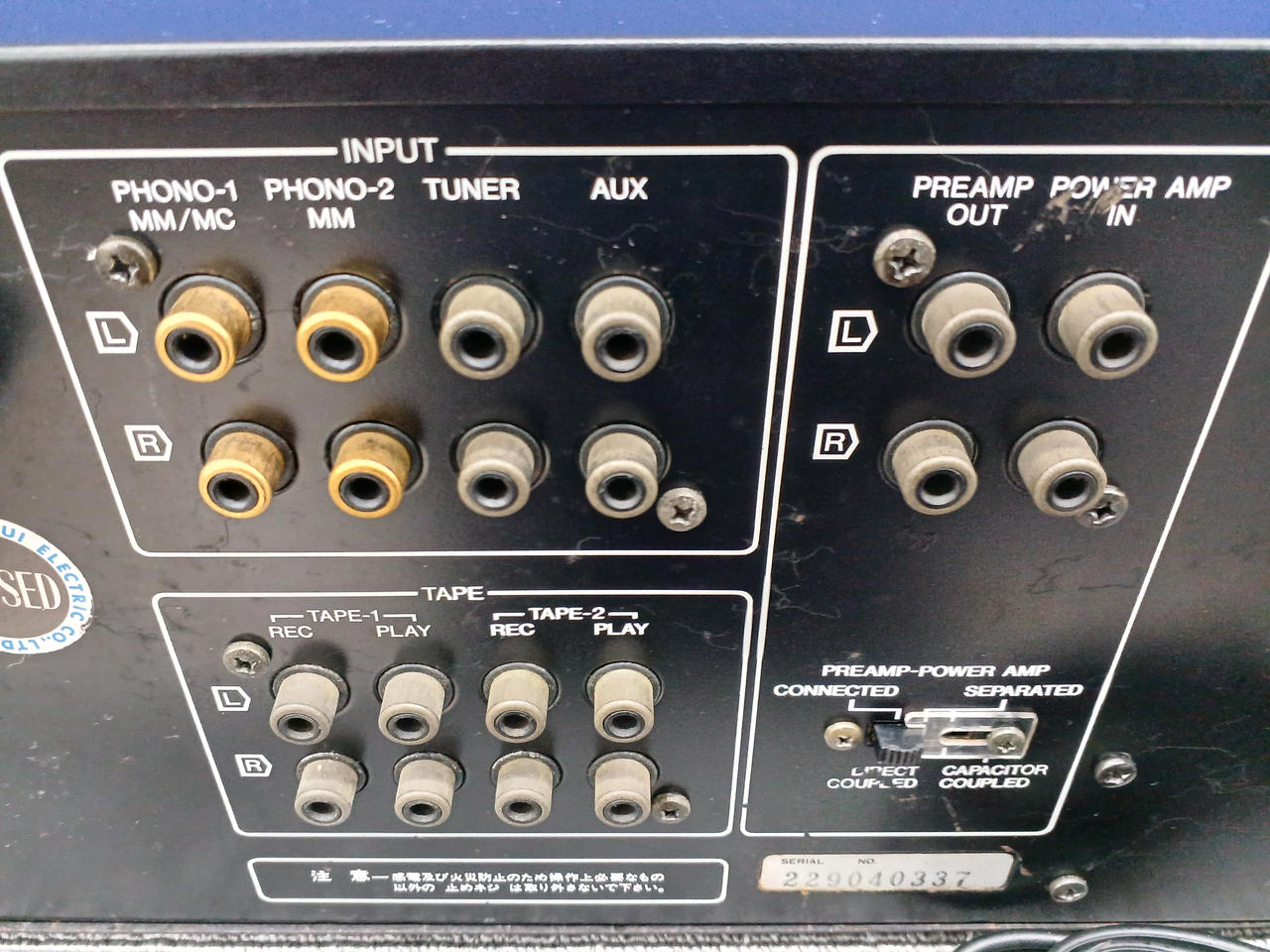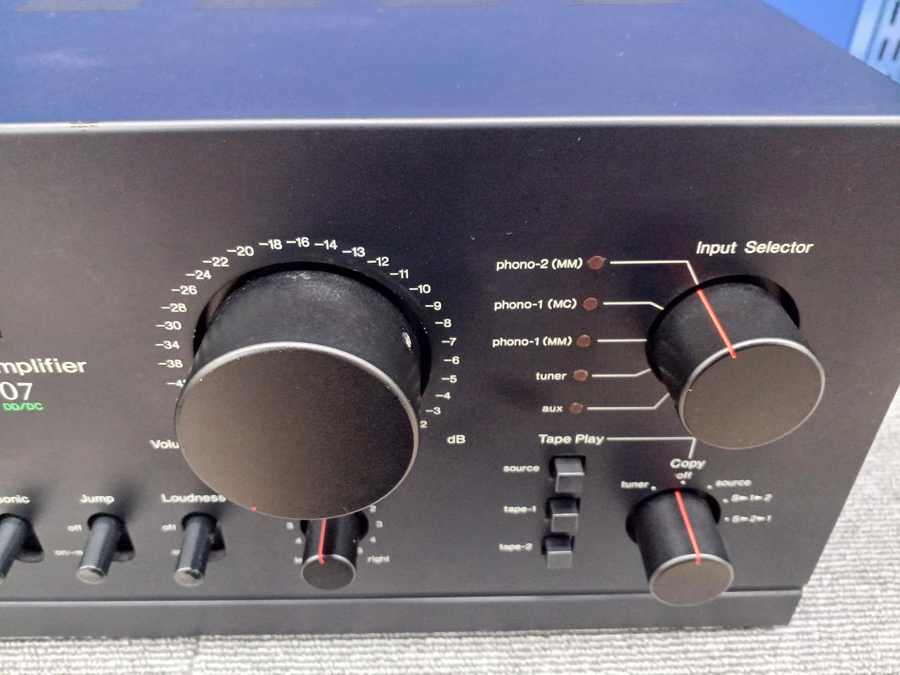 入力感度/インピーダンス(1kHz):Phono-1 MM:2.5mV/47kΩ Phono-1 MC:0.1mV/100Ω Phono-2 MM:2.5mV/47kΩ AUX、Tuner、Tape Play 1、2(PIN):150mV/47kΩ |