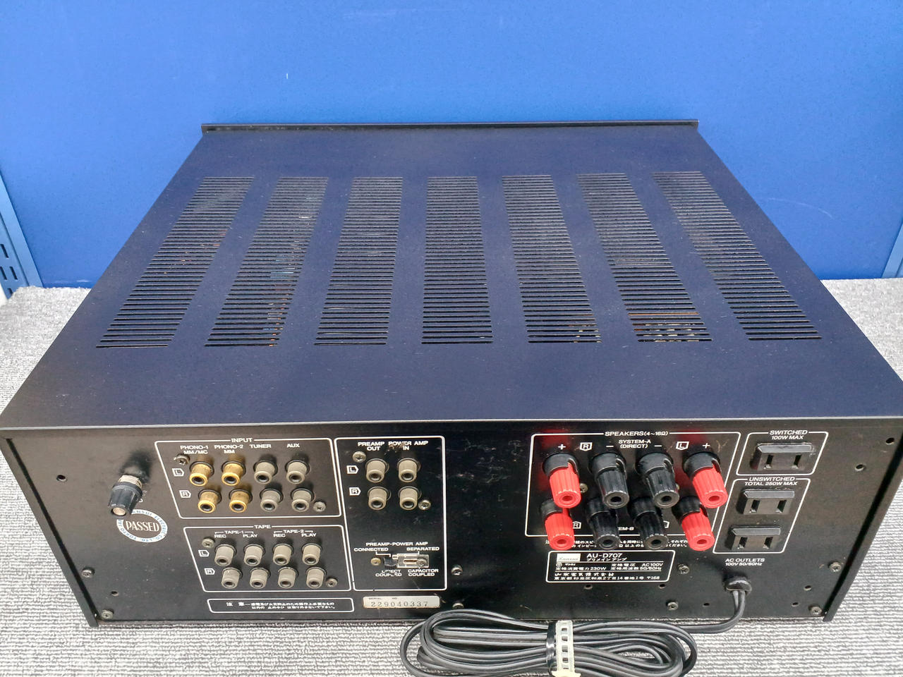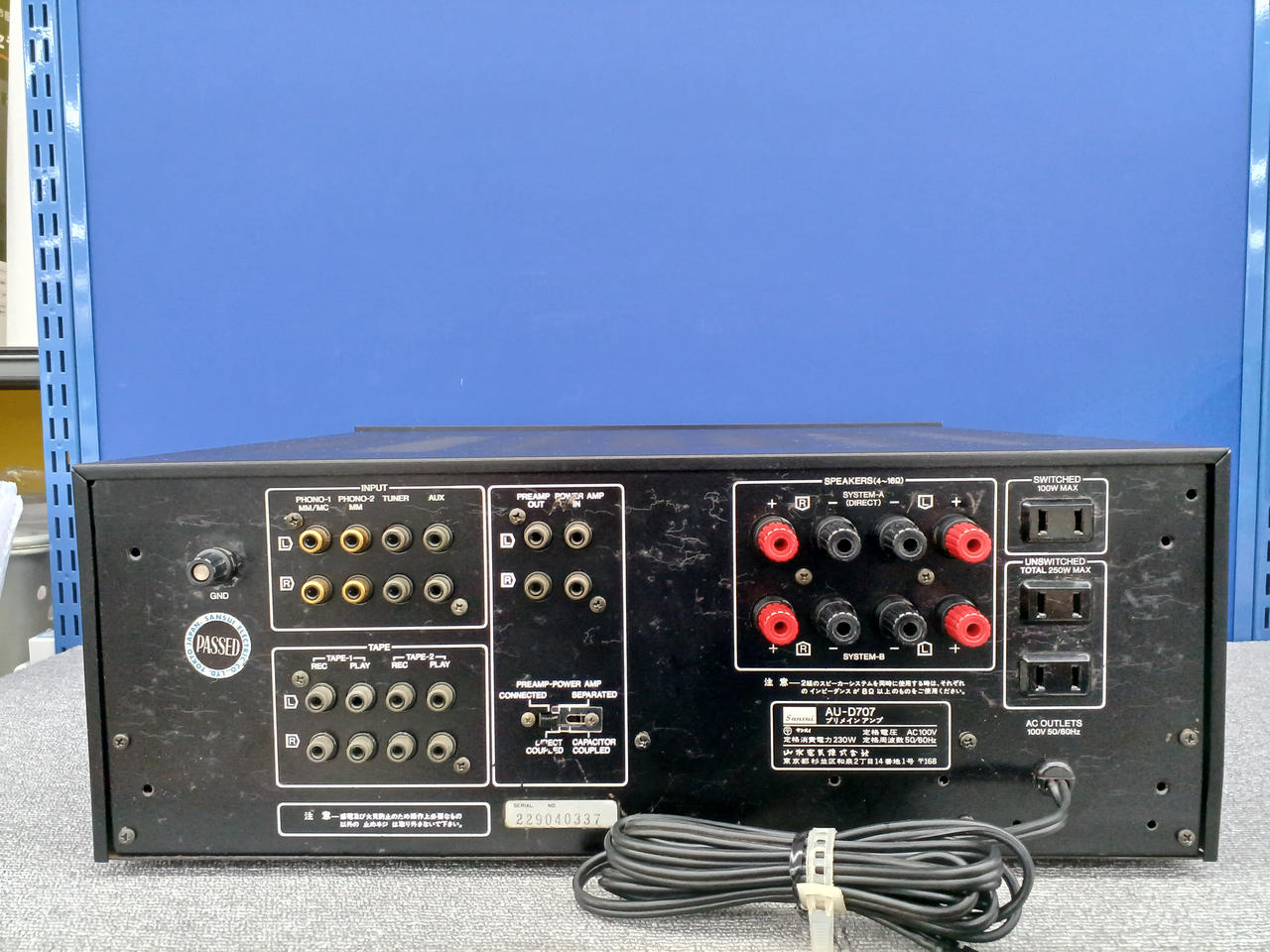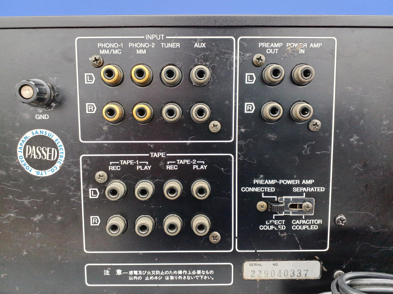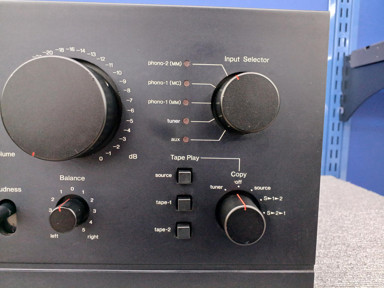 入力感度/インピーダンス(1kHz):Phono-1 MM:2.5mV/47kΩ Phono-1 MC:0.1mV/100Ω Phono-2 MM:2.5mV/47kΩ AUX、Tuner、Tape Play 1、2(PIN):150mV/47kΩ |