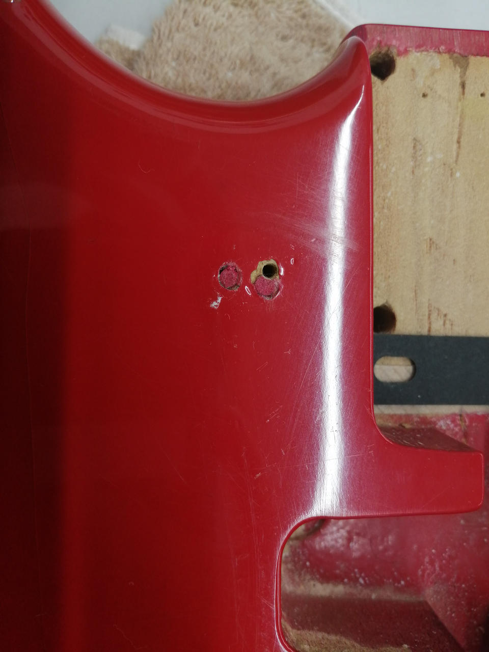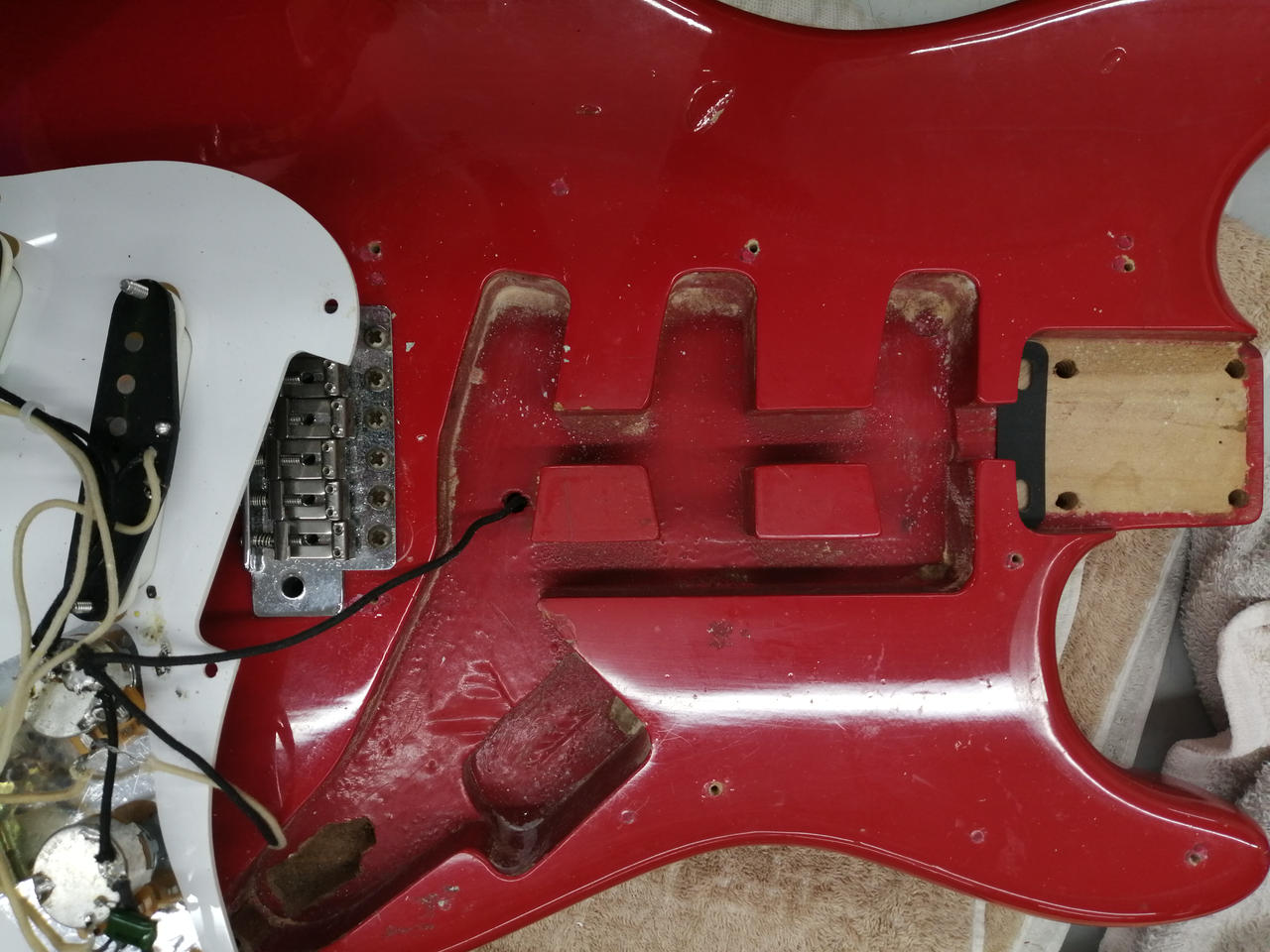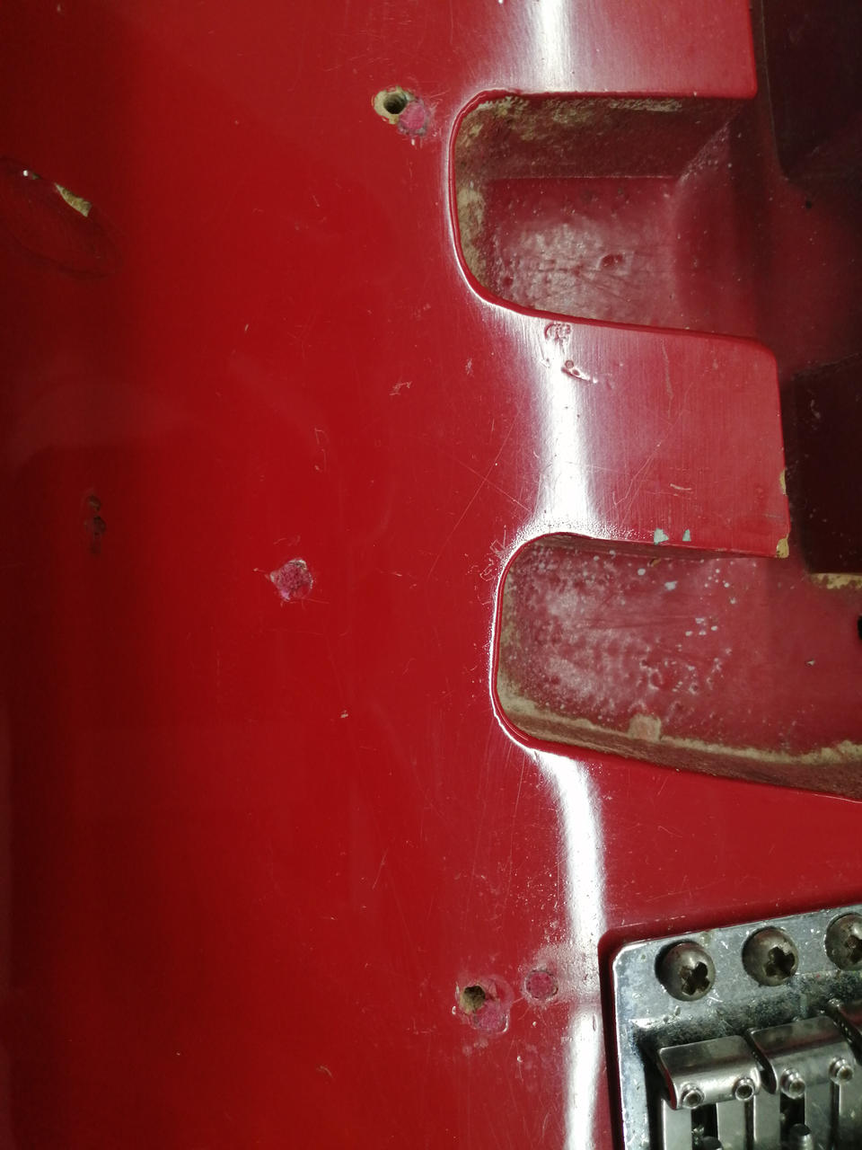 ザグリ形状や材質からボディは別物を使用したコンポーネントギターと思われます。ネックプレートやブリッジ類は当時物で、シリアルから1978年製造のネックと思われます。 |
