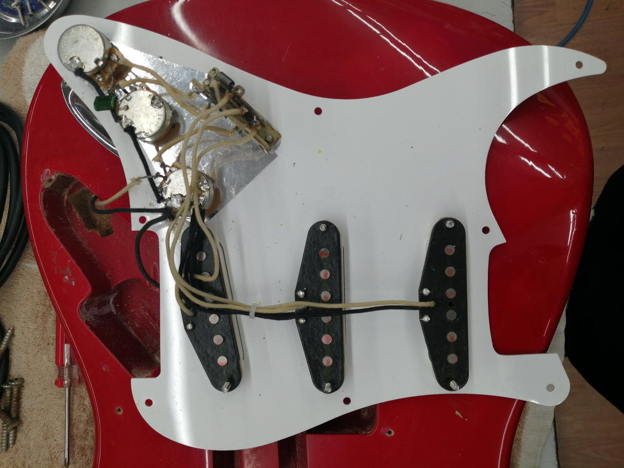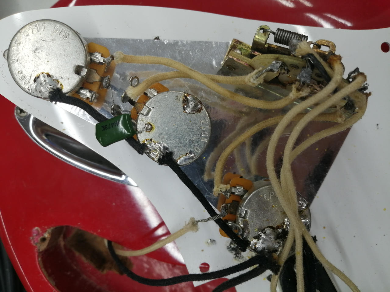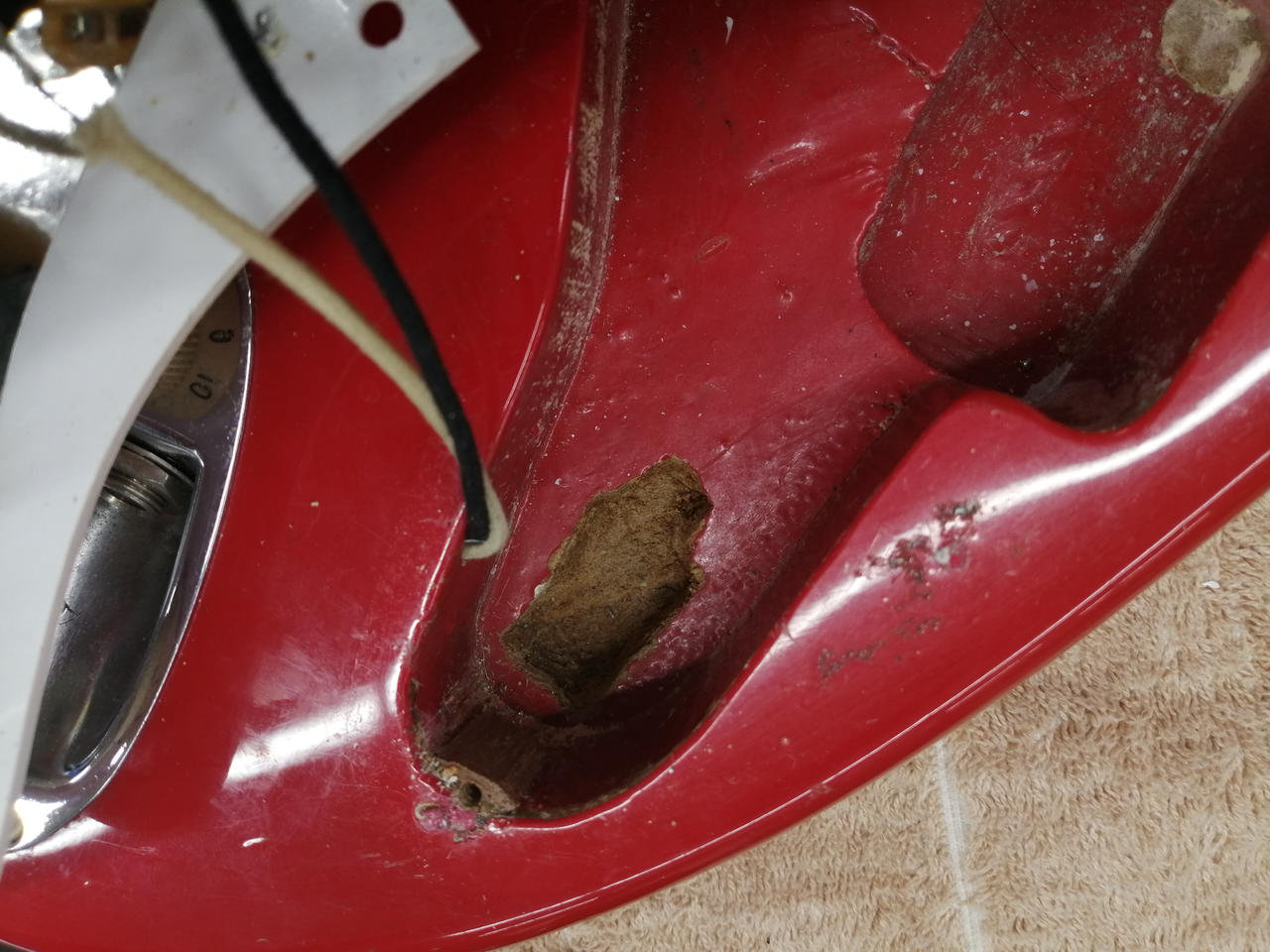 ザグリ形状や材質からボディは別物を使用したコンポーネントギターと思われます。ネックプレートやブリッジ類は当時物で、シリアルから1978年製造のネックと思われます。 |