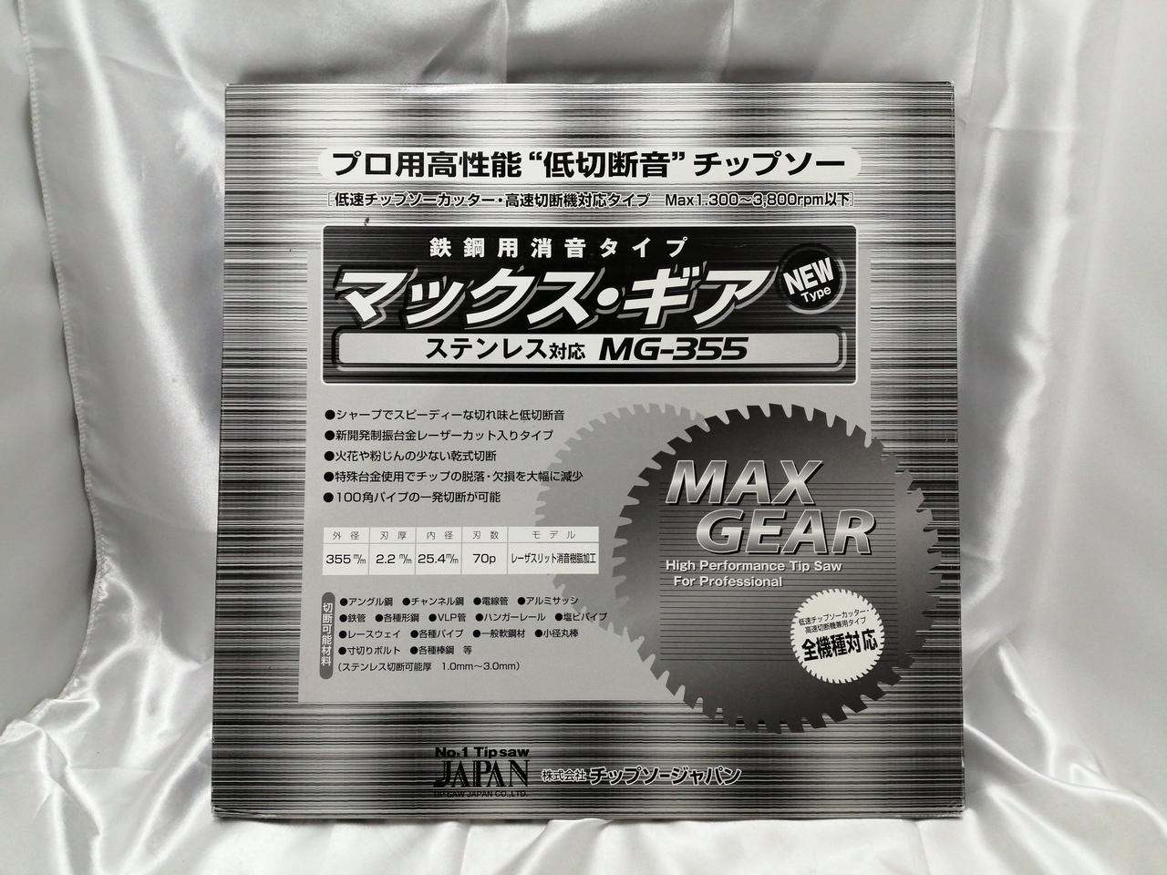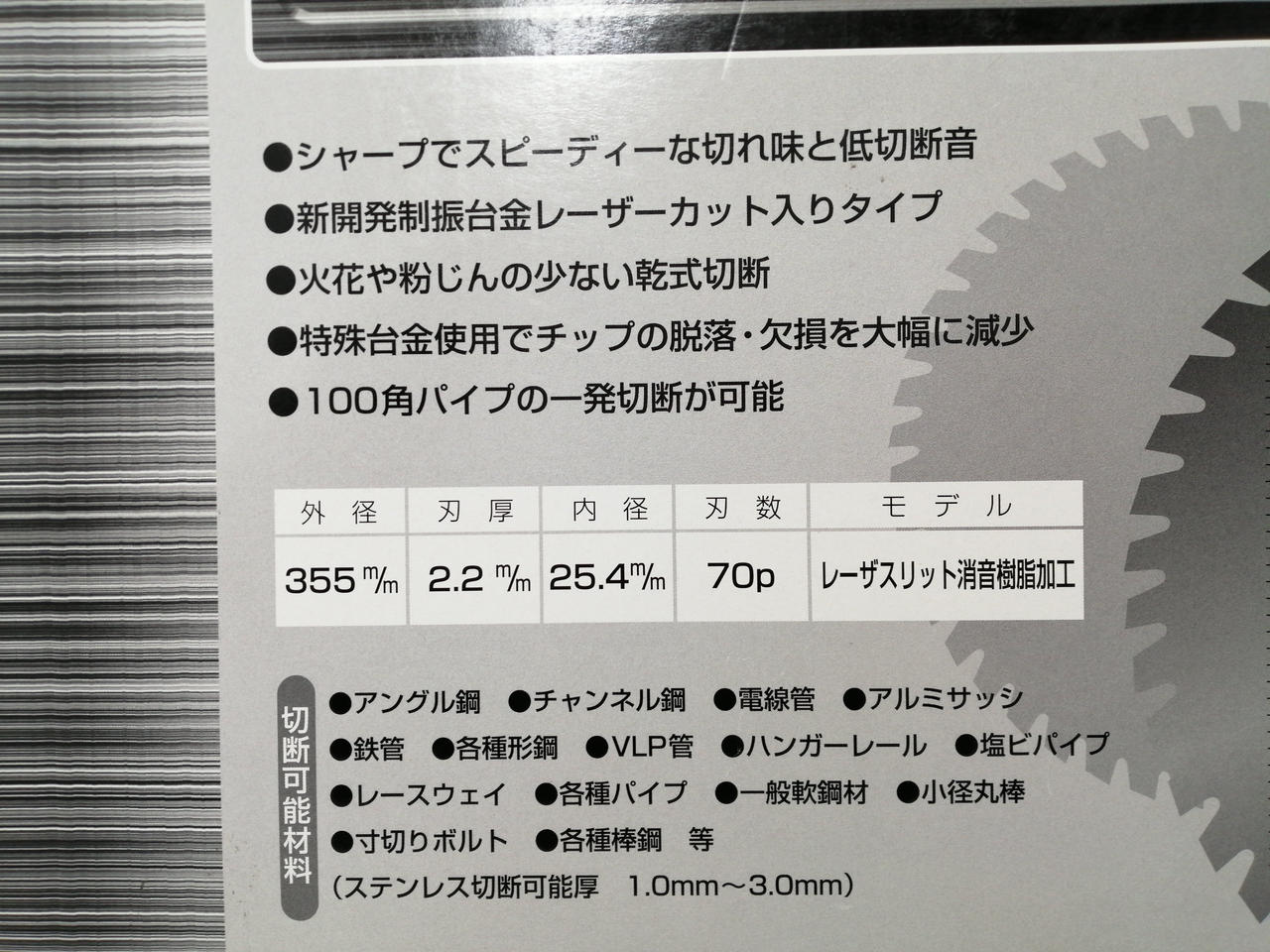 切断能力(mm)鉄鋼:10、切断能力(mm)ステンレス:6、外径(mm):355、刃厚(mm):2.2 |