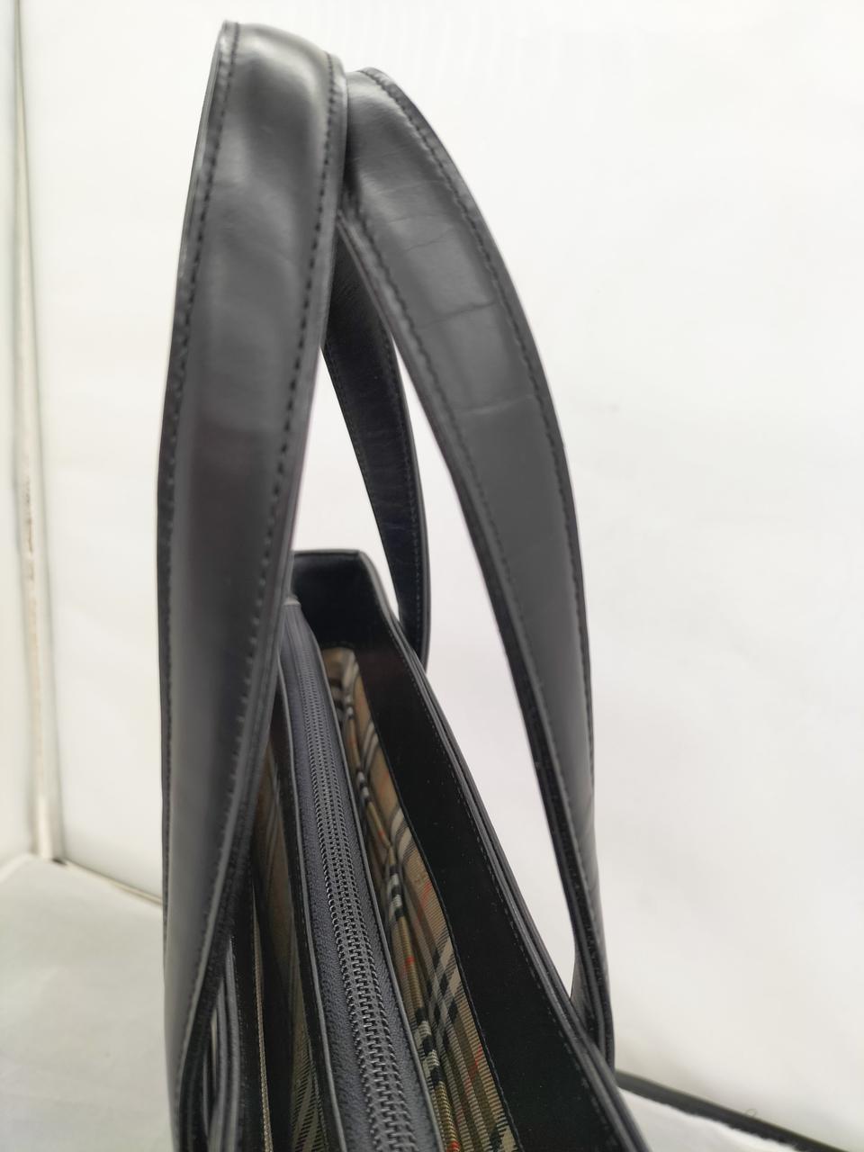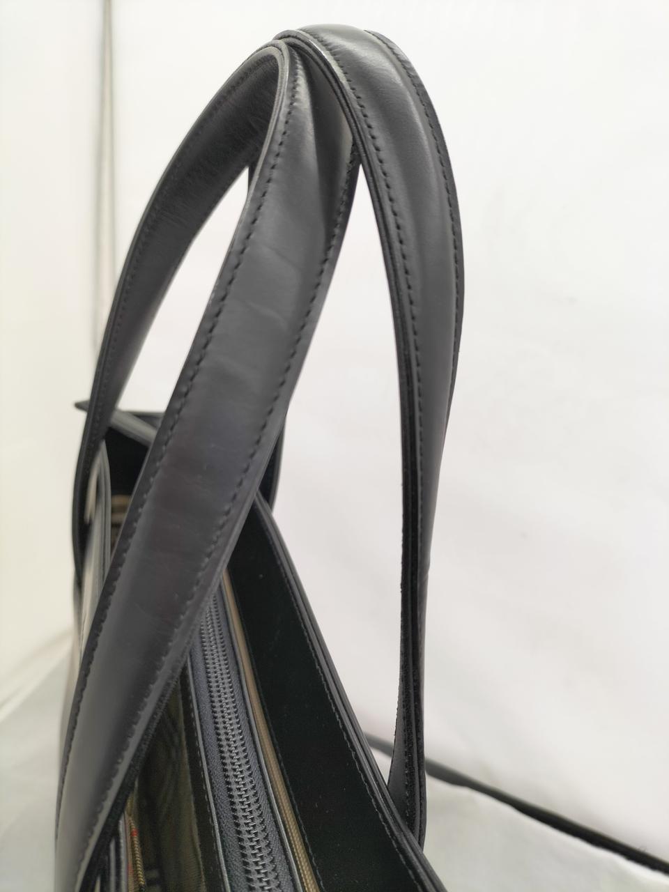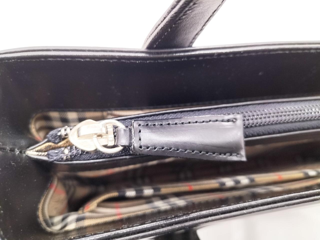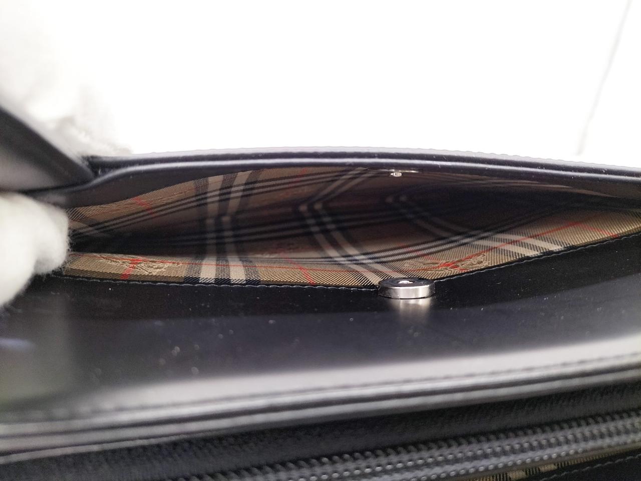 真っ黒なレザーに裏地のノヴァチェックがワンポイントで入ったシックなバッグです。