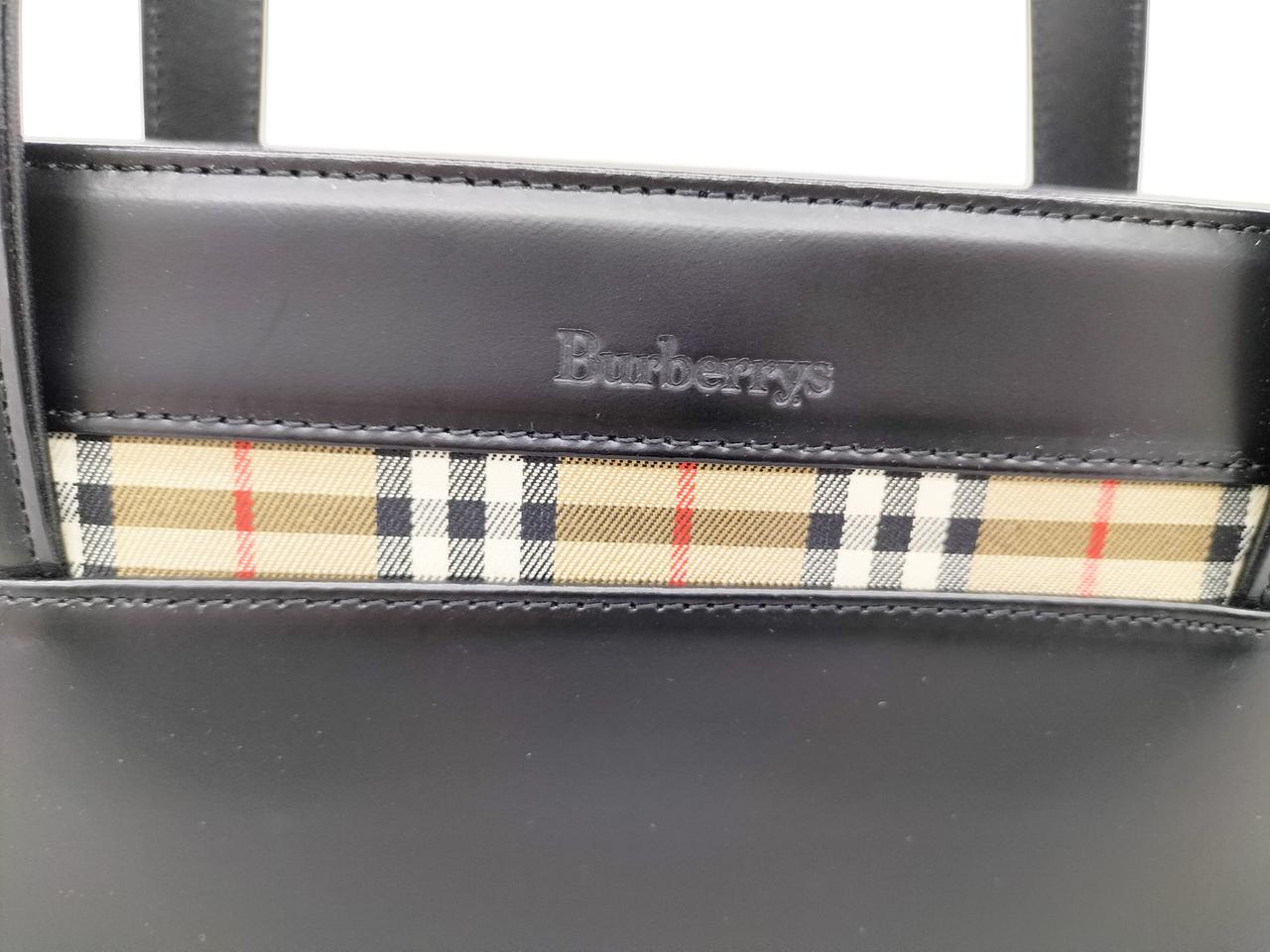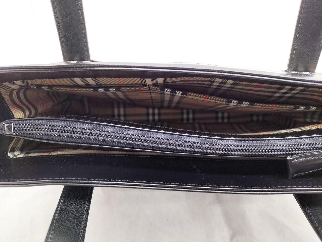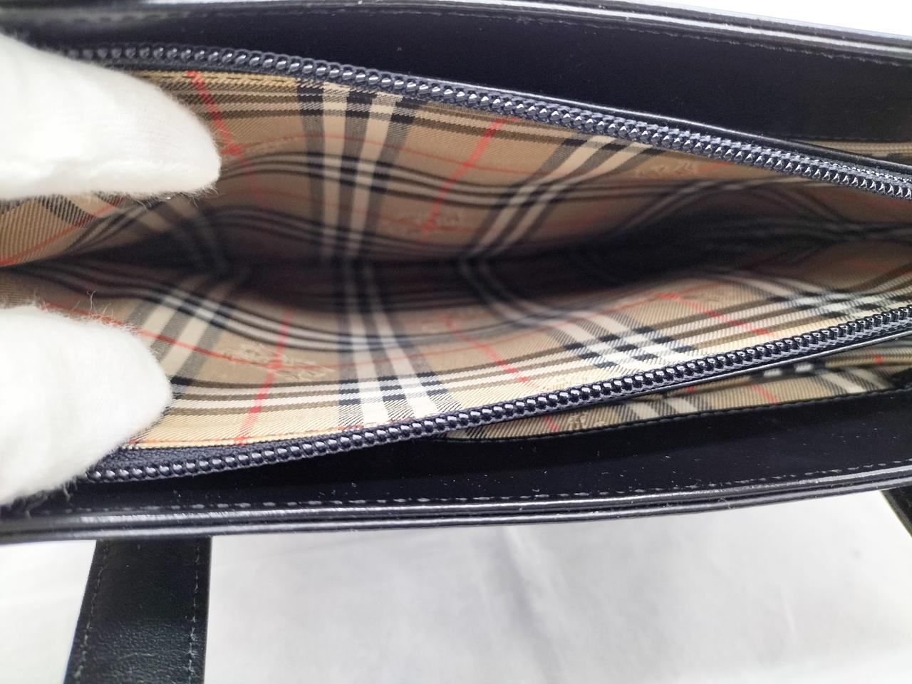 真っ黒なレザーに裏地のノヴァチェックがワンポイントで入ったシックなバッグです。