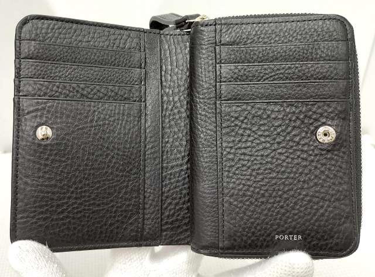 二つ折りウォレットはコンパクトな見た目ながらも、カード収納部を多数備えた手馴染みの良いサイズです。ホックで開閉できるカード収納部を備えています。コインポケットはマチ付きで、内装に仕切りを設けているため仕分けがしやすく機能的に使えます。 |