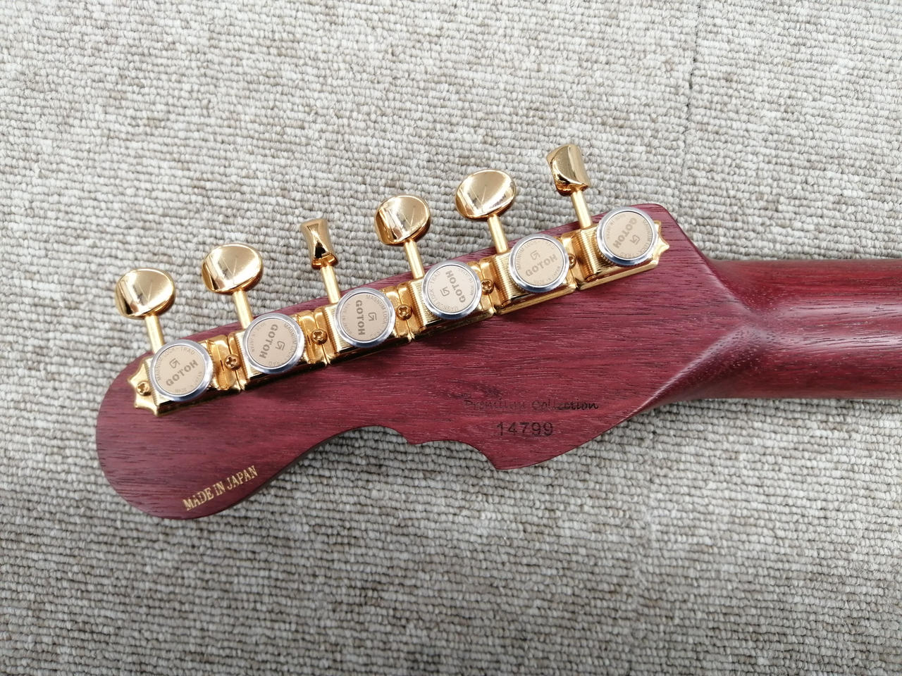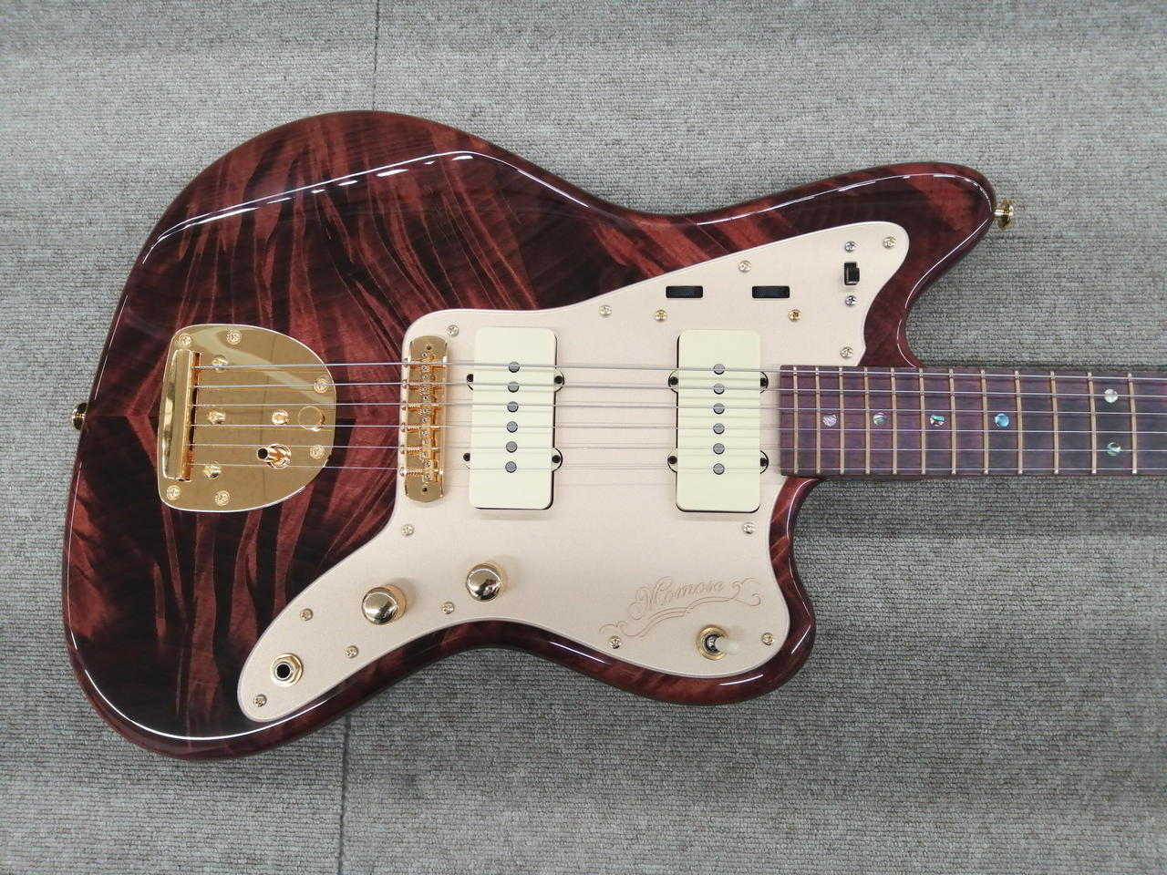 白味の強いトチ材のワイドなフレイム杢を、深みのあるレッド着色で際立たせた一本。 |