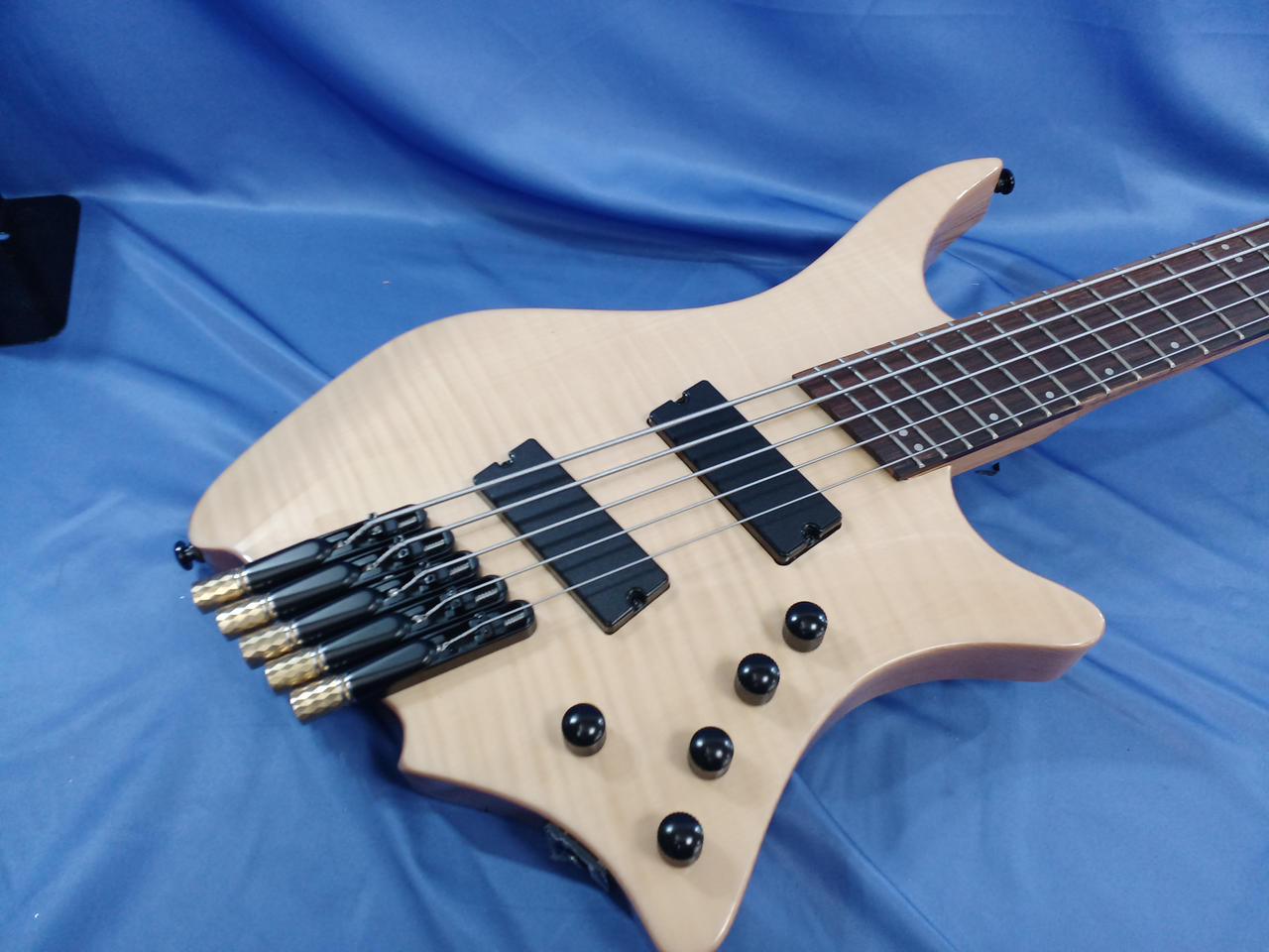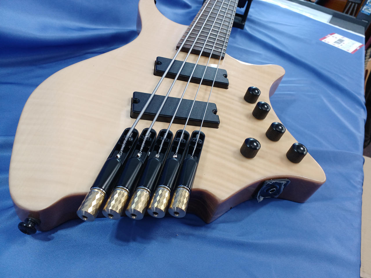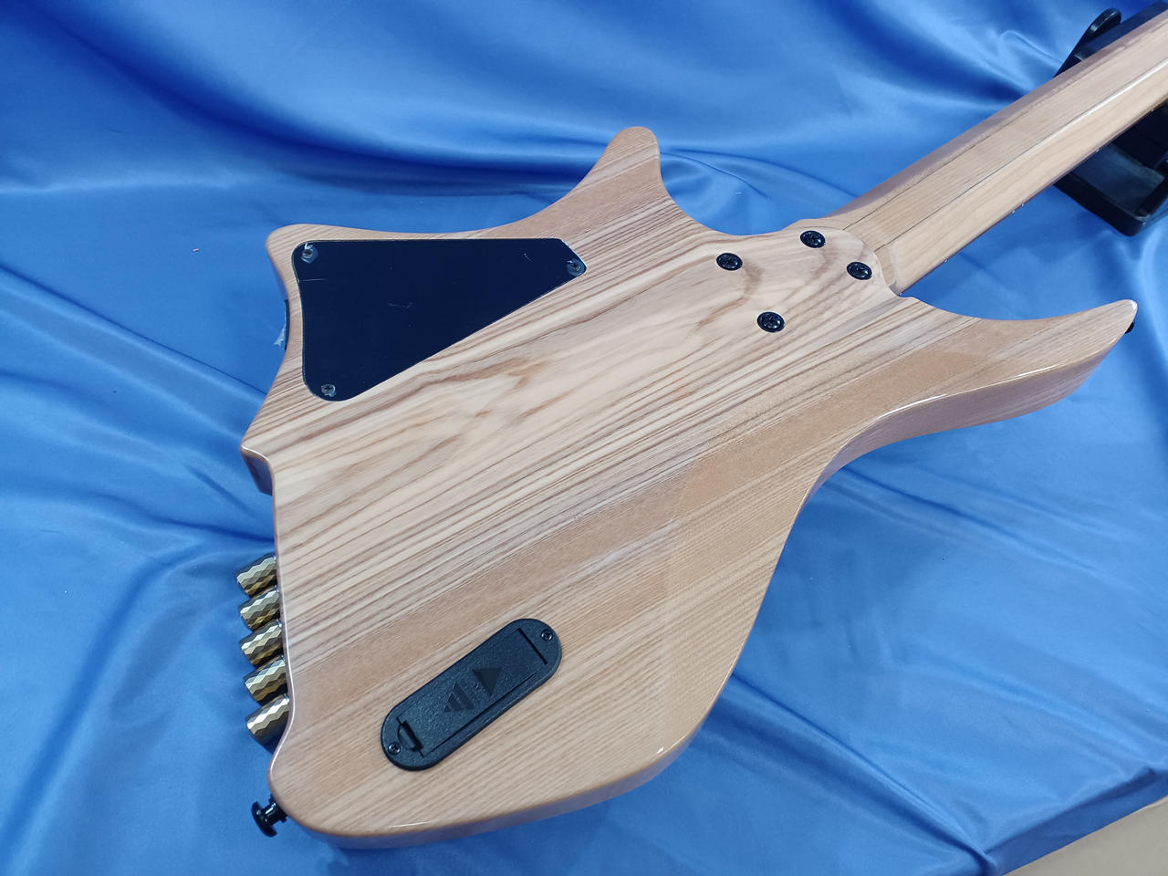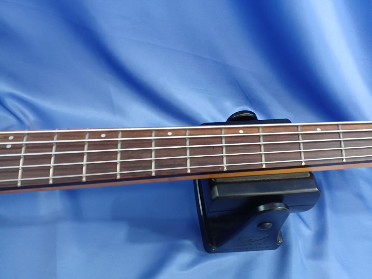 個人製作された謎のヘッドレスベース。近年はやりのファンドフレット搭載で、チューニングの安定感が向上します! |