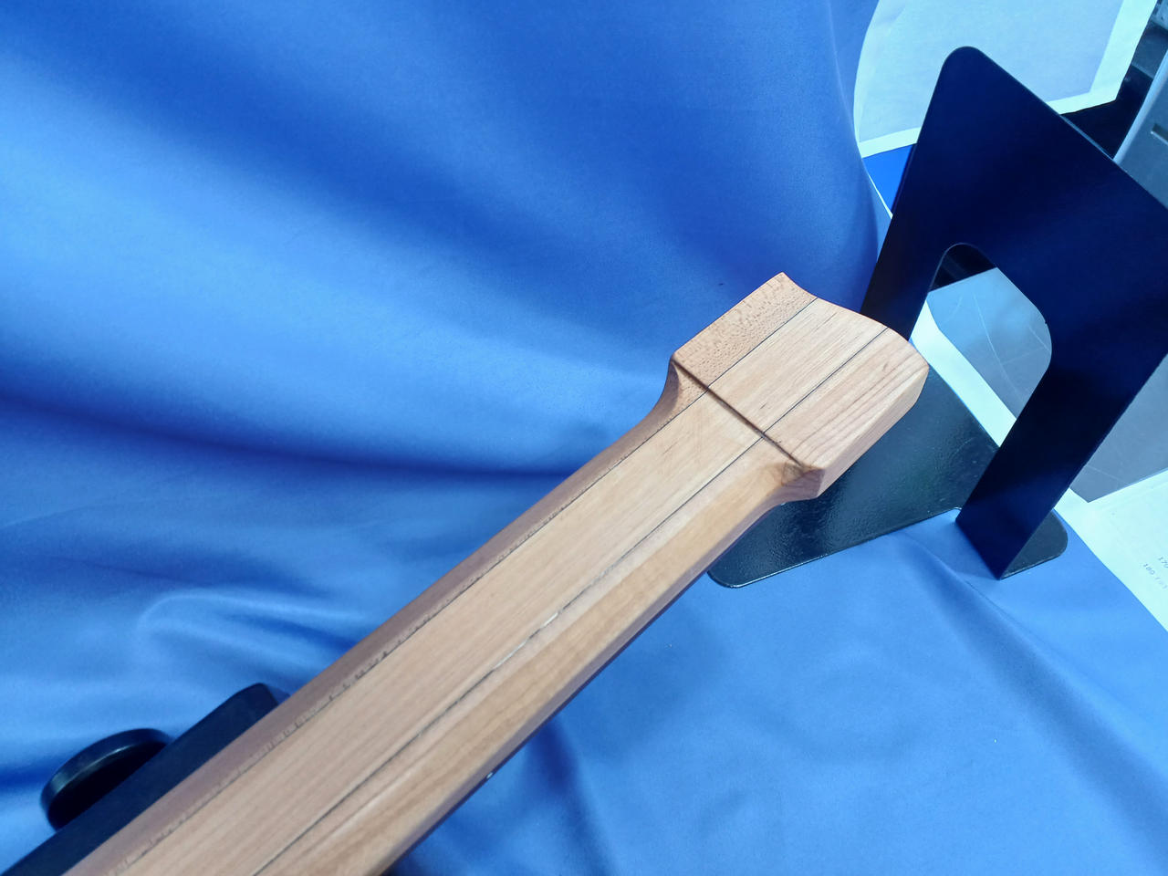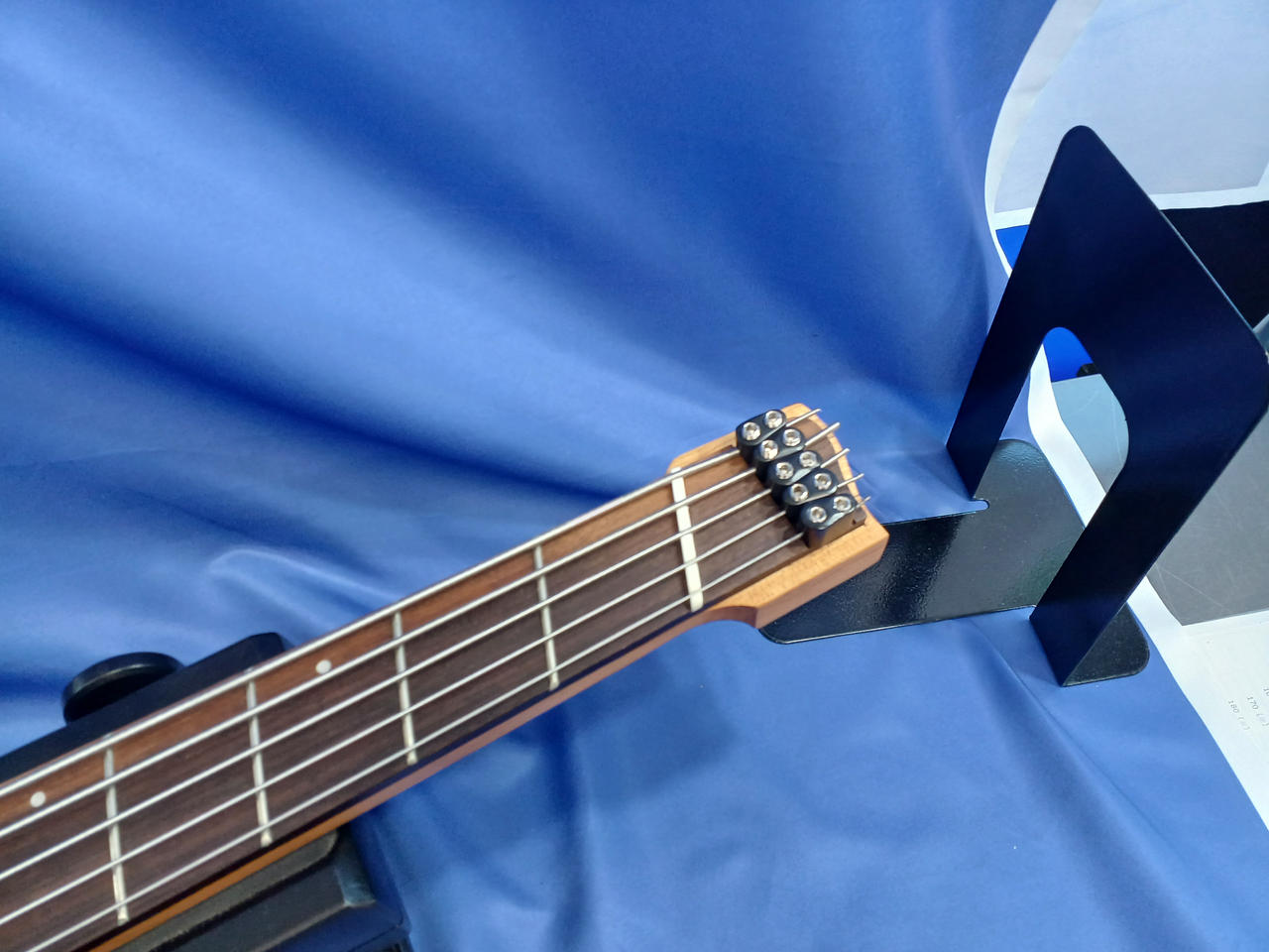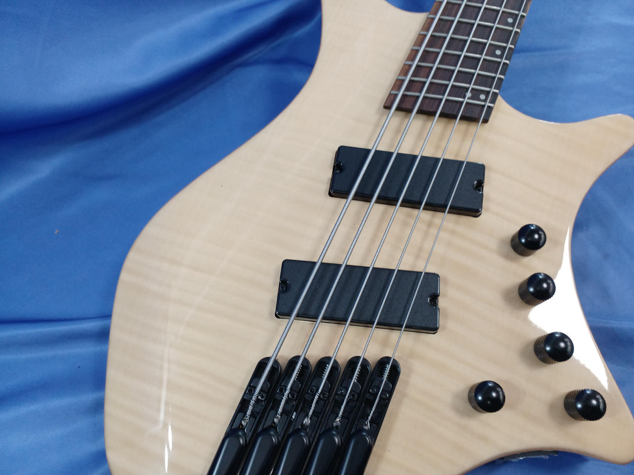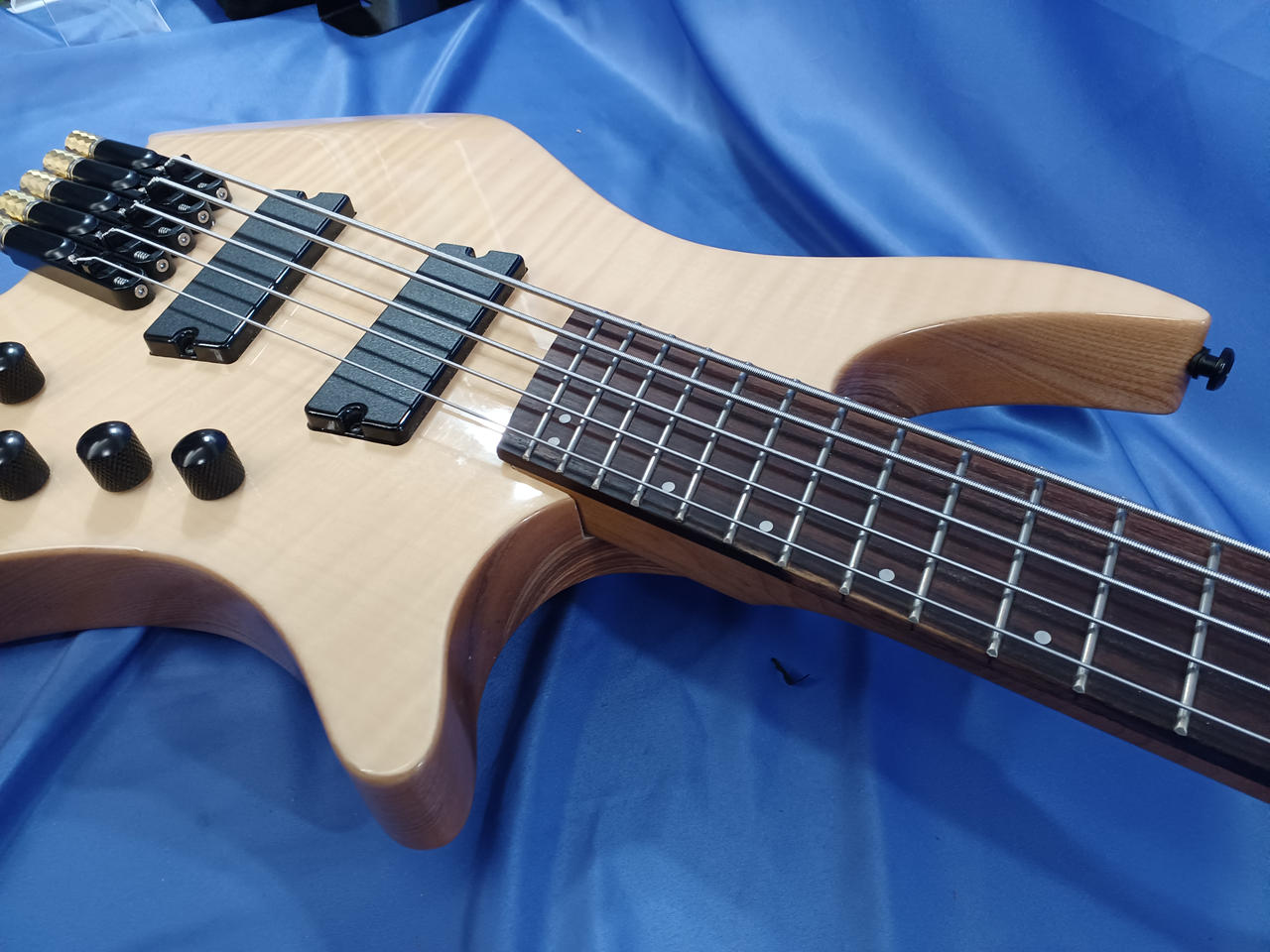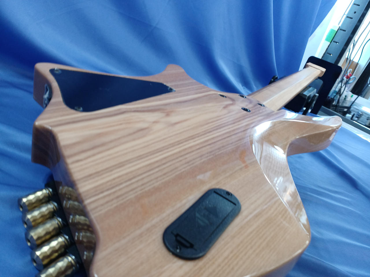 個人製作された謎のヘッドレスベース。近年はやりのファンドフレット搭載で、チューニングの安定感が向上します! |