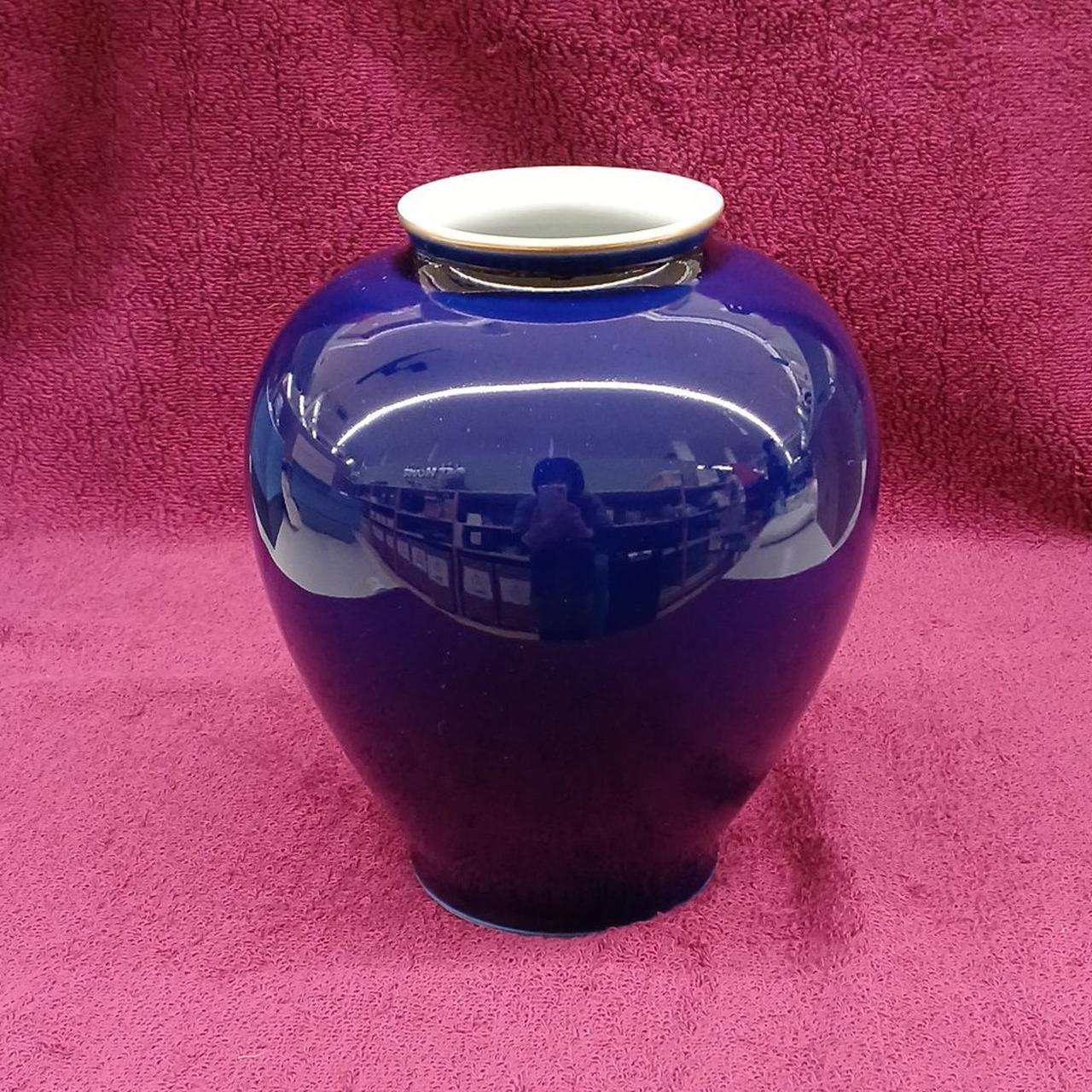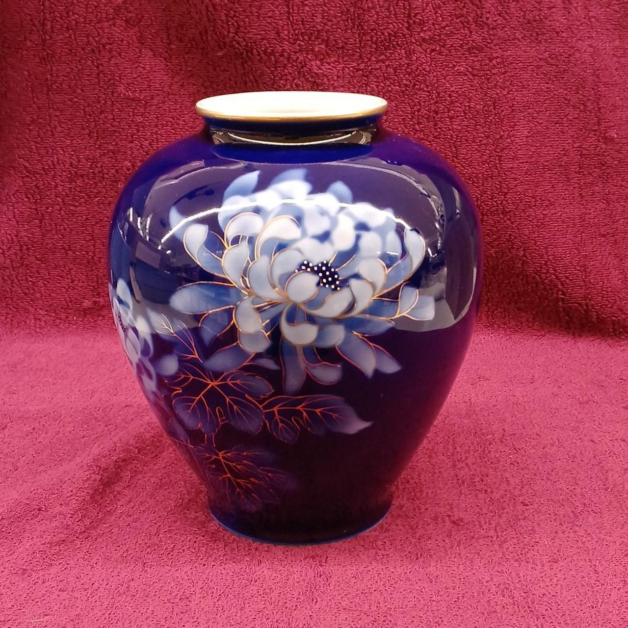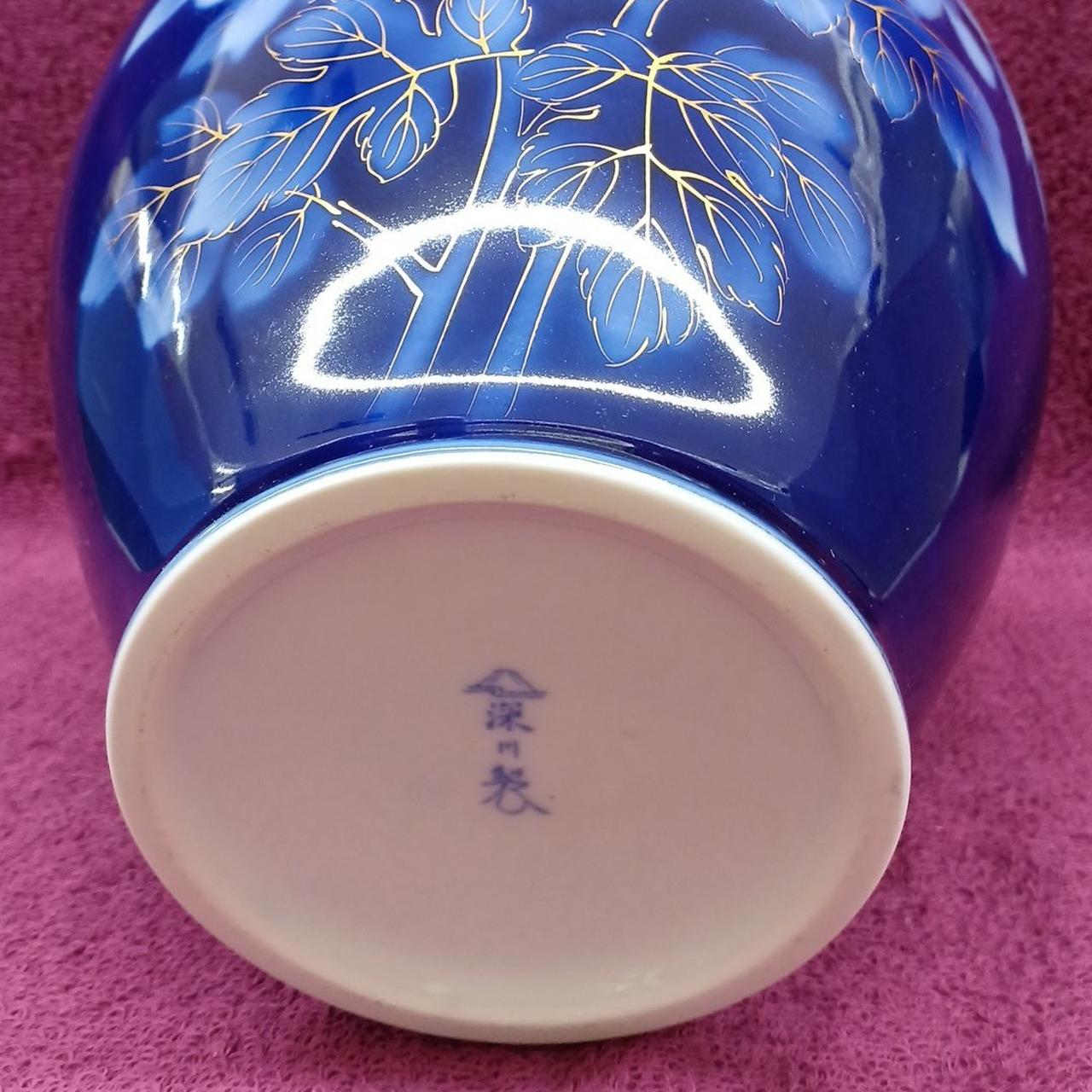 深いブルーとゴールドが美しい絵柄の花瓶です