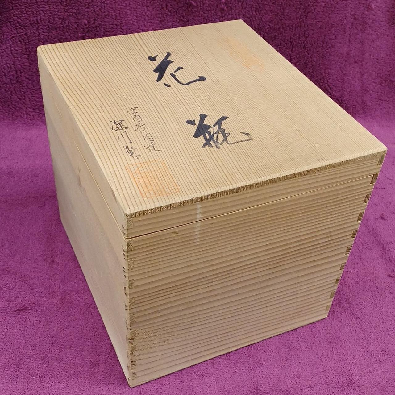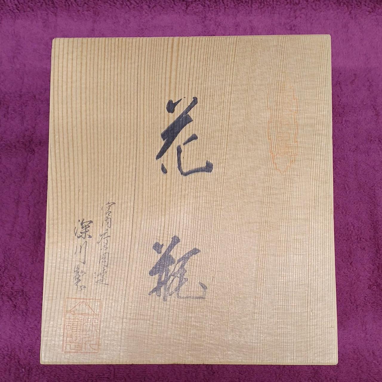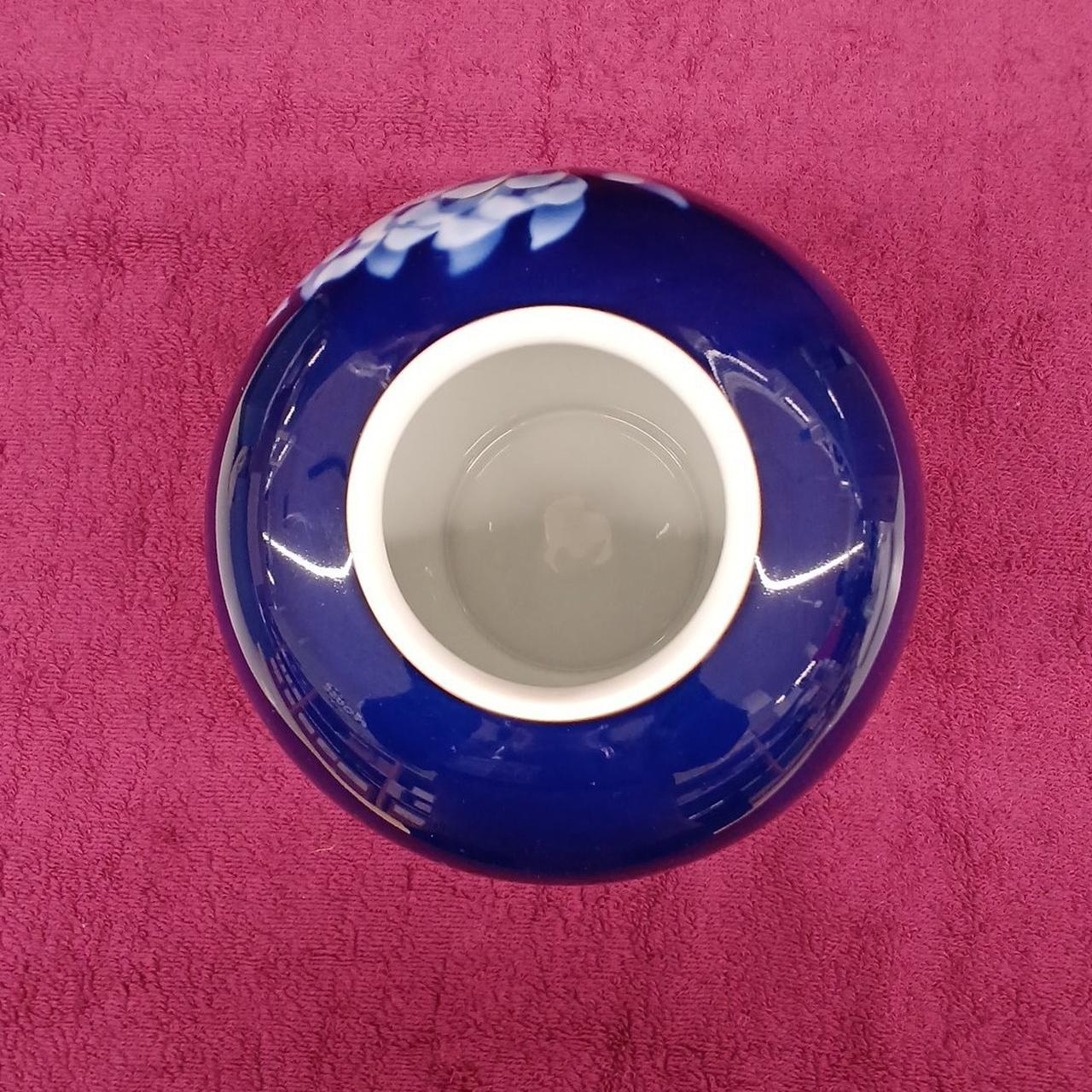 深いブルーとゴールドが美しい絵柄の花瓶です