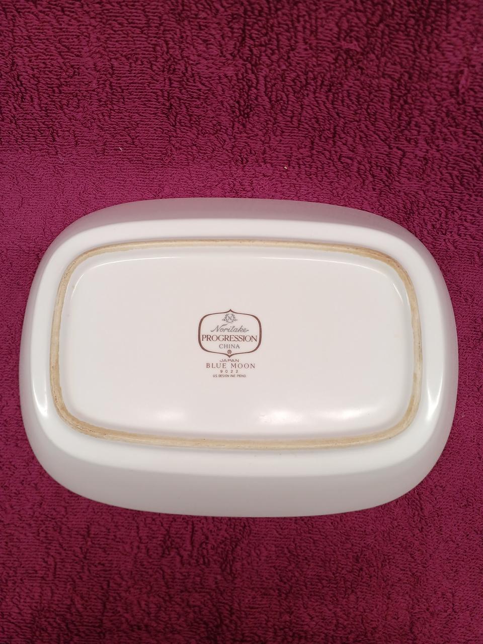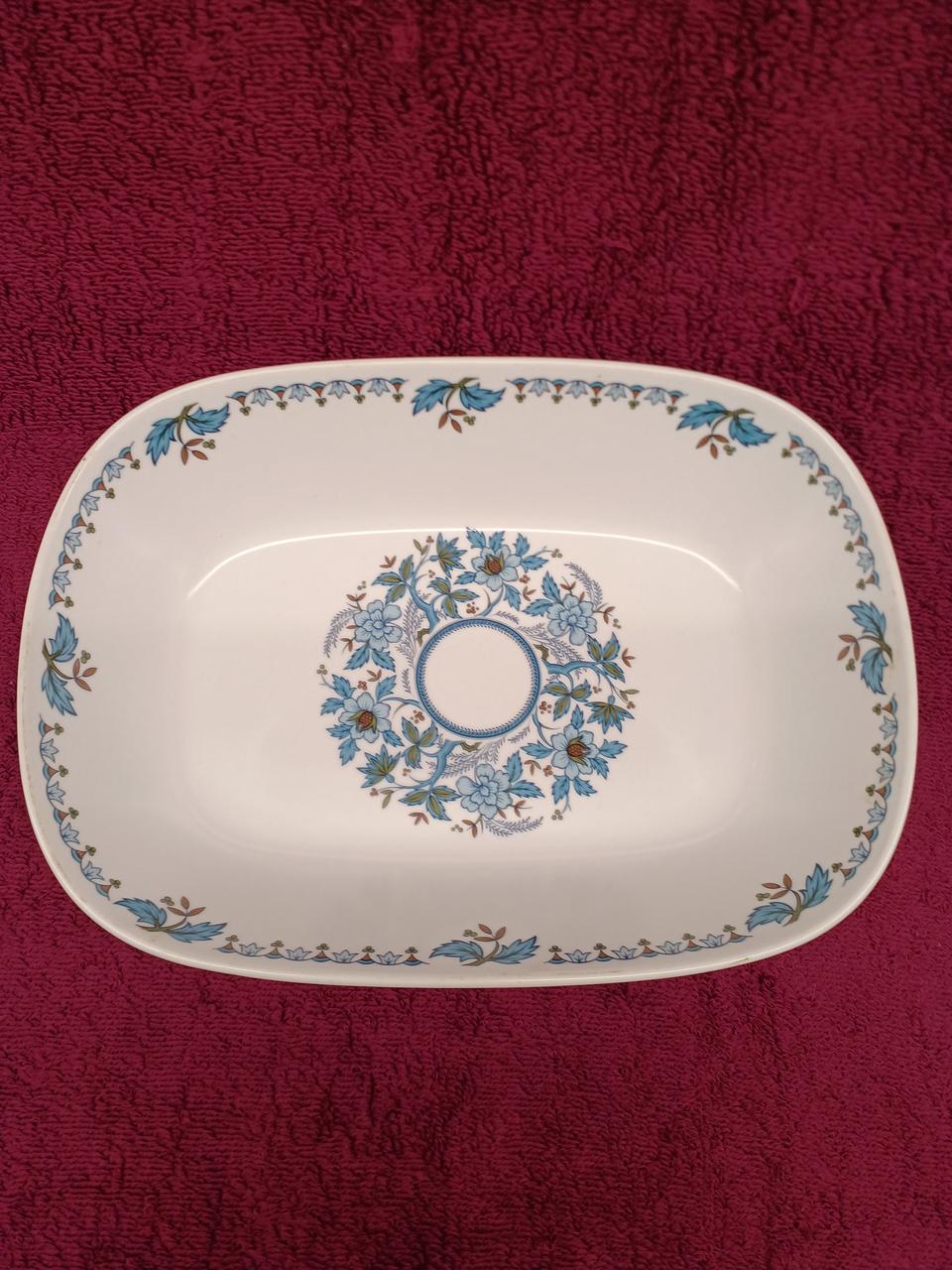 白い磁器(ポーセレン)に青い花と緑の多色デザインが施されています。