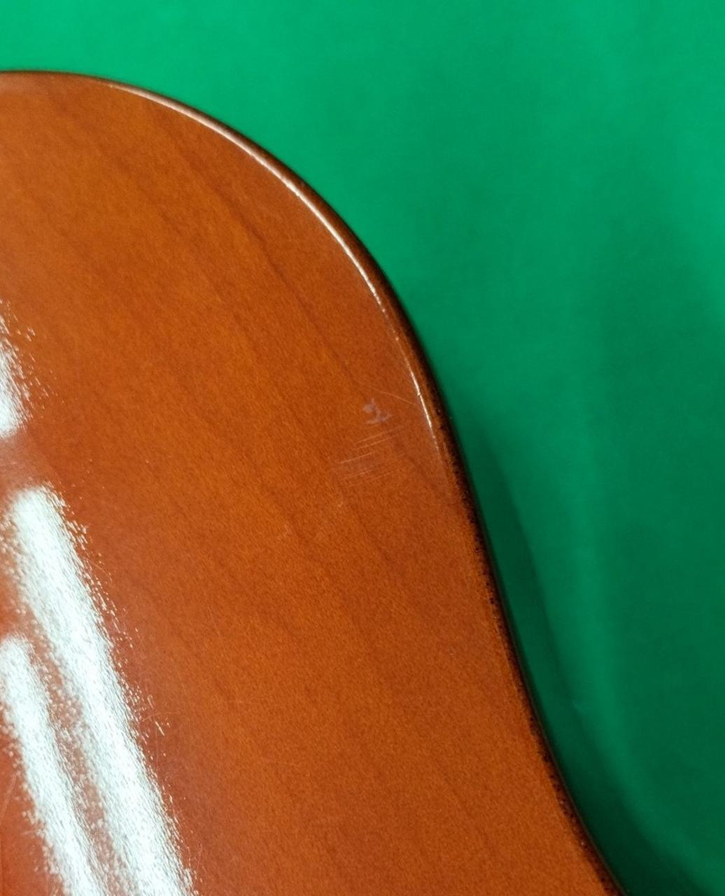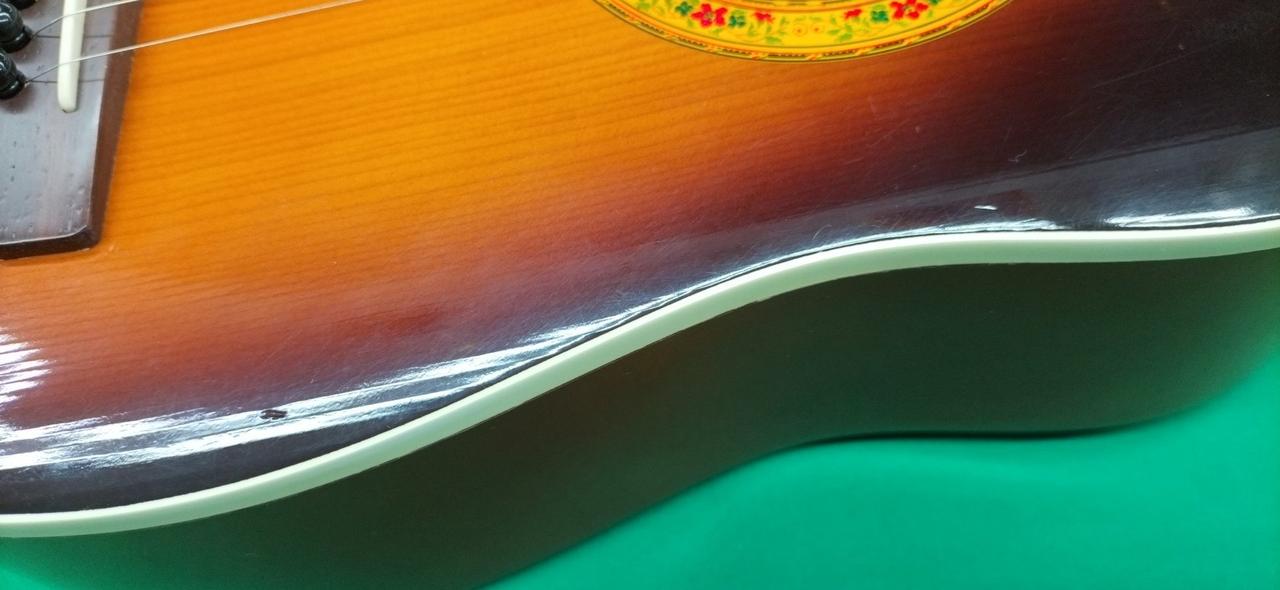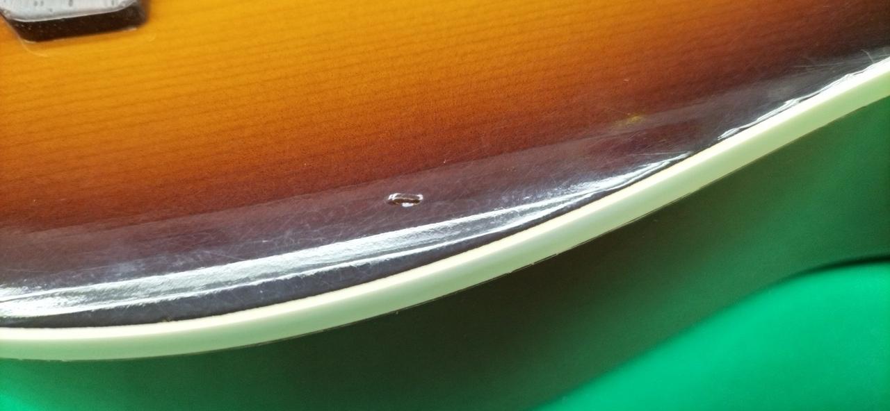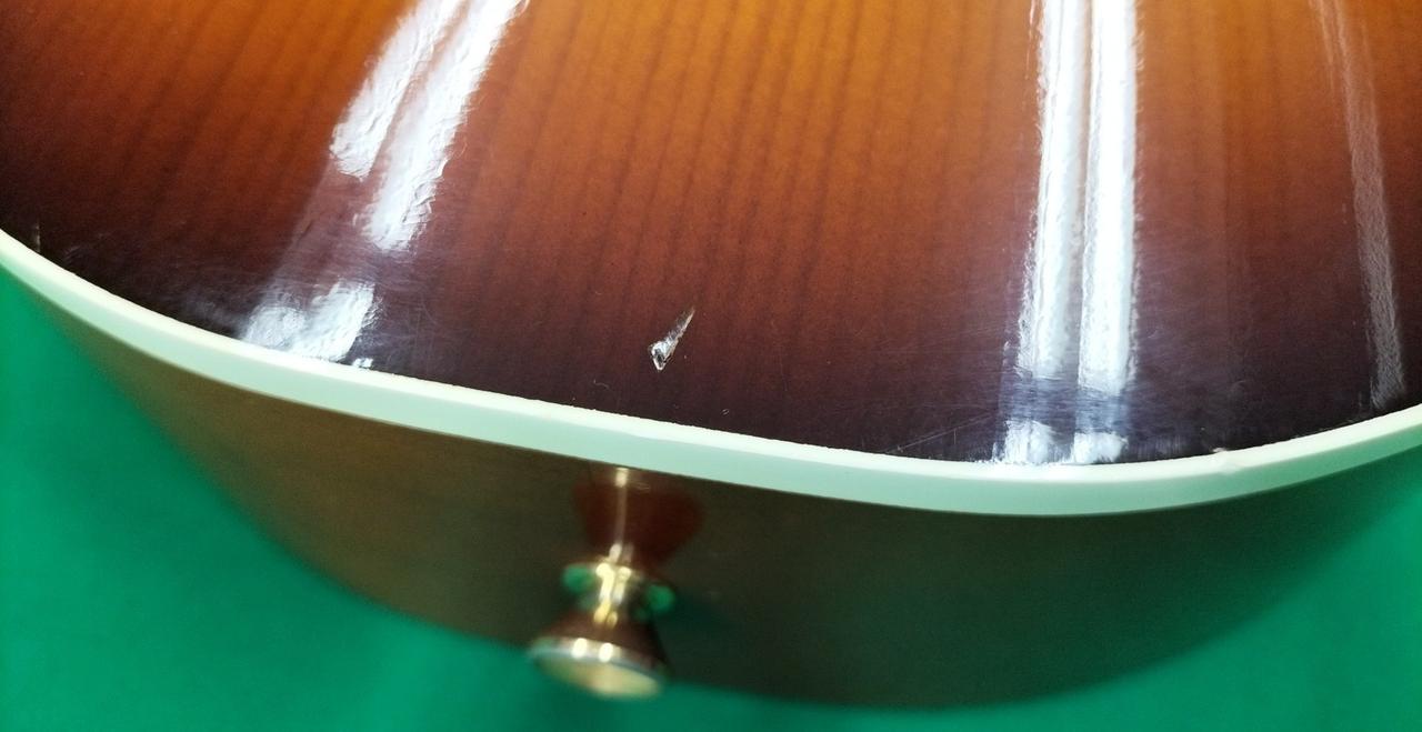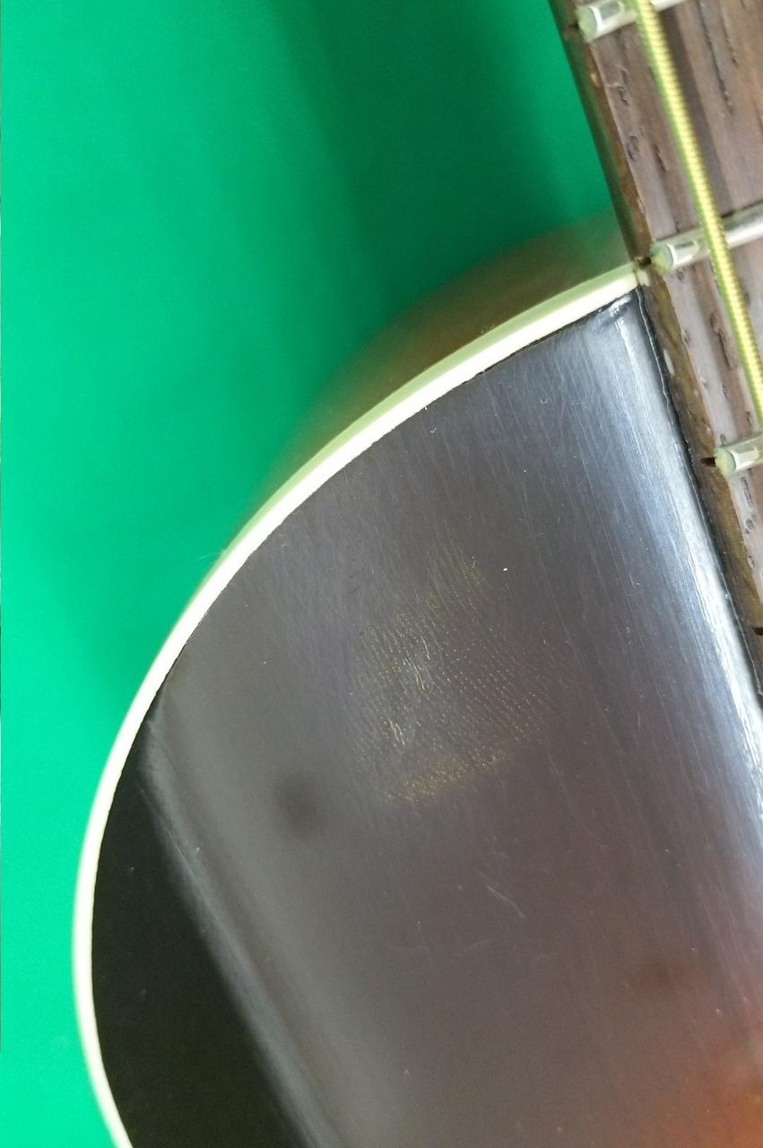 ボディトップ、サウンドホールとブリッジの間、若干へこみ。 |