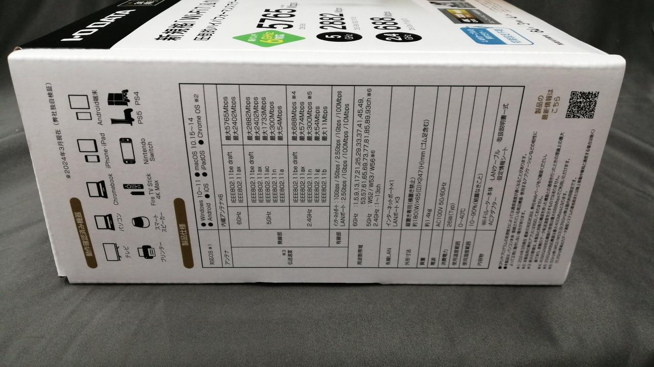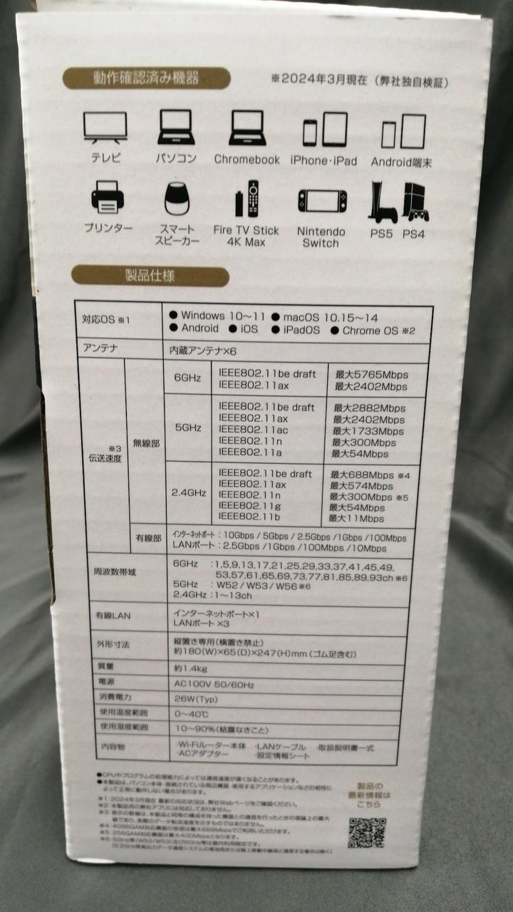 無線LAN規格:Wi-Fi 7 (11be) 接続環境:3階建て(戸建て)/4LDK(マンション)/64台 周波数:2.4/5/6GHz IPv6:○ セキュリティ規格:WPA2/WPA3 |
