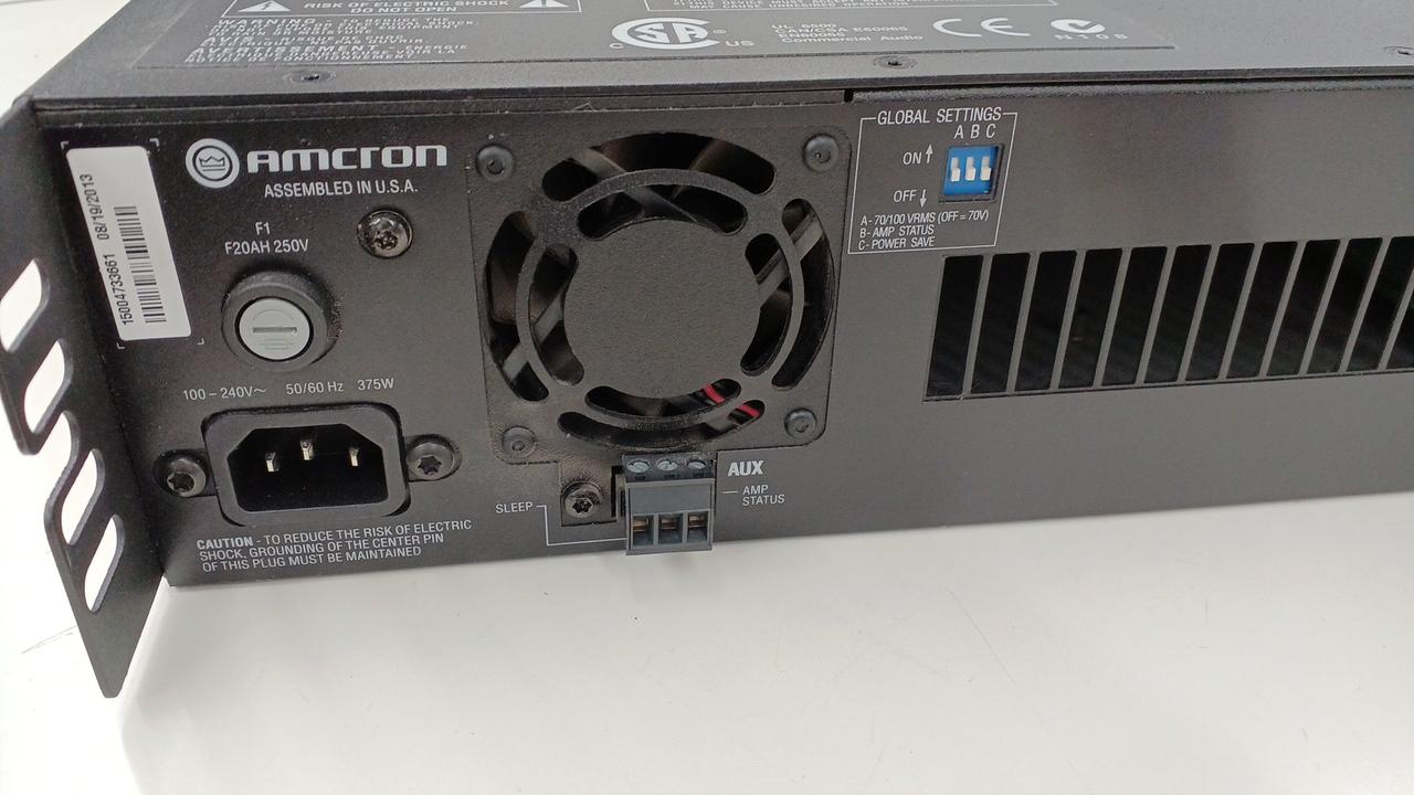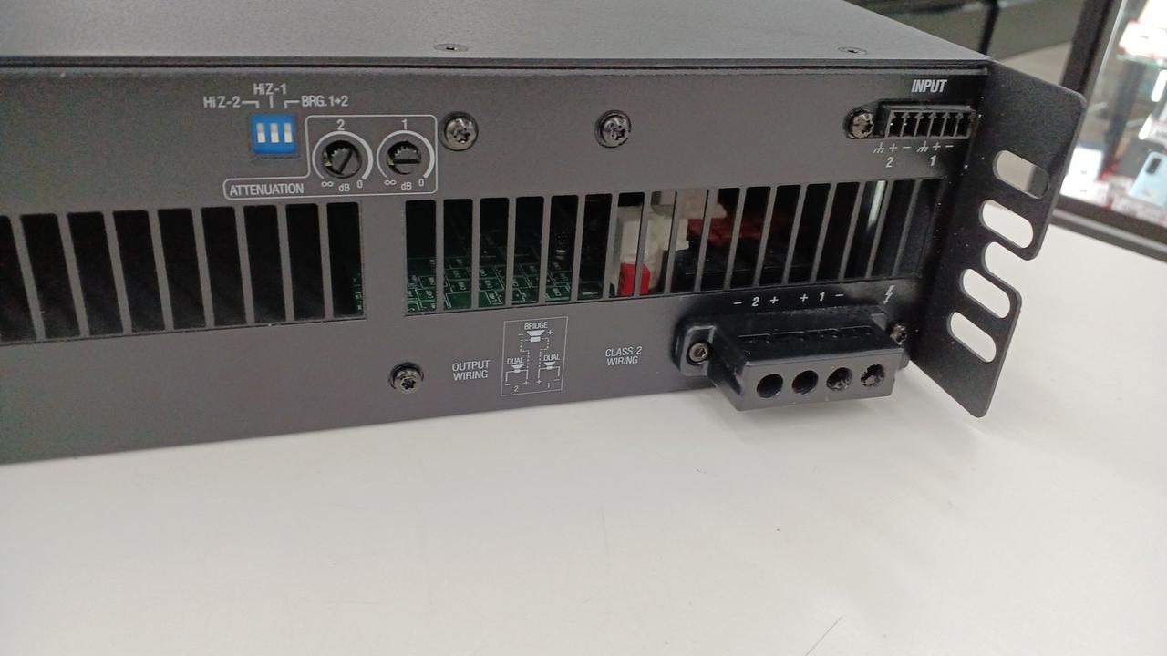 出力: チャンネルあたり300W 2Ω、4Ω、8Ω、16Ωの低インピーダンス接続、および70Vrms、100Vrms |